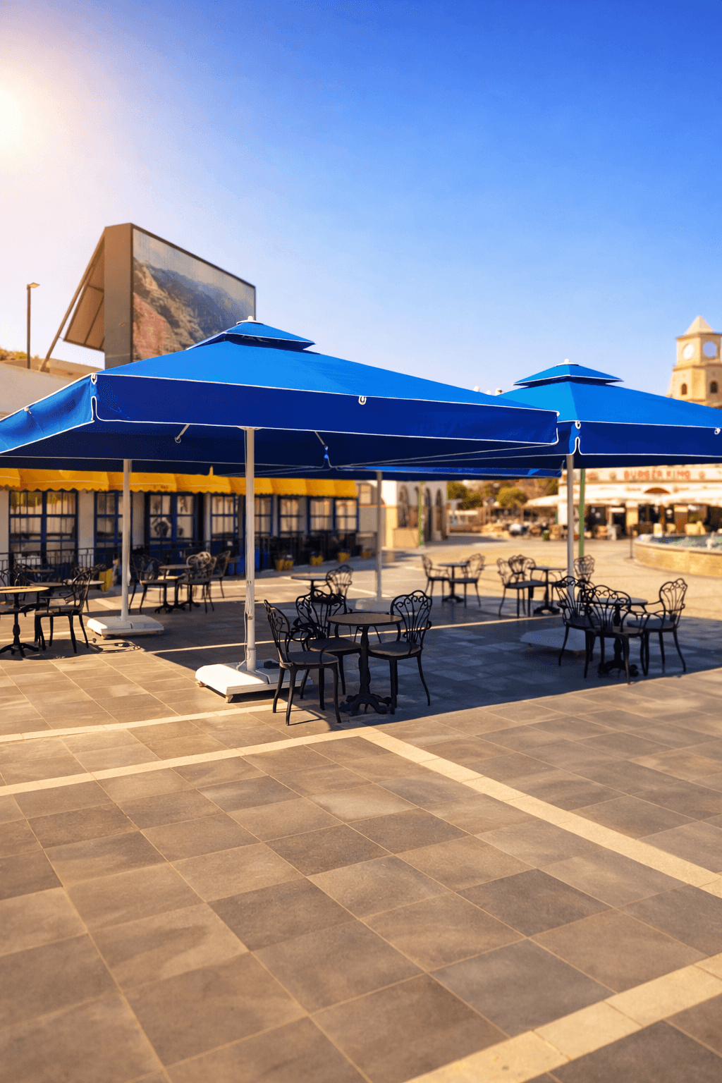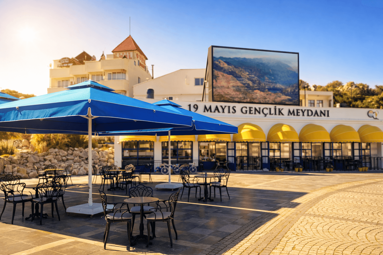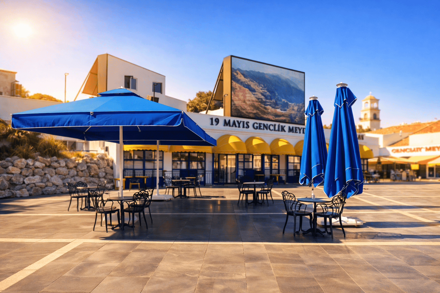 Marmaris Kent Meydanı’nın geniş ve açık dokusu içinde konumlanan Halk Cafe, yoğun yaya trafiği ve gün boyu süren kullanımıyla fonksiyonel bir gölgelendirme çözümü gerektiriyor. Meydan alanında tercih edilen 70 Serisi – 400×400 Kare Şemsiye, geniş kare formu sayesinde çoklu masa düzenlerini tek bir çatı altında toplayarak düzenli, ferah ve davetkâr bir oturma alanı oluşturuyor. Açık meydan koşullarında, güneşin farklı açılarından gelen ışığa karşı kesintisiz gölge konforu sunuyor.