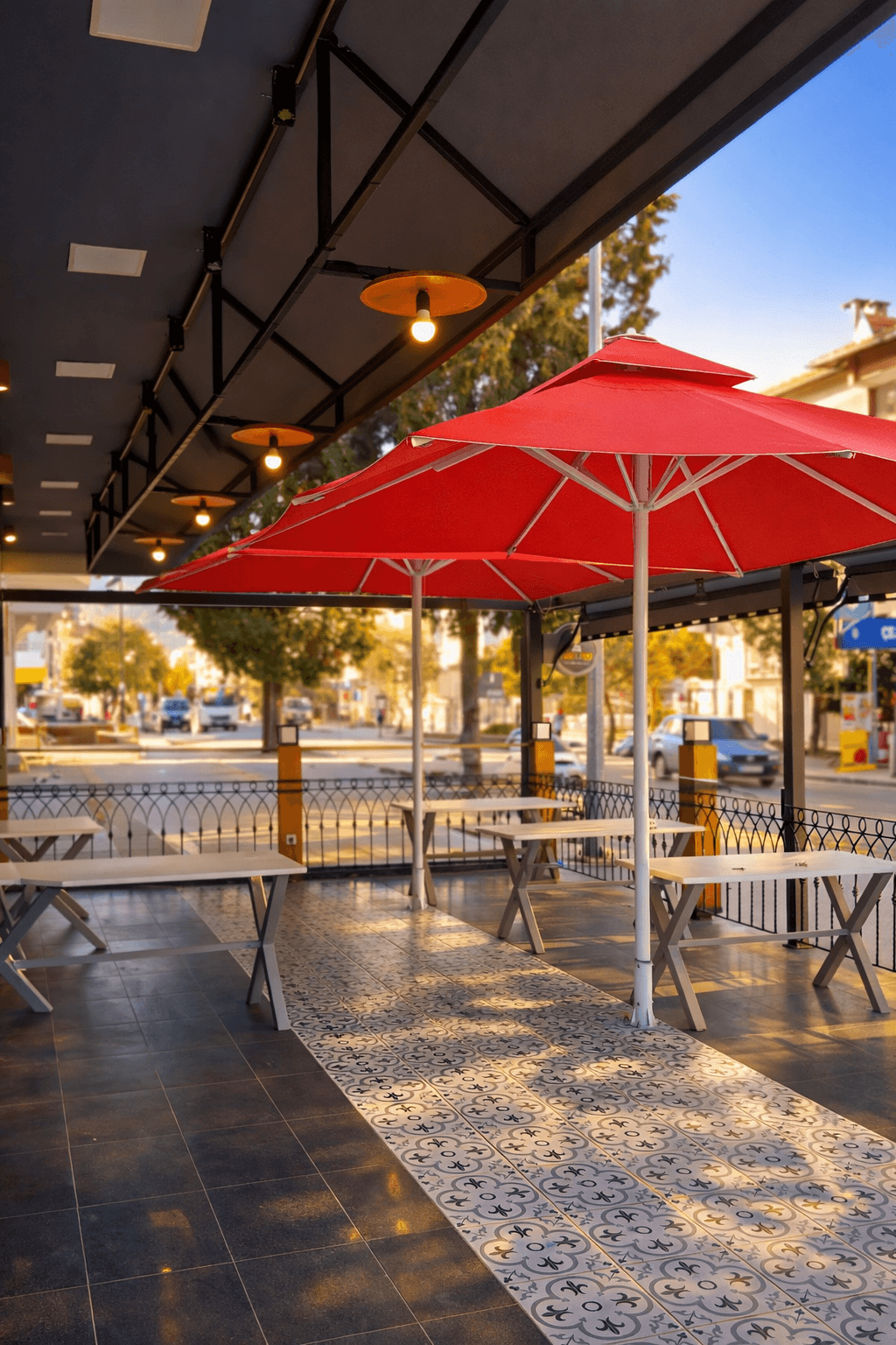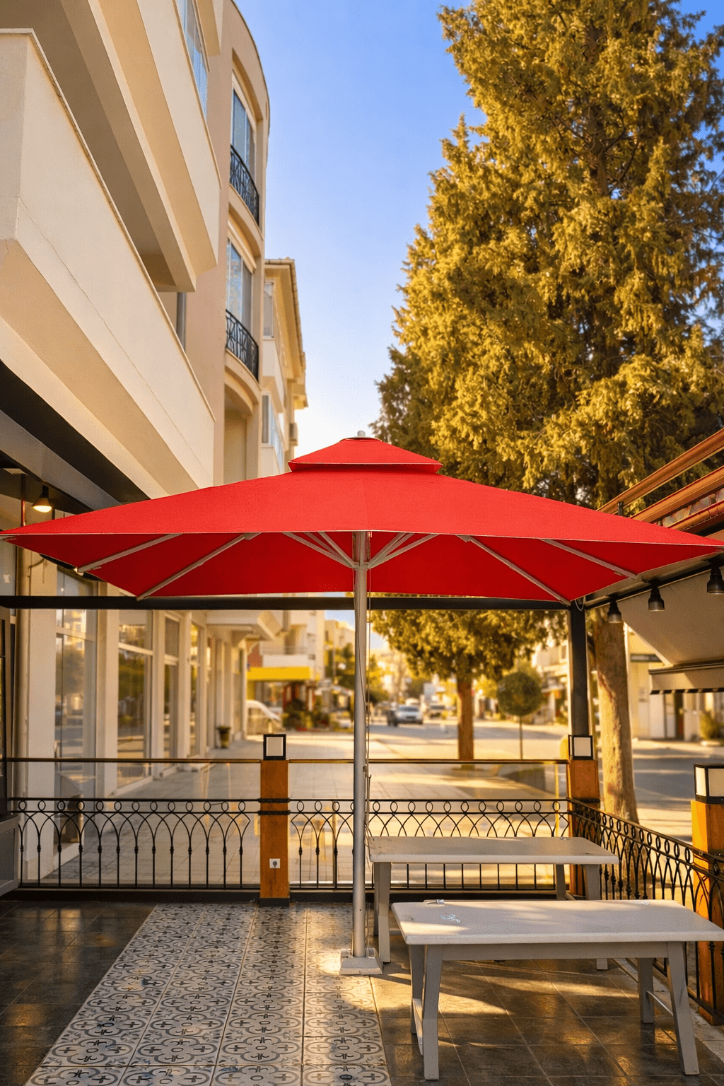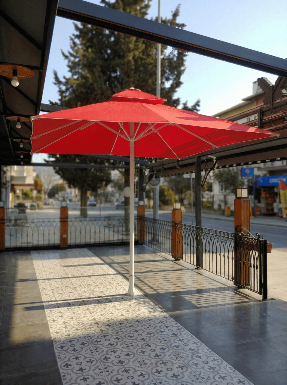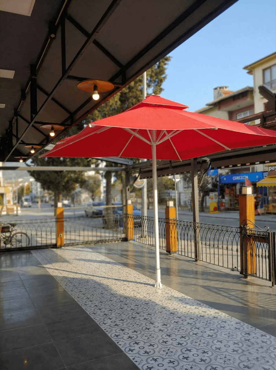 Marmaris’in şehir dokusu içinde konumlanan Hamurişi, caddeye açılan teras alanında hem konforlu hem de güçlü bir gölgelendirme çözümüyle açık alan kullanımını destekliyor. Mekânda tercih edilen 70 Serisi – 300×300 Kare Şemsiye, geniş kare formu sayesinde masa düzenini tek bir çatı altında toplayarak gün boyu dengeli ve kapsayıcı bir gölge alanı oluşturuyor. Kare form, teras mimarisiyle uyumlu bir bütünlük sağlayarak düzenli ve net bir yerleşim sunuyor.
