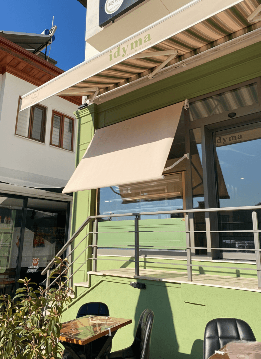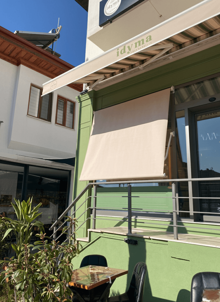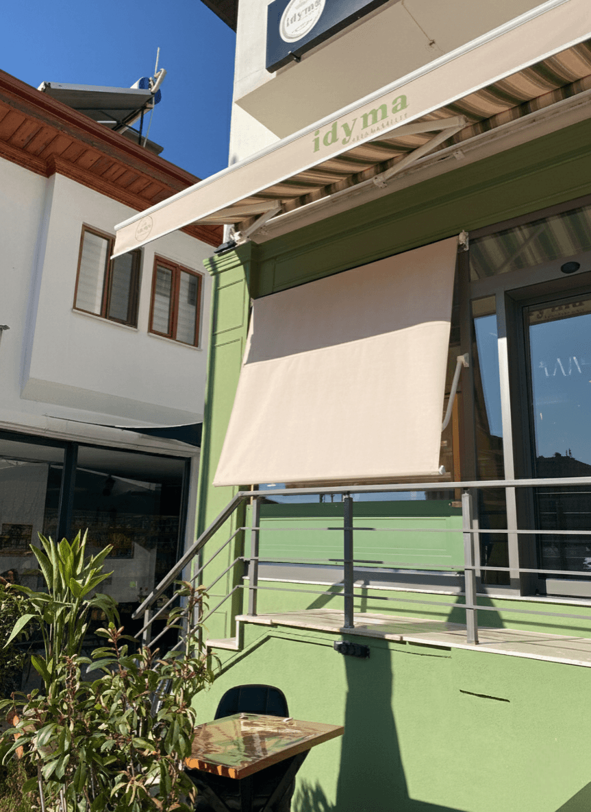 Muğla Akyaka’ nın sevilen lezzet duraklarından biri olan İdyma Unlu Mamuller için, hem ürünlerin tazeliğini güneşin direkt etkisinden koruyan hem de cepheye estetik bir hava katan Pente (EKO Model) projemizi tamamladık. Akyaka’nın geleneksel dokusuyla modern işletme anlayışını buluşturan bu projede, dikey gölgeleme ihtiyacına en pratik yanıtı veren sistemimizi kullandık. İdyma projesinde Selçuk Tente kalitesiyle öne çıkan detaylar şunlardır: