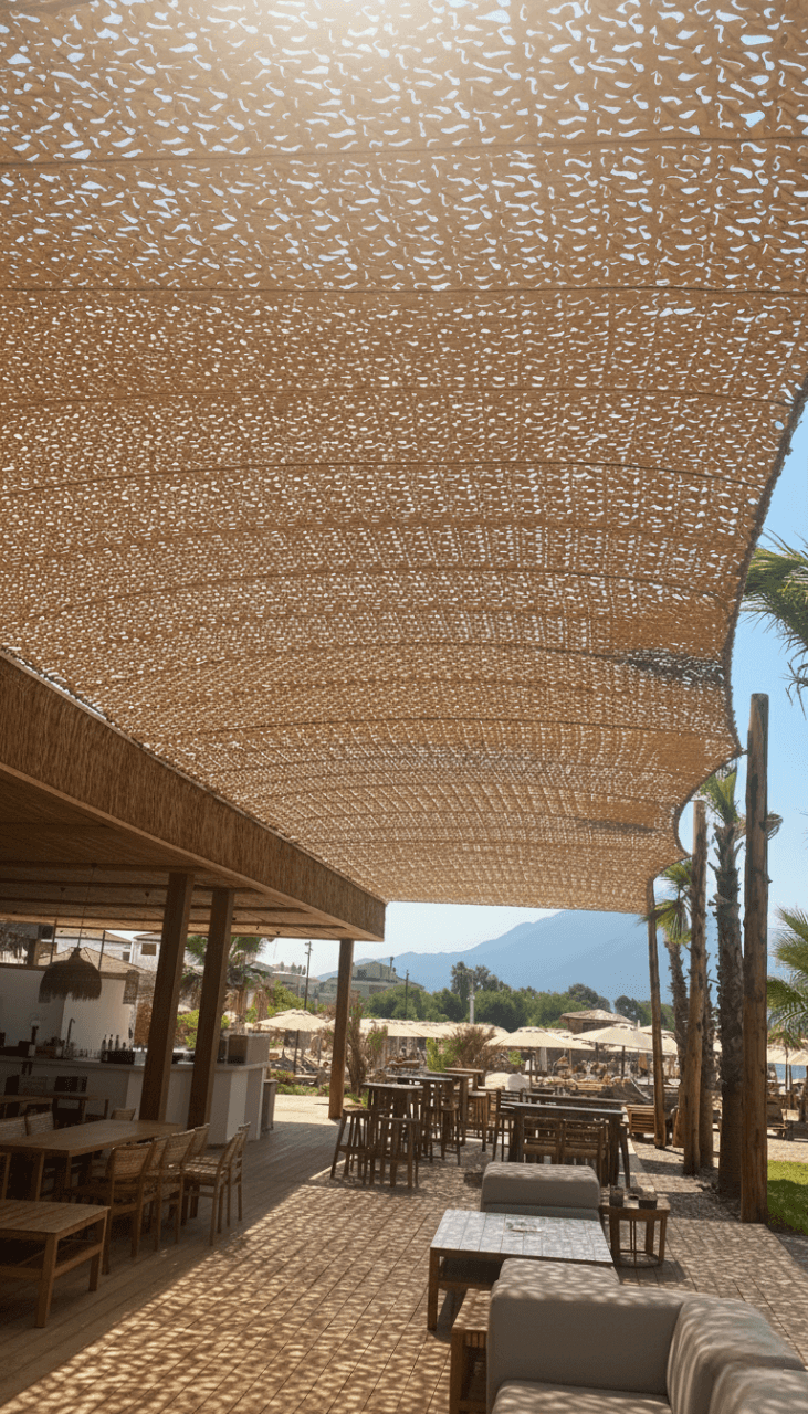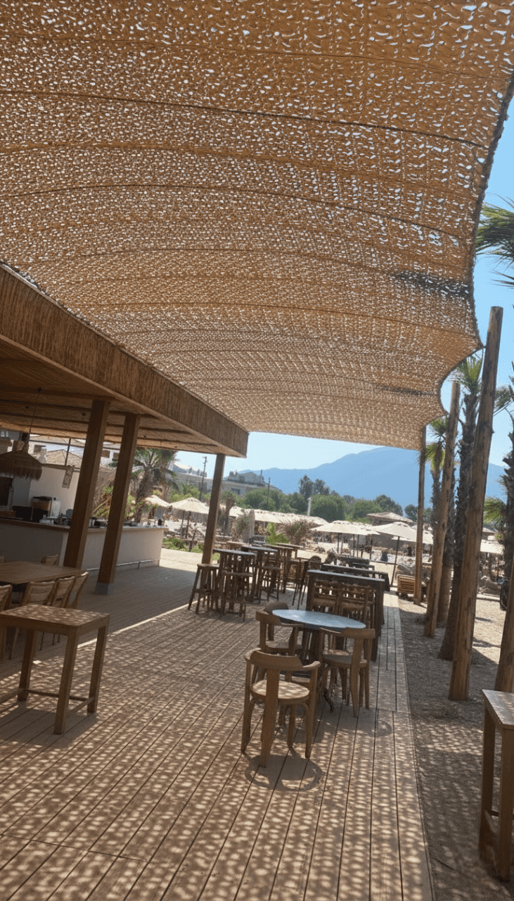 Fethiye Çalış Plajı mevkiinde, doğayla iç içe lüks bir konaklama deneyimi sunan Jiva Beach Resort için konfor ve estetiği birleştiren bir çözüm sunduk. Otelin geniş dış mekan sosyal alanlarını, Sabit Tente yapısına entegre ettiğimiz Kamuflaj Tente ürünümüzle ferah bir yaşam alanına dönüştürdük. Fethiye’ nin yakıcı güneşini filtreleyen ancak ferahlığını kesmeyen lazer teknolojili "S" gözenekler, rüzgarın kumaş içinden akışını sağlayarak sistem ömrünü uzatır ve yırtılma riskini ortadan kaldırır. Tamamen kapalı tavan sistemlerinin aksine bu model, misafirlere nefes alan, gölge desenlerinin zeminde dans ettiği şık bir atmosfer sağlar. Sistemin dayanıklılığı, özel radansa bağlantıları ve güçlendirilmiş dikiş tekniklerimizle yapılandırılmıştır. Kurulum işlemleri; radansalı, vidalamalı ve çelik halat bağlama ile gerdirmeli montaj yöntemlerimizle yapılarak, her türlü hava koşuluna karşı dirençli bir dış mekan alanı oluşturulmuştur.