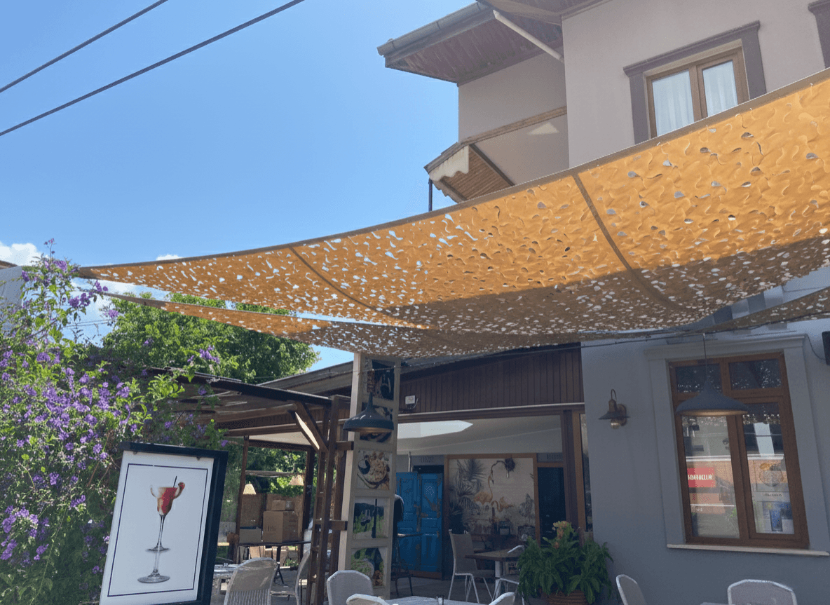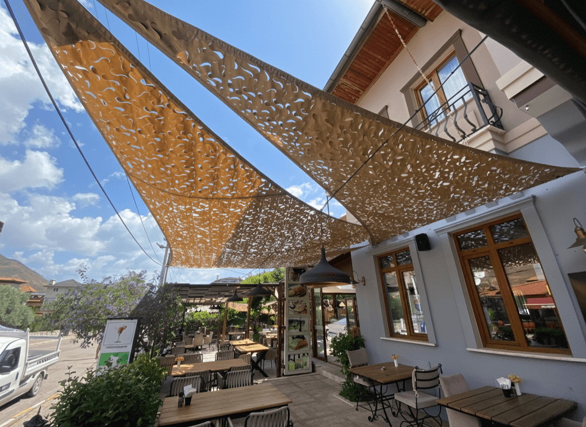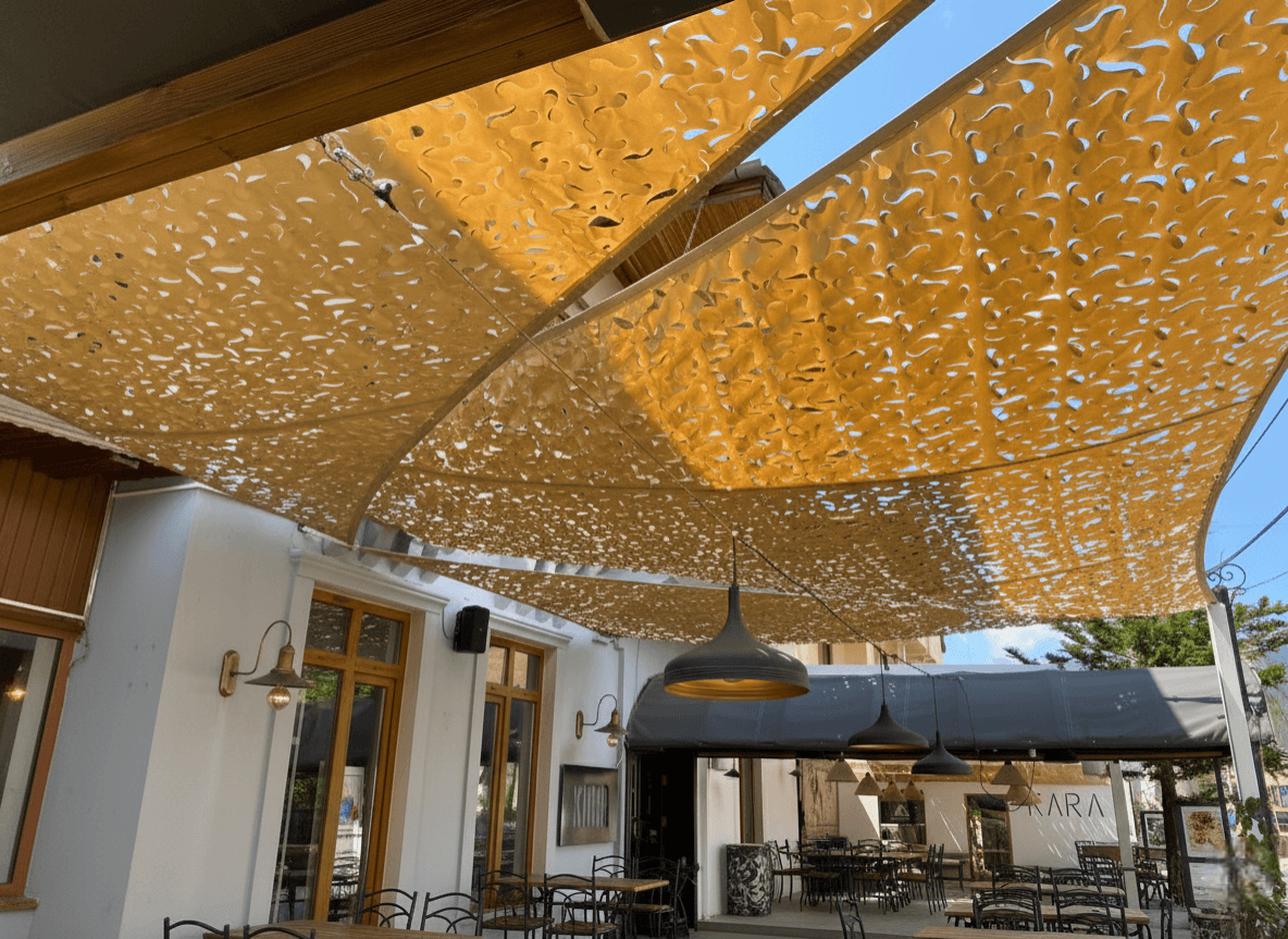 Marmaris’ in dinamik mekanlarından Kara Restaurant’ın dış mekan kullanım alanlarını, mimari birer odak noktasına dönüştürdük. İşletmenin ruhuna uygun olarak seçilen Yarasa Tente sistemi, kullanılan kamuflaj kumaş detayıyla hem güneşten korunma hem de dekoratif bir derinlik sunmaktadır. Bu projede tercih edilen özel kesim kamuflaj kumaş, gün boyunca yarattığı ışık ve gölge oyunlarıyla Kara Restaurant’ ın atmosferine modern ve sanatsal bir hava katmaktadır. Selçuk Tente olarak, bu estetik formu en yüksek malzeme kalitesiyle birleştirerek Marmaris’in sahil rüzgarlarına karşı dayanıklı hale getirdik. Kumaşın formunu koruması ve rüzgara karşı direncini artırması için tüm çevreye özel emniyet kolonu (şerit) diktik; bu sayede tentenin sarkmasını engelleyerek her daim gergin durmasını sağladık. Teknik mükemmelliğimizi, kumaşın en çok yük binen köşe noktalarında kullandığımız altlı- üstlü krom plakalar ile mühürledik. Kumaşı sandviç sistemiyle araya sıkıştıran bu paslanmaz krom parçalar, hem yırtılmaları önleyerek uzun ömürlü bir kullanım sunmakta hem de işletmenin dekorasyonuna parlak ve şık bir detay kazandırmaktadır. Tamamen yazın keyfini çıkarmak ve güneşin yakıcı etkisini kırmak için tasarlanan bu uygulama, Kara Restaurant misafirlerine ferah bir gölge alanı sunmaktadır.