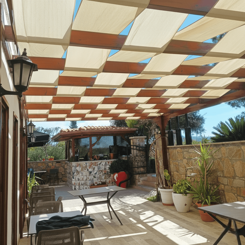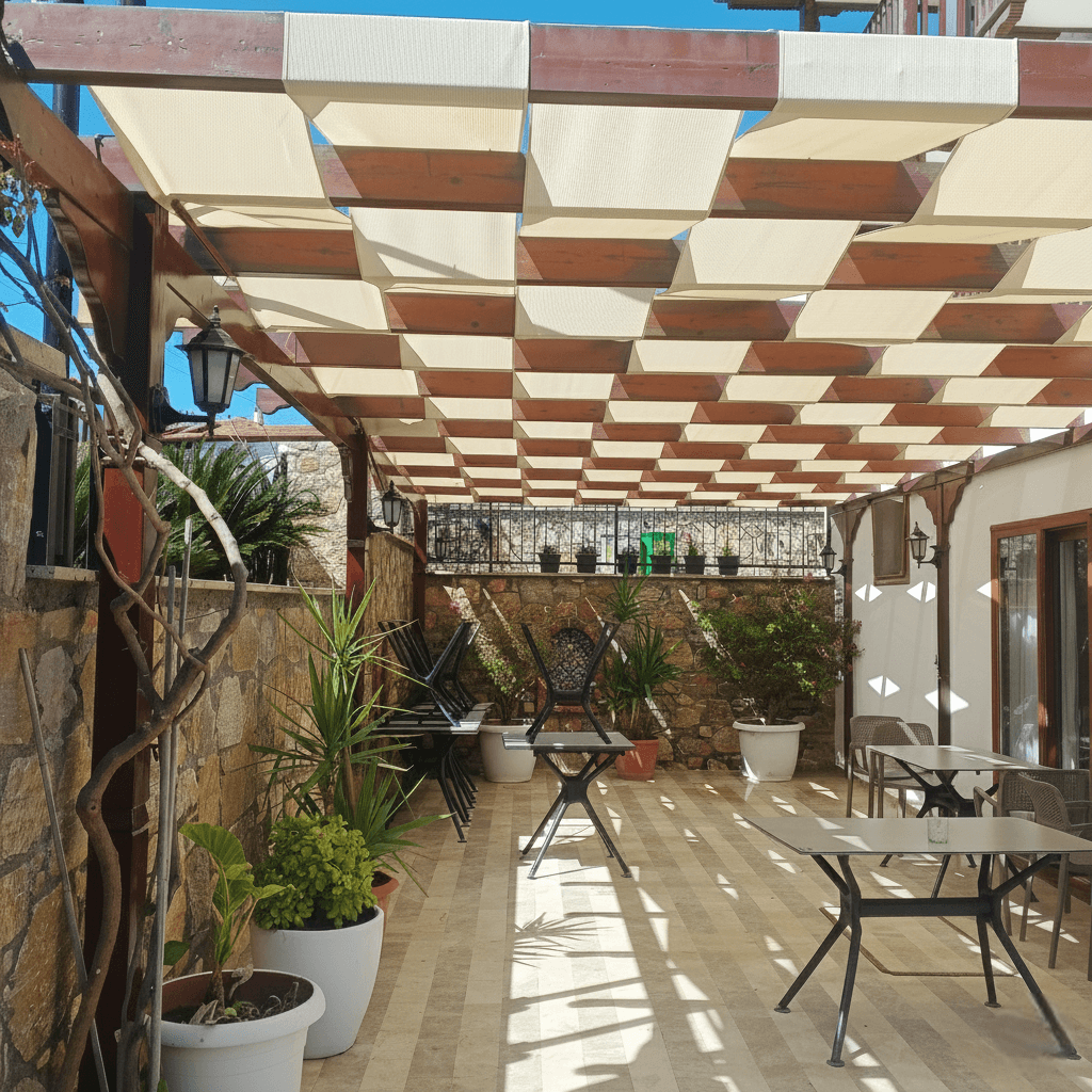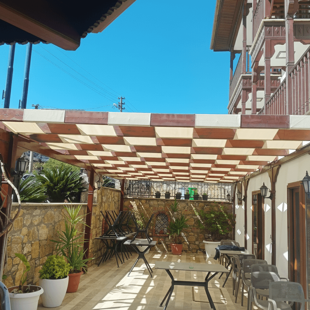 Akyaka’ nın geleneksel mimari dokusunu yansıtan ve Azmak Nehri’ nin huzuruna komşu olan Kaya Otel’ in dış mekan dinlenme alanları için, estetik ve işlevselliği birleştiren profesyonel bir çözüm sunduk. İşletmenin mevcut yapısı üzerine, bölgenin ruhuna ve mevsimsel ihtiyaçlarına en uygun düşen yazlık uygulama disiplinimizi hayata geçirdik. Akyaka’ nın hiç kesilmeyen ferahlatıcı esintisini içeri davet etmek ve güneşin yakıcı etkisini kontrol altına almak adına, hava sirkülasyonuna izin veren delikli yapılı jüt kumaş tercih ettik. Mekana dekoratif bir tavan derinliği katan ve sektörde "battı/çıktı tente", "sarhoş tente" veya "alttan üstten tente" olarak bilinen parçalı/bantlı “sabit tente” uygulama tekniğini kullandık. Bu yazlık konseptin en büyük avantajı, kumaş yapısının suyu süzmesi sayesinde yüzeyde su birikme riski taşımamasıdır; bu sayede konstrüksiyona tamamen düz ve yatay bir düzlemde, eğim gerektirmeden güvenle uygulanabilmiştir.