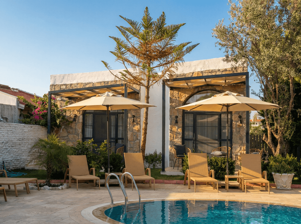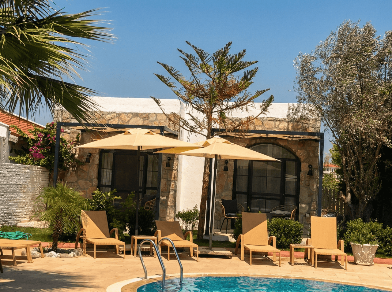 Datça’nın yalın mimarisi ve doğal dokusuyla bütünleşen Kaya Otel’de kullanılan 50 Serisi 200x200 Kare Şemsiye, açık alanlarda konforlu gölgelendirme sağlarken mekânın sakin ve dengeli atmosferini tamamlar.