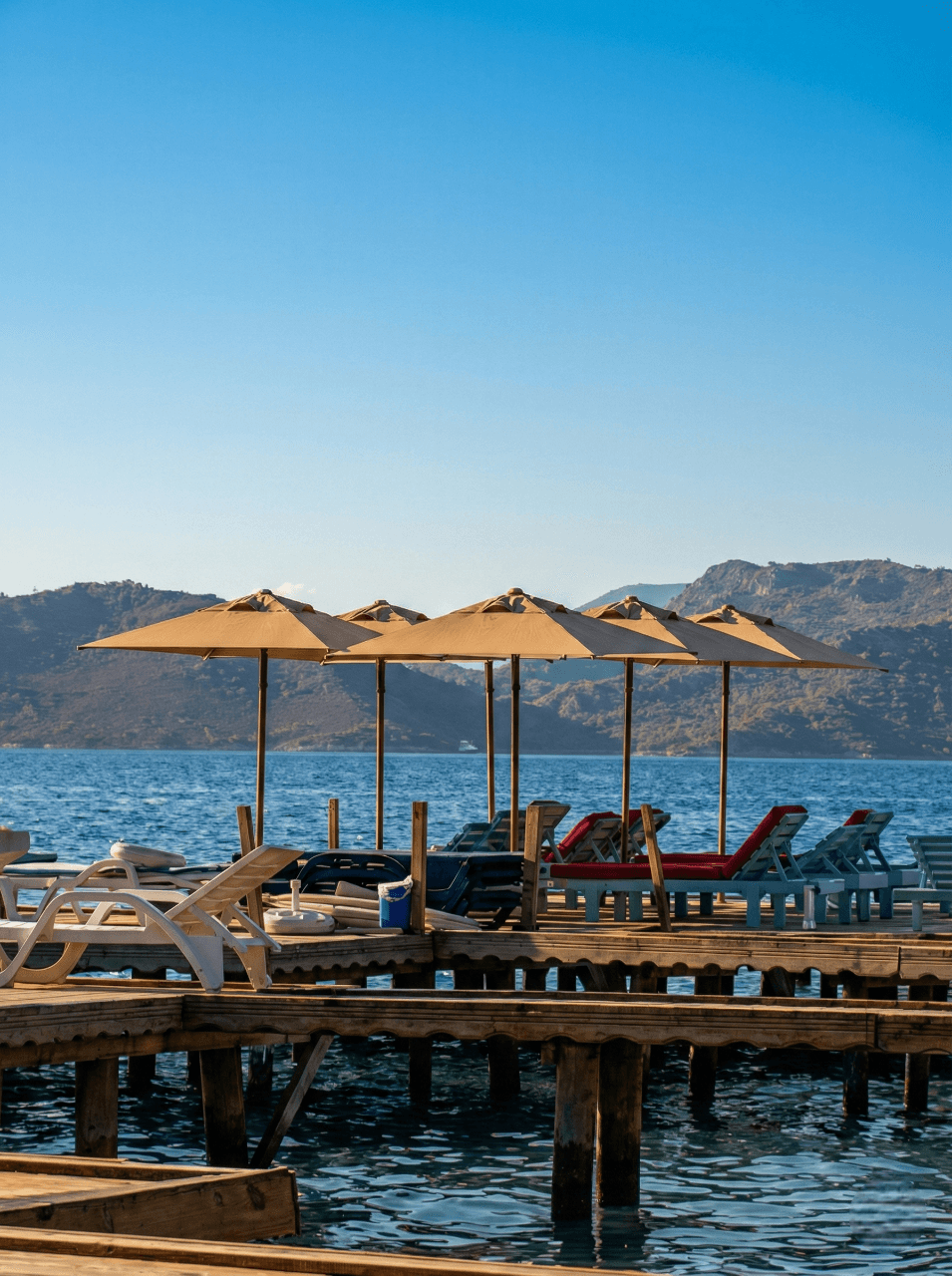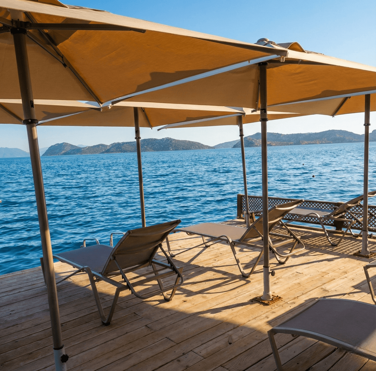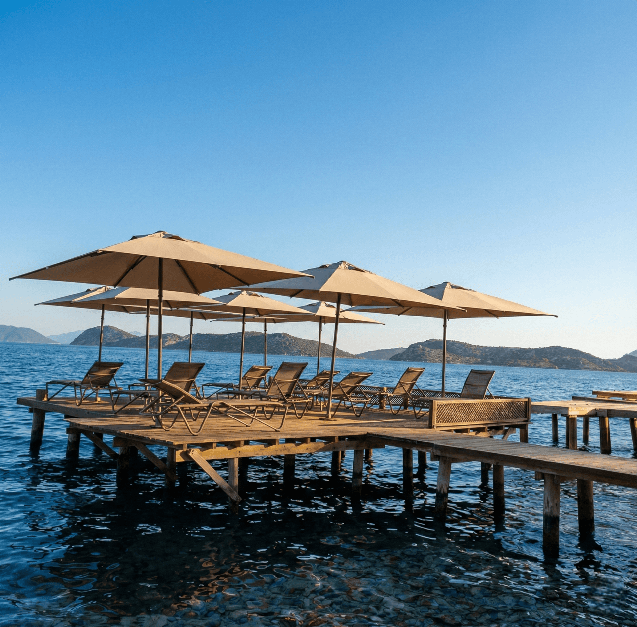 Denize yakın konumlanan Kumsal Evleri’nde kullanılan 50 Serisi 200x200 Kare Şemsiye, özel konut alanlarında hem estetik hem de uzun süreli kullanım avantajı sunan ideal bir gölgelendirme çözümüdür.