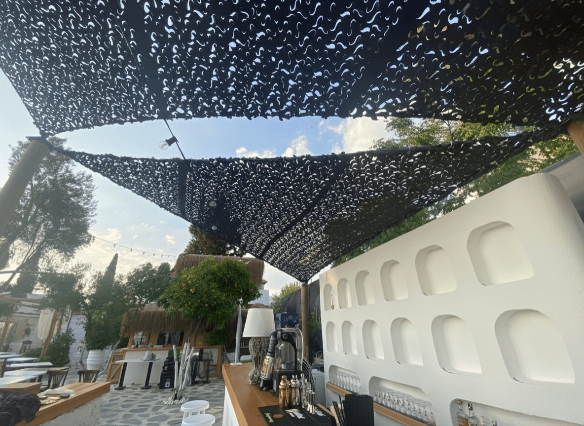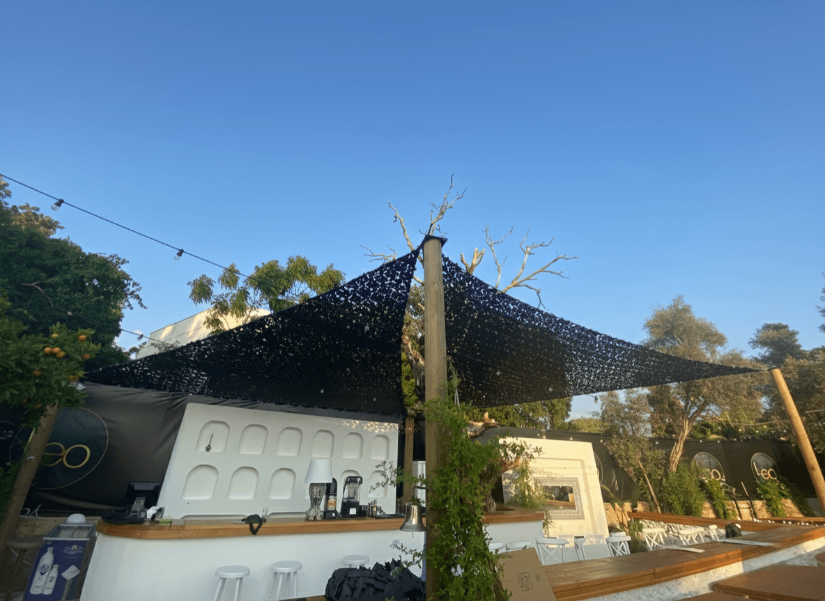 Ege’ nin kalbi Bodrum’da, şıklığın ve prestijin simgesi olan Leo’ nun dış mekan alanlarını, mimari birer şahesere dönüştürdük. İşletmenin modern ve seçkin atmosferini tamamlamak amacıyla, dekoratif gölgelendirme çözümlerimizin en estetik formu olan Yarasa Tente sistemimizi, kamuflaj kumaş tercihiyle hayata geçirdik. Bu projede kullanılan antrasit kamuflaj kumaş, Bodrum’un parlayan güneşi altında yarattığı ışık ve gölge oyunlarıyla Leo’ ya benzersiz bir görsel derinlik katmaktadır. Selçuk Tente kalite farkıyla kurgulanan bu tasarım, sadece bir gölge alanı sunmakla kalmayıp, mekana sanatsal bir tavan estetiği kazandırmıştır. Teknik açıdan Bodrum’un meşhur rüzgar yükü ve açık hava şartları dikkate alınarak şu üst segment detaylar uygulanmıştır: