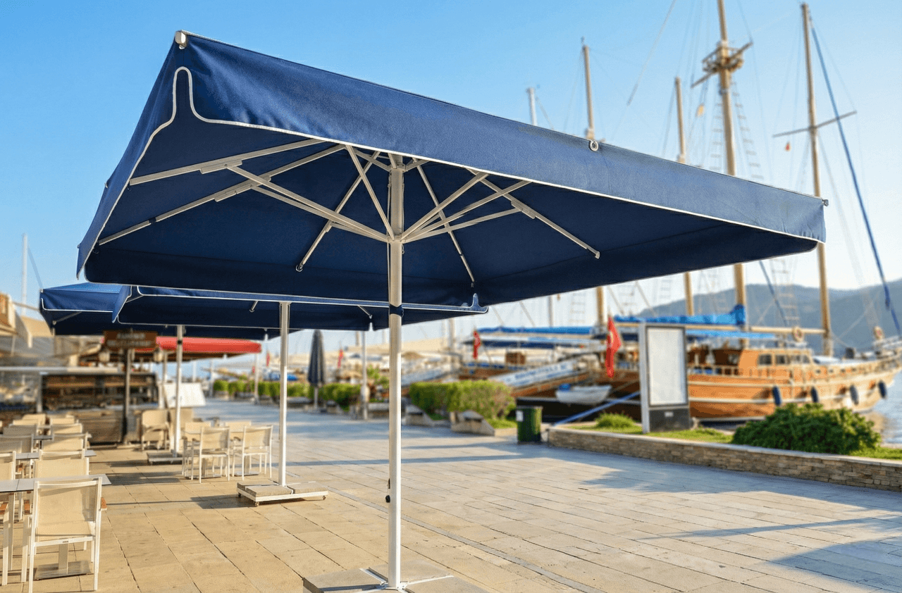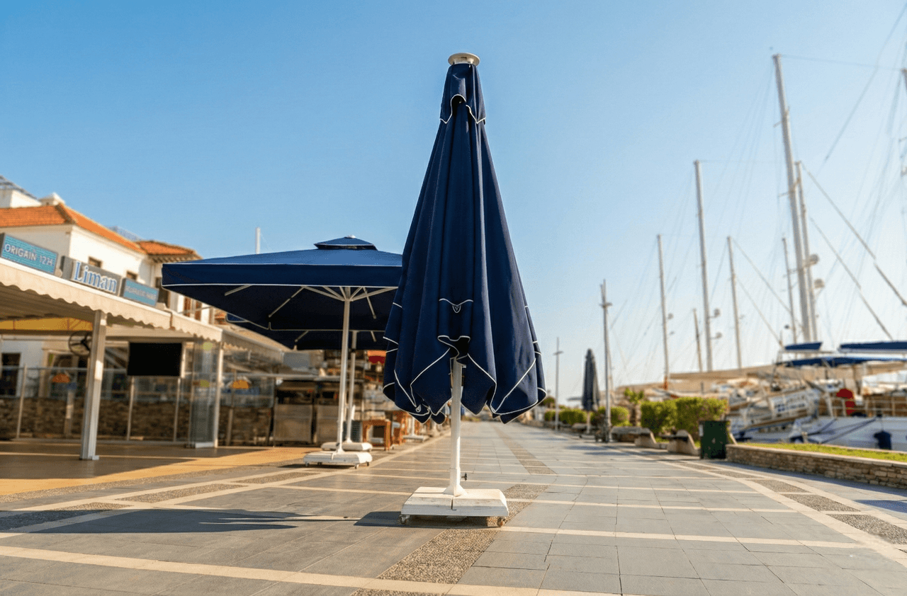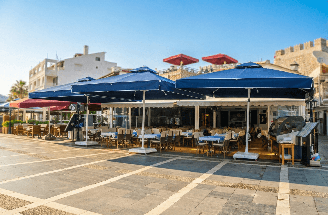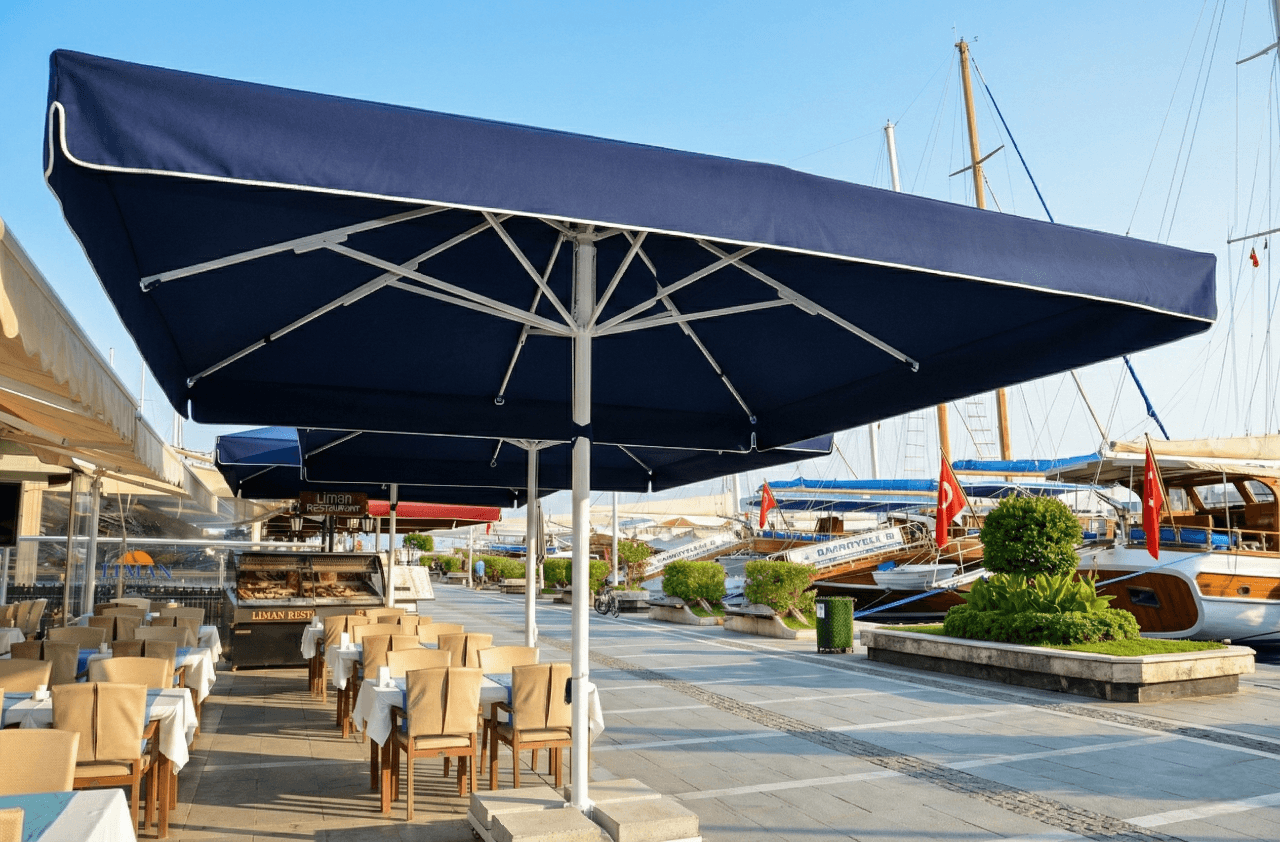 Bu projede tercih edilen Selçuk Tente 70 Serisi – 400×400 Kare Şemsiye, Liman Restaurant’ ın Marmaris’ teki sahil ve meydan konseptiyle uyum içinde; geniş alan kapsaması, servis konforu ve uzun ömürlü performansı bir arada sunar.