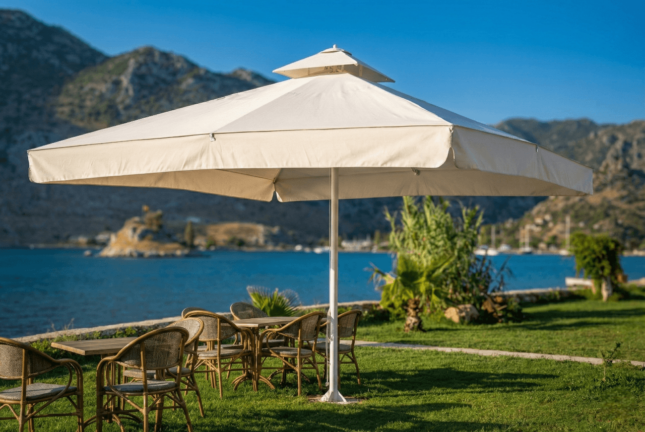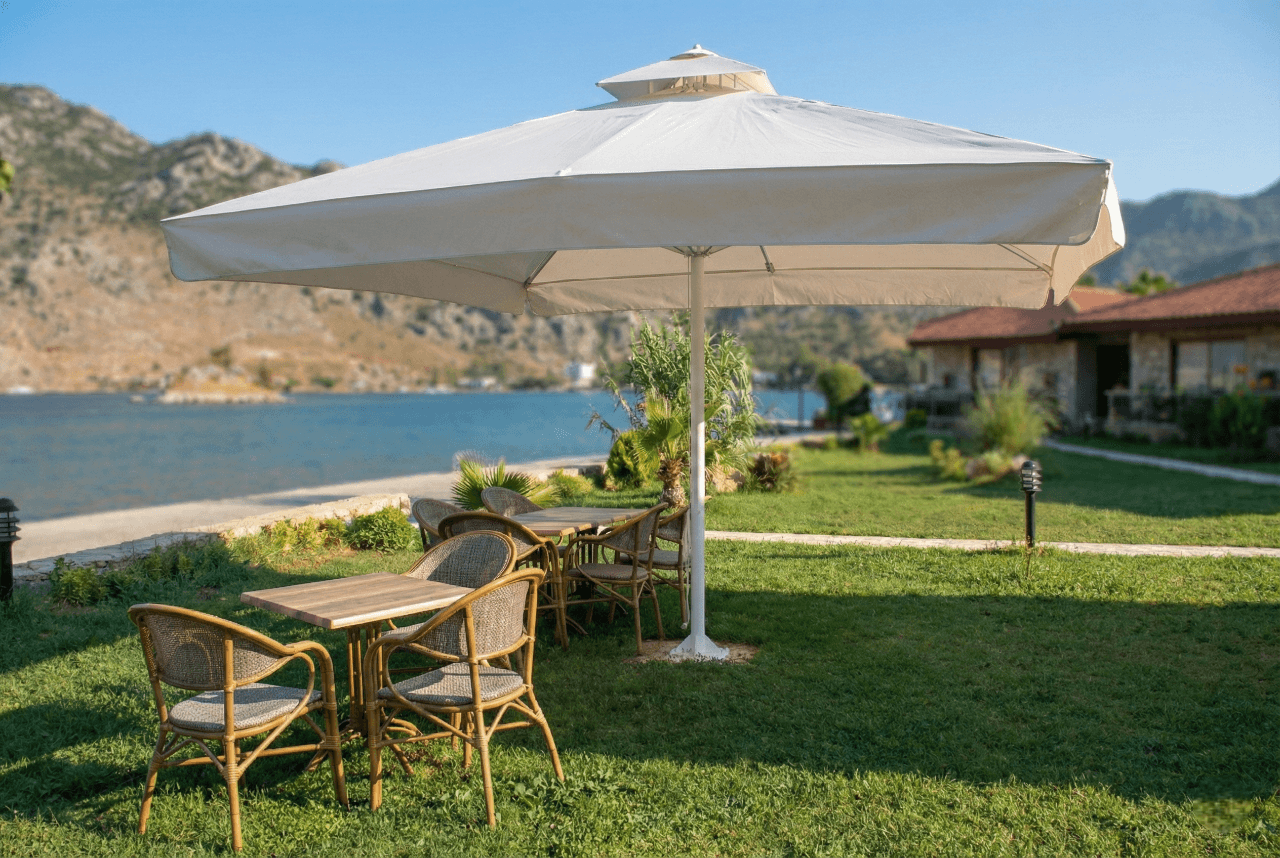 Bu projede tercih edilen Selçuk Tente 70 Serisi – 400×400 Kare Şemsiye, Losta Otel’in Selimiye’deki sahil ve bahçe konseptiyle uyum içinde; geniş alan kapsaması, misafir konforu ve uzun ömürlü performansı bir arada sunar.