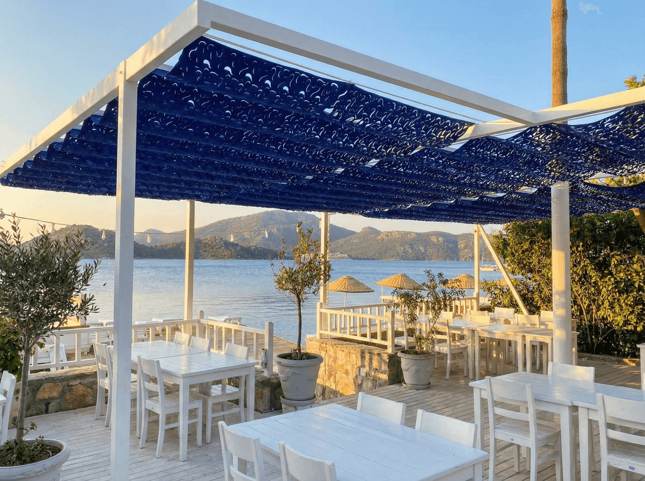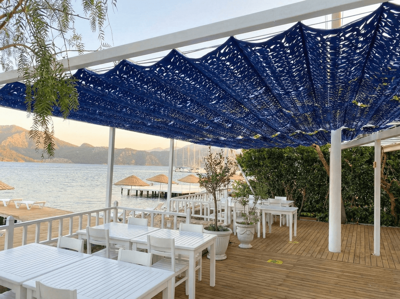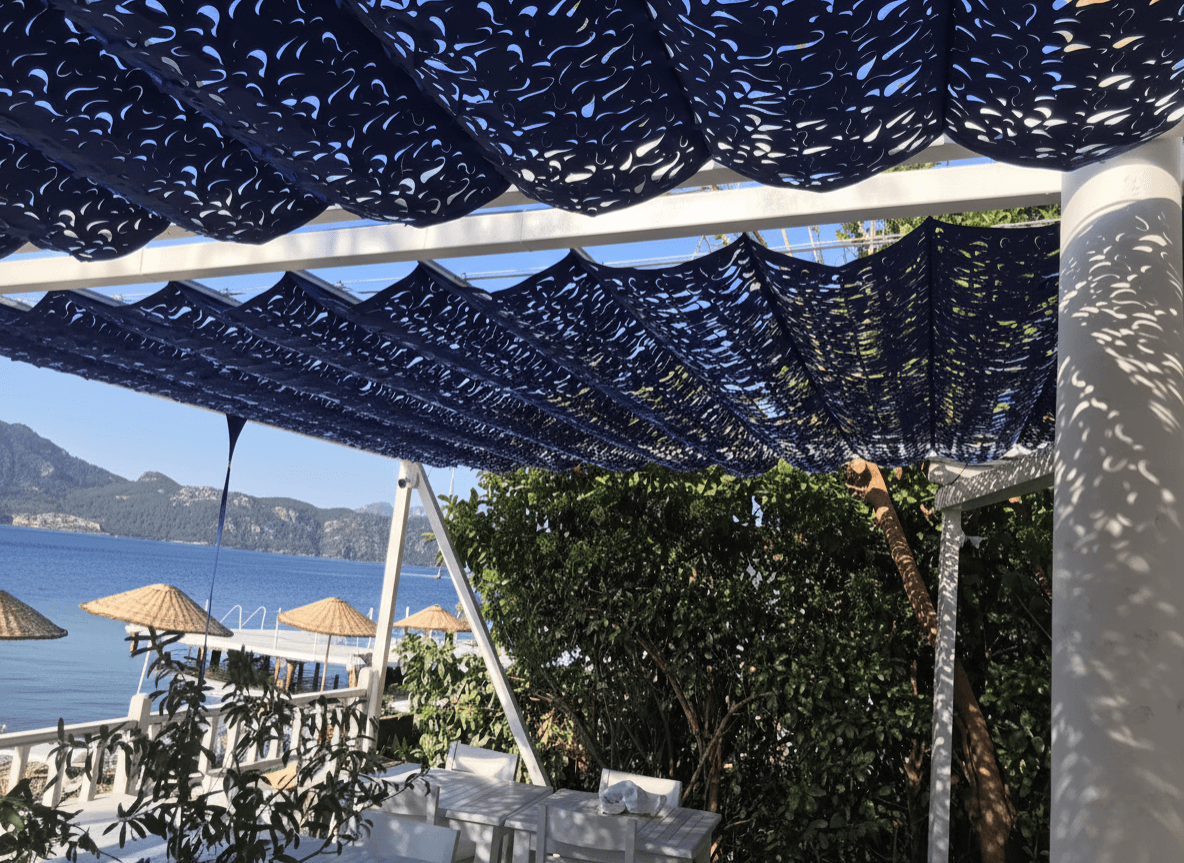Marmaris’in en sakin limanı Selimiye’ de, Luna Begonvil’ in begonvillerle süslü beyaz dünyasını Selçuk Tente’ nin marine ruhuyla buluşturduk. Denizin bittiği yerde başlayan bu konfor alanı, Telli Tente Sistemi’ nin zarafetiyle taçlanıyor. Bu özel sahil projemizde, Selimiye’ nin duru maviliğine uyum sağlaması için CNC Kesim Lacivert Kamuflaj Akrilik Kumaş tercih ettik. Krom halatlar üzerinde bir kuğu gibi süzülen sistemimiz, güneş ışınlarını bir deniz esintisi hafifliğinde filtreleyerek masalara masalsı gölge desenleri bırakıyor. Fotoğraflarda göreceğiniz o eşsiz gölge, otelin bembeyaz dekorasyonu ve ahşap iskele dokusuyla birleşince misafirlere huzur dolu bir Ege tablosu sunuyor.
