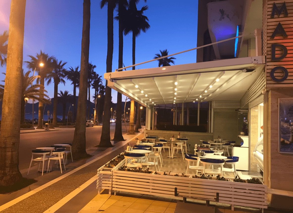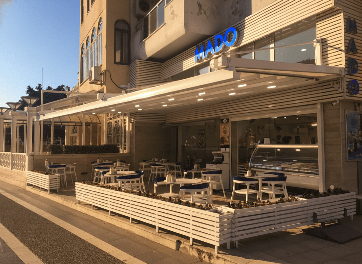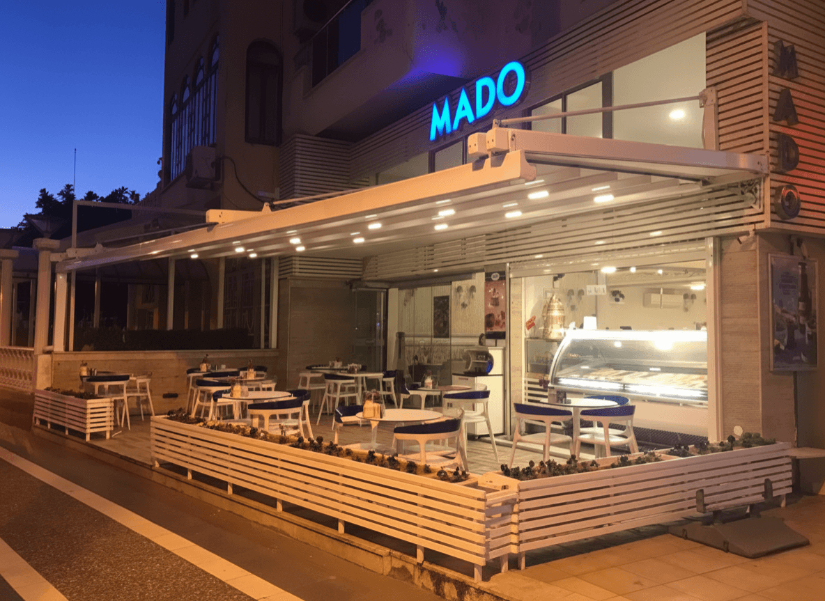 Marmaris sahil yolunun en sevilen mekanlarından biri olan Mado için, misafirlerin deniz manzarasını en konforlu şekilde deneyimleyebileceği Pergola (Raylı Tente Sistemi) projemizi hayata geçirdik. Mekanın prestijli kimliğine uygun olarak tasarladığımız bu sistem, Marmaris sahilinde dondurma keyfini dört mevsim boyunca kesintisiz bir ayrıcalığa dönüştürdü. Mado projesinde Selçuk Tente uzmanlığıyla öne çıkan "özel" detaylar şunlardır: