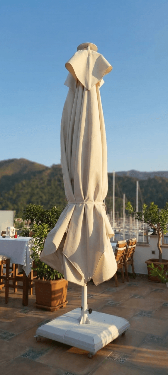 70 mm çapındaki güçlü orta borusu ve alüminyum taşıyıcı sistemiyle öne çıkan 70 Serisi, yoğun otel kullanımına uygun stabil duruş ve uzun ömürlü performans sunar. Teleskopik kapanma özelliği, şemsiyenin kapatılırken masa ve mobilyalara temas etmeden güvenle kullanılmasını sağlarken; palanga sistemli açma-kapama mekanizması, işletme ekibi için zahmetsiz ve kontrollü bir operasyon avantajı sunar. Sade ve güçlü tasarımı, Mets Otel’in modern dış mekân kurgusuyla uyum içinde tamamlayıcı bir rol üstlenir.