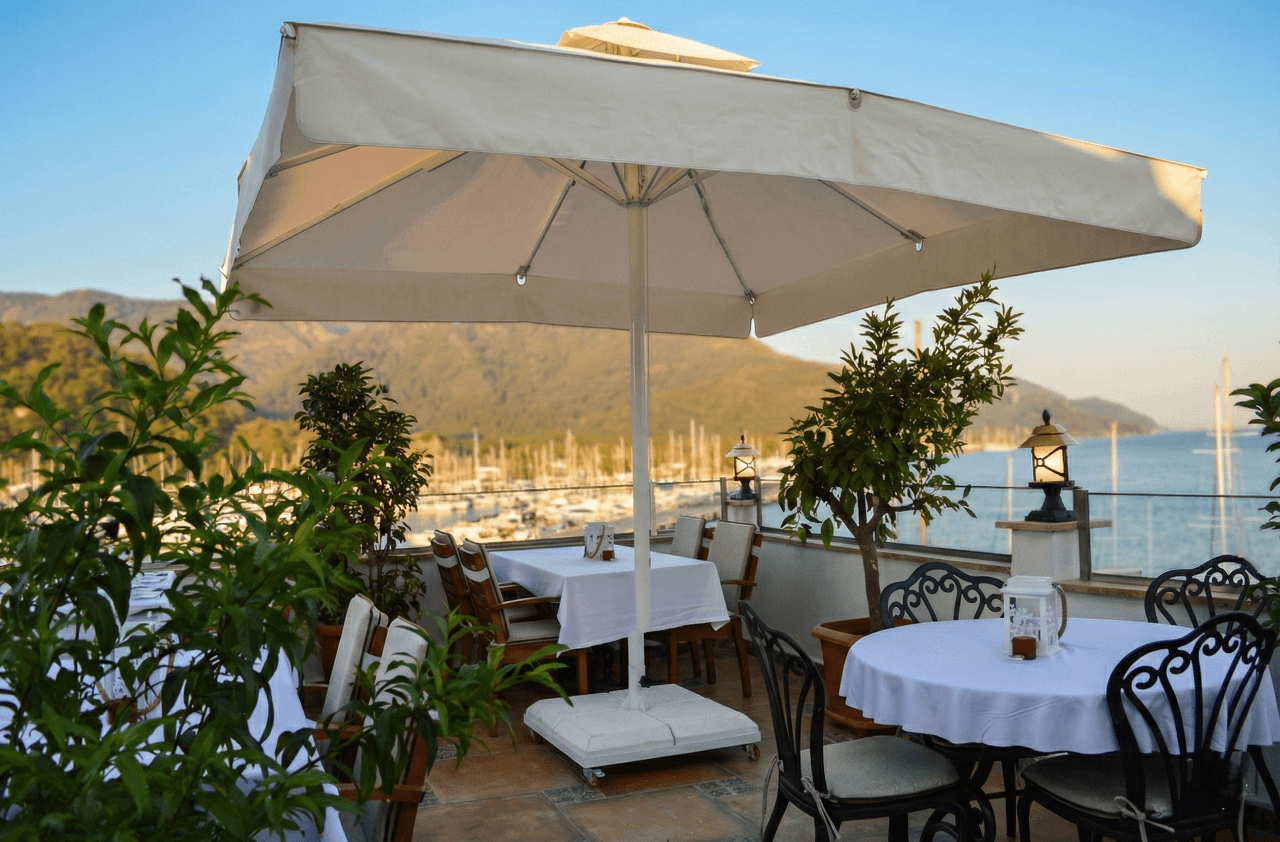 Marmaris’in sahil iklimine uyumlu konumlanan Mets Otel, açık alanlarında konforlu ve düzenli bir kullanım deneyimi sunmayı hedefler. Teras ve dinlenme alanlarında tercih edilen 70 Serisi – 400×400 Kare Şemsiye, geniş kare formu sayesinde birden fazla oturma grubunu tek bir gölgelendirme altında toplayarak ferah ve dengeli bir alan oluşturur. 400×400 ölçüsü, gün boyu değişen güneş açılarına karşı homojen gölge sağlayarak misafir konforunu artırır.