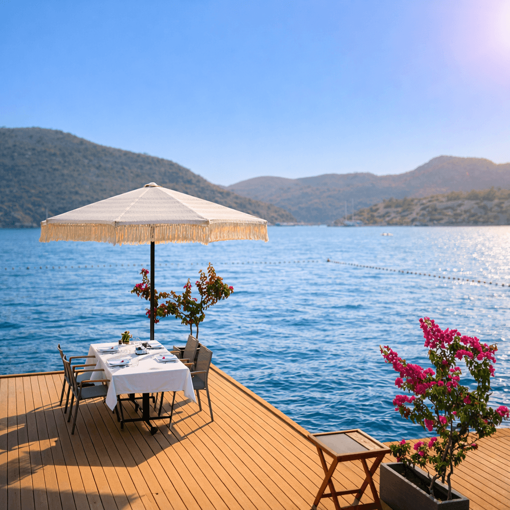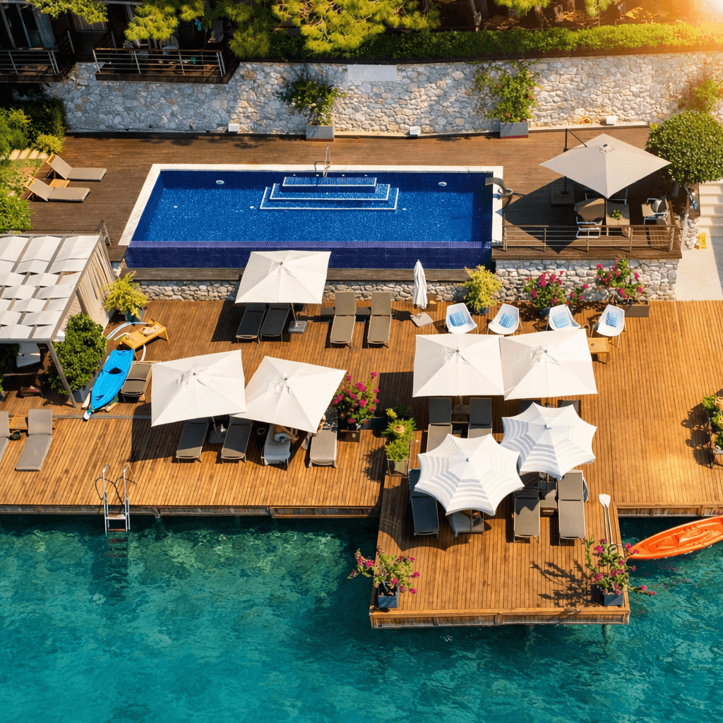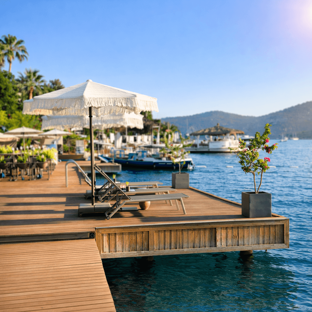 Marmaris’in berrak deniziyle bütünleşen Miamai Otel, ahşap iskele ve havuz çevresindeki açık alanlarında hem estetik hem de fonksiyonel bir gölgelendirme çözümünü tercih etmiştir. Bu projede kullanılan Selçuk Tente 50 Serisi Kare Şemsiye, geniş gölgelendirme alanı sayesinde şezlong ve dinlenme alanlarında gün boyu konforlu bir kullanım sunar. 50 mm çapındaki güçlü orta borusu ve tamamı alüminyumdan üretilmiş taşıyıcı sistemiyle 50 Serisi, deniz kenarına özgü rüzgâr ve nemli hava koşullarına karşı yüksek dayanım sağlar. Kilitlemeli açma-kapama mekanizması, yoğun otel kullanımında pratiklik kazandırırken; sade ve zamansız tasarımı Miamai Otel’in modern mimarisiyle kusursuz bir uyum yakalar. Açık renkli kumaş yapısı ise güneş ışığını dengeli biçimde filtreleyerek ferah ve davetkâr bir atmosfer oluşturur.