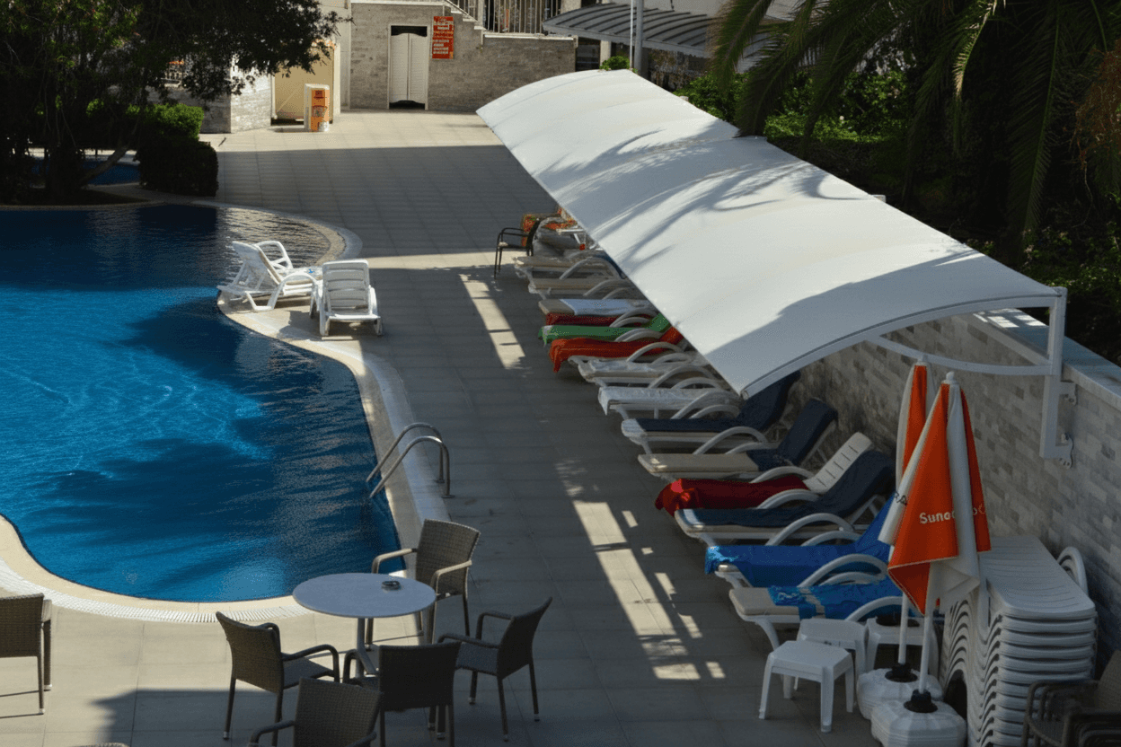 Marmaris İçmeler’ in muazzam dağ ve deniz manzarasını kucaklayan Mirage World Hotel için, tesisin mimari estetiğini zirveye taşıyan bir gölgelendirme projesine imza attık. Otelin geniş havuz alanına bakan dinlenme alanlarını, misafirlerine dört mevsim kesintisiz konfor sunmak amacıyla kışlık uygulama disiplinimizle profesyonelce giydirdik. Bu projede temel önceliğimiz, hem tam koruma sağlamak hem de görsel bir sanat eseri yaratmaktı. Bu doğrultuda; güneş ve ısı kontrolünün yanı sıra alev yürütmeme özelliğiyle en üst düzey güvenlik sağlayan Blackout kumaş tercih edilmiştir. Projenin en dikkat çekici özelliği ise "havuza bakan bir kuğu misali" tasarlanan, kavisli ve estetik eğime sahip karkas yapısıdır. Kışlık konseptin en hayati teknik gerekliliği olan su tahliyesi, bu zarif kavis sayesinde kusursuz hale getirilmiş; suyun göllenme yapmadan akıp gitmesi sağlanmıştır. Montaj aşamasında, otelin yüksek prestijine yakışır şekilde en pürüzsüz ve bütünleşik görünümü sunan ahşap çıta üzeri zımba tekniği uygulanmıştır. Bu özel işçilikle; önce ince ahşap çıtalar dönülmüş, ardından Blackout kumaş bu çıtalar üzerine yüksek gerginlikle sabitlenerek ek yeri görünmeyen, kusursuz ve dekoratif bir tavan dokusu elde edilmiştir.