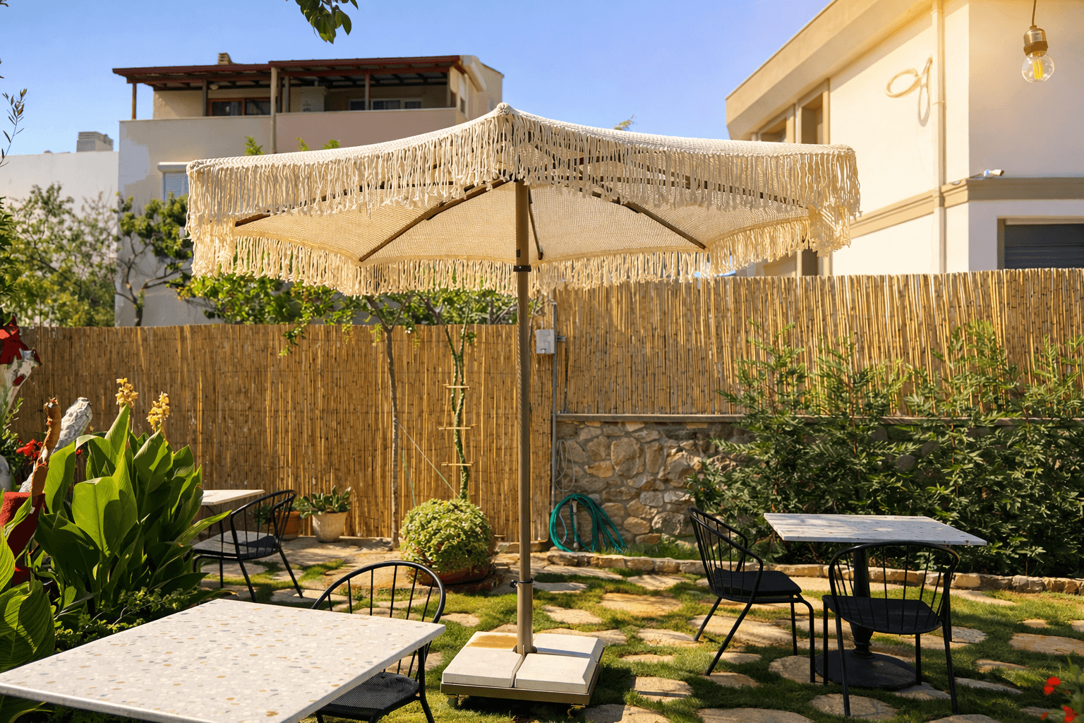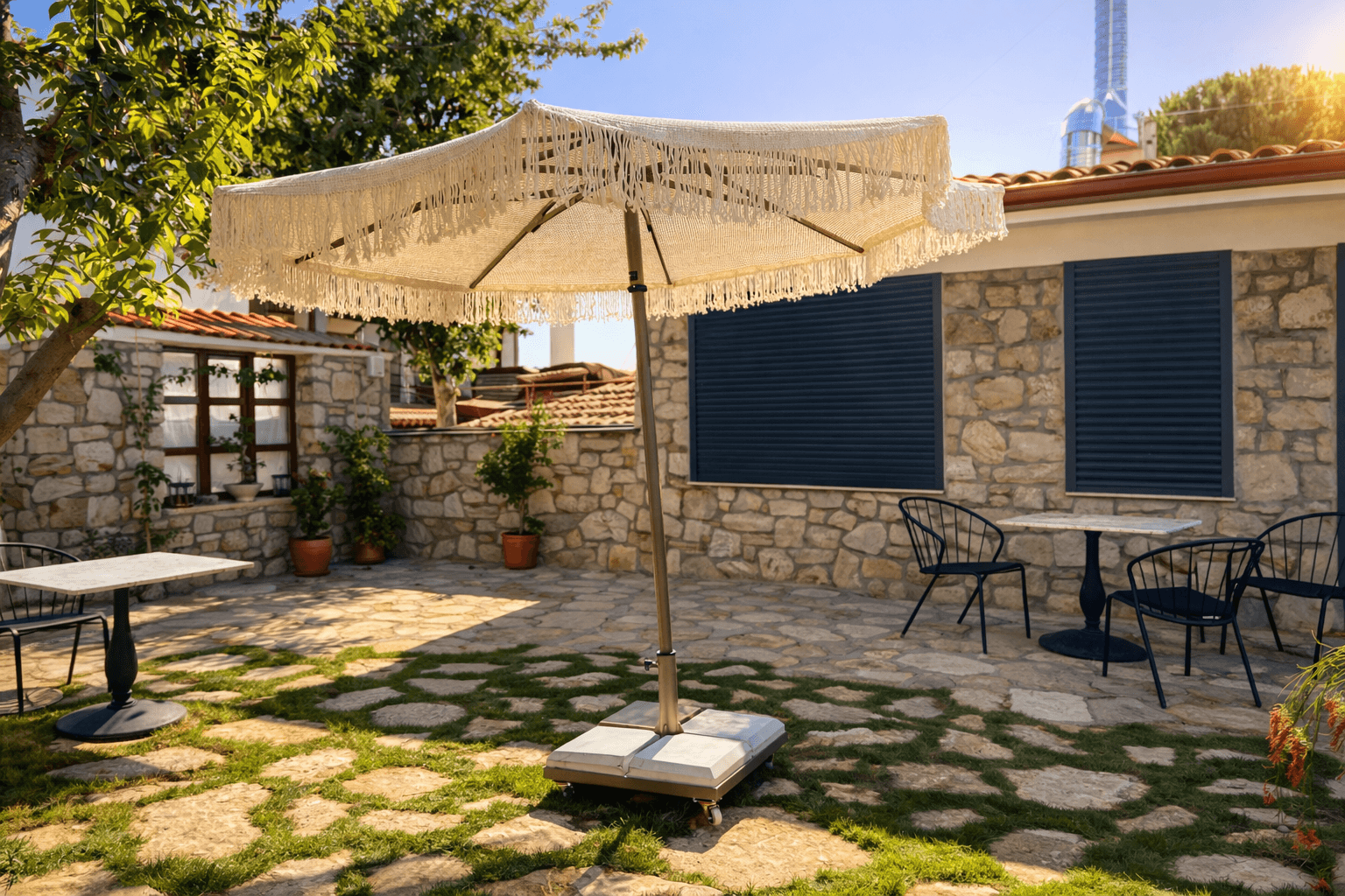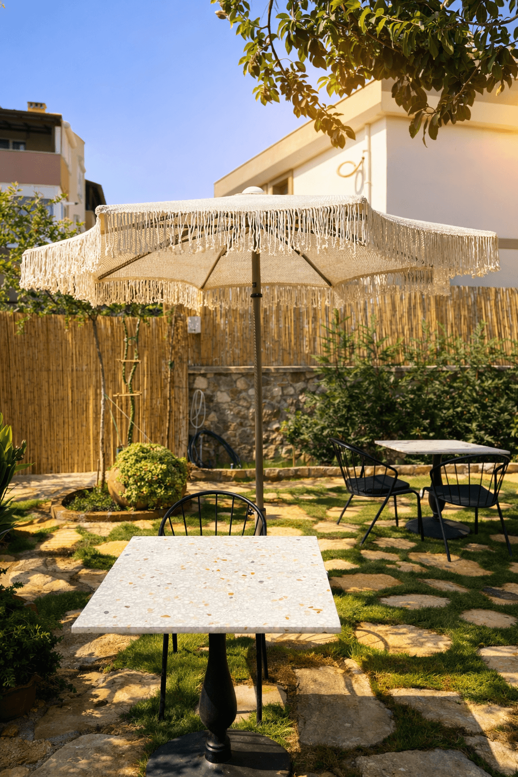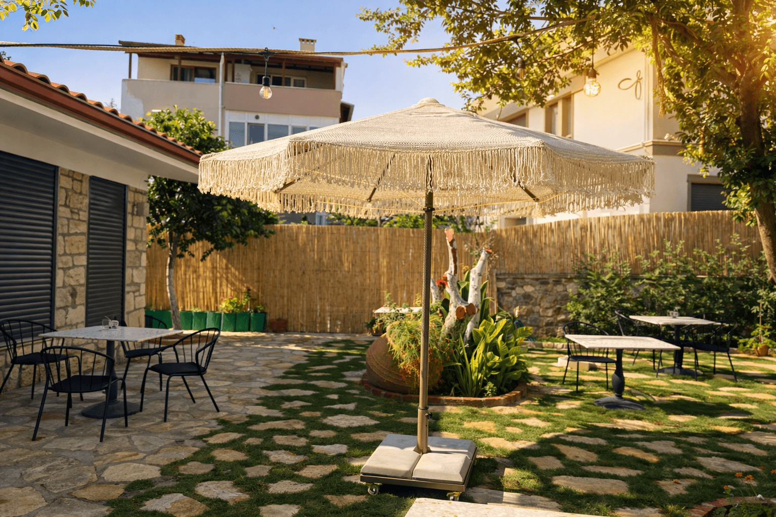 Bu projede kullanılan Selçuk Tente 50 Serisi Kare Şemsiye, butik otel ve konaklama projeleri için uzun ömürlü, estetik ve güvenilir bir gölgelendirme çözümüdür.