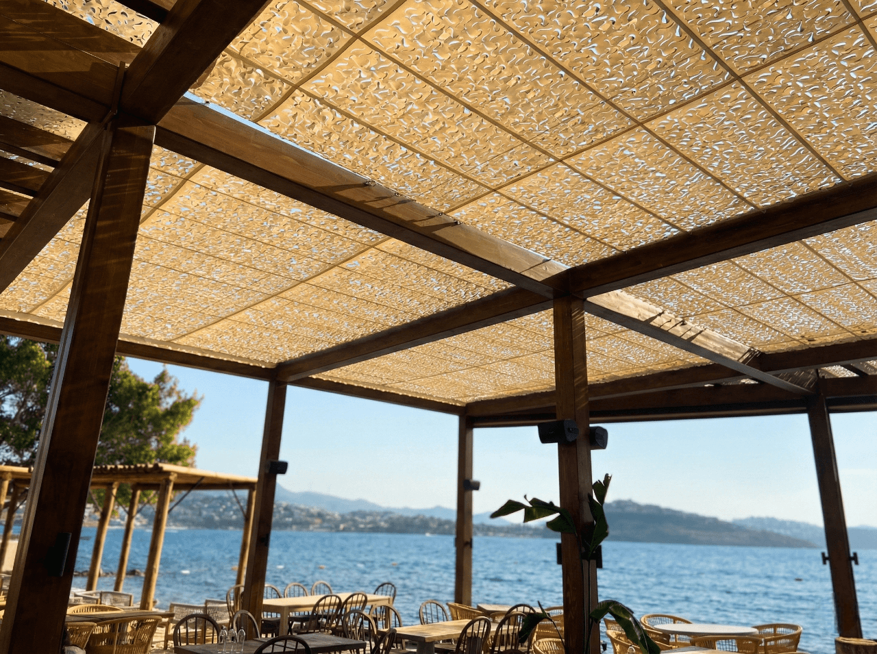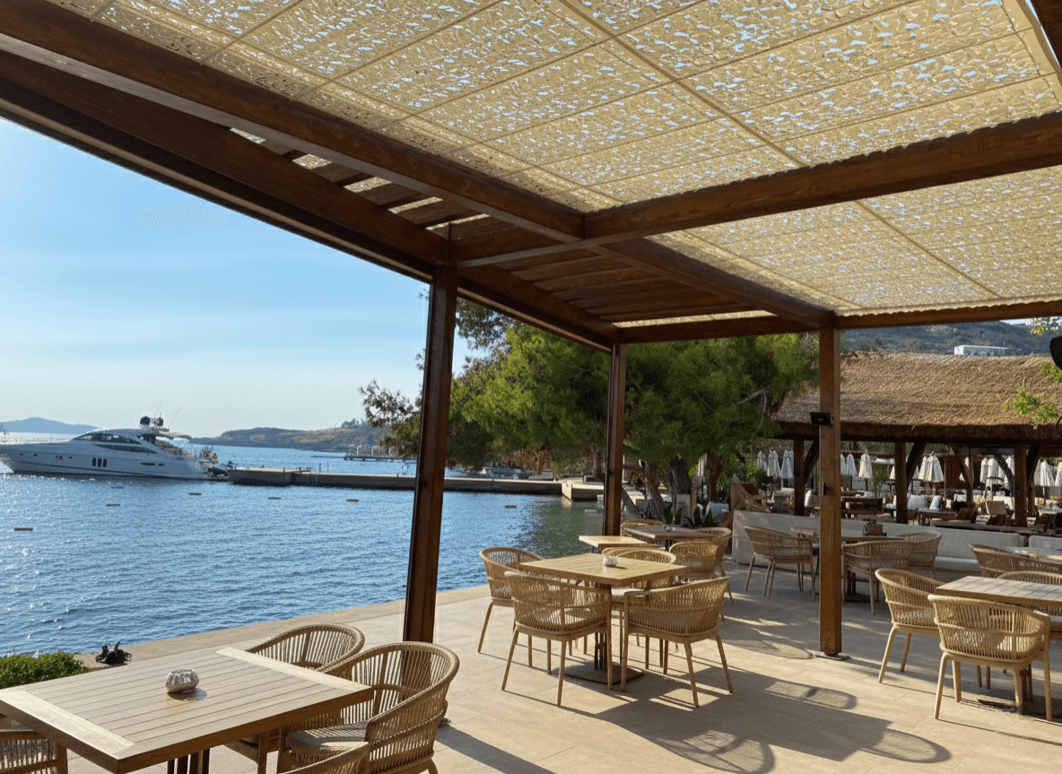 Bodrum’ un en seçkin ve enerjik noktalarından biri olan Momo Beach’ te, güneşin yakıcı etkisini Selçuk Tente’ nin sanatsal dokunuşuyla birer ışık oyununa dönüştürdük. Denizin ve eğlencenin merkezinde, konforu estetikle buluşturan çözümümüz: Telli Tente Sistemi. Bu prestijli iskele projesinde, mekanın bohem ve lüks ruhuna kusursuz bir uyum sağlaması için CNC Kesim Kamuflaj Kumaş tercih ettik. Krom halatlar üzerinde bir kuğu zarafetiyle süzülen sistemimiz, Bodrum’ un o ferahlatıcı esintisini kesmeden misafirlere en şık gölge deneyimini sunuyor. Kamuflaj dokunun arasından süzülen yumuşak ışık huzmeleri, iskelenin ahşap zemini ve modern mobilyalarla birleşerek Momo Beach misafirleri için yaşayan, dinamik bir atmosfer yaratıyor. Maviye, güneşe ve Bodrum’un ruhuna en çok yakışan tasarım.