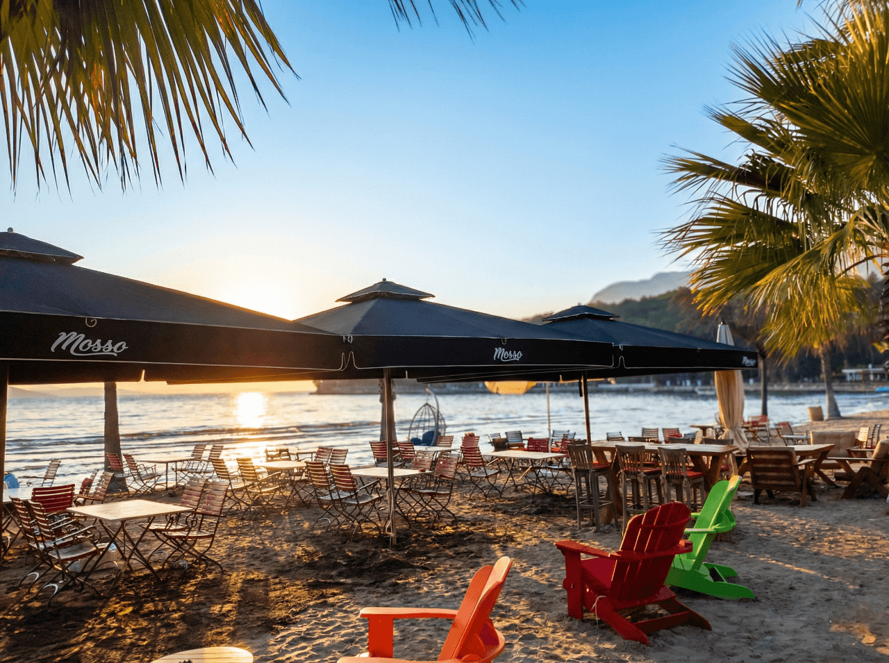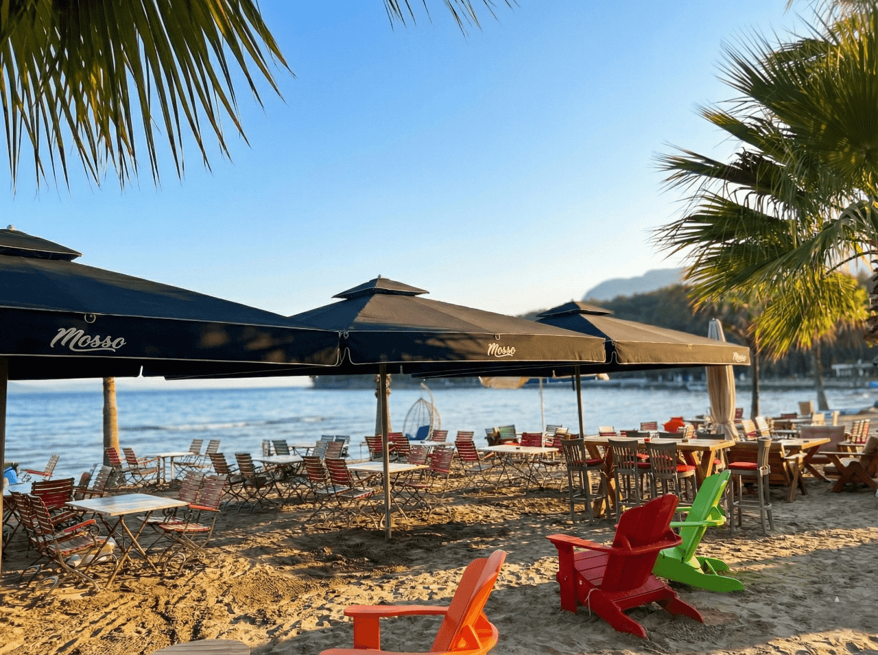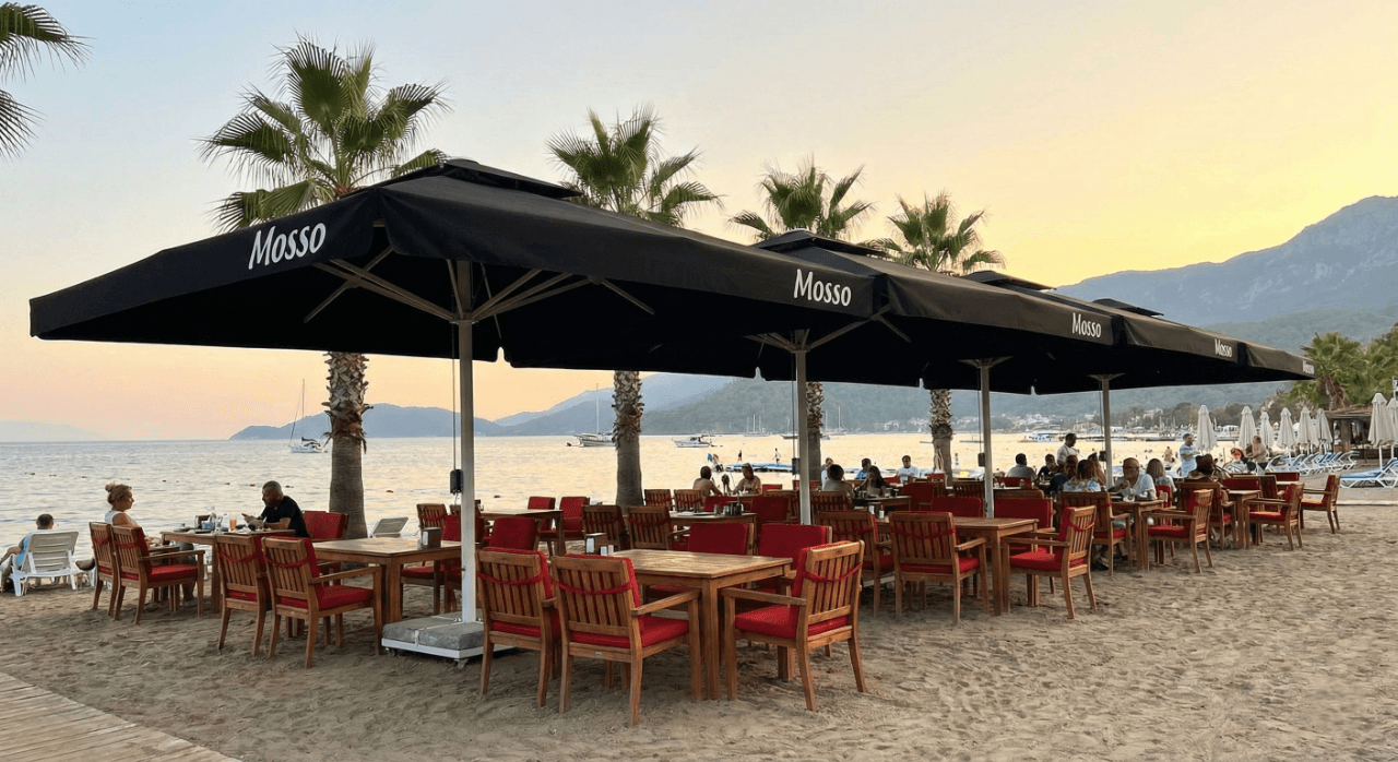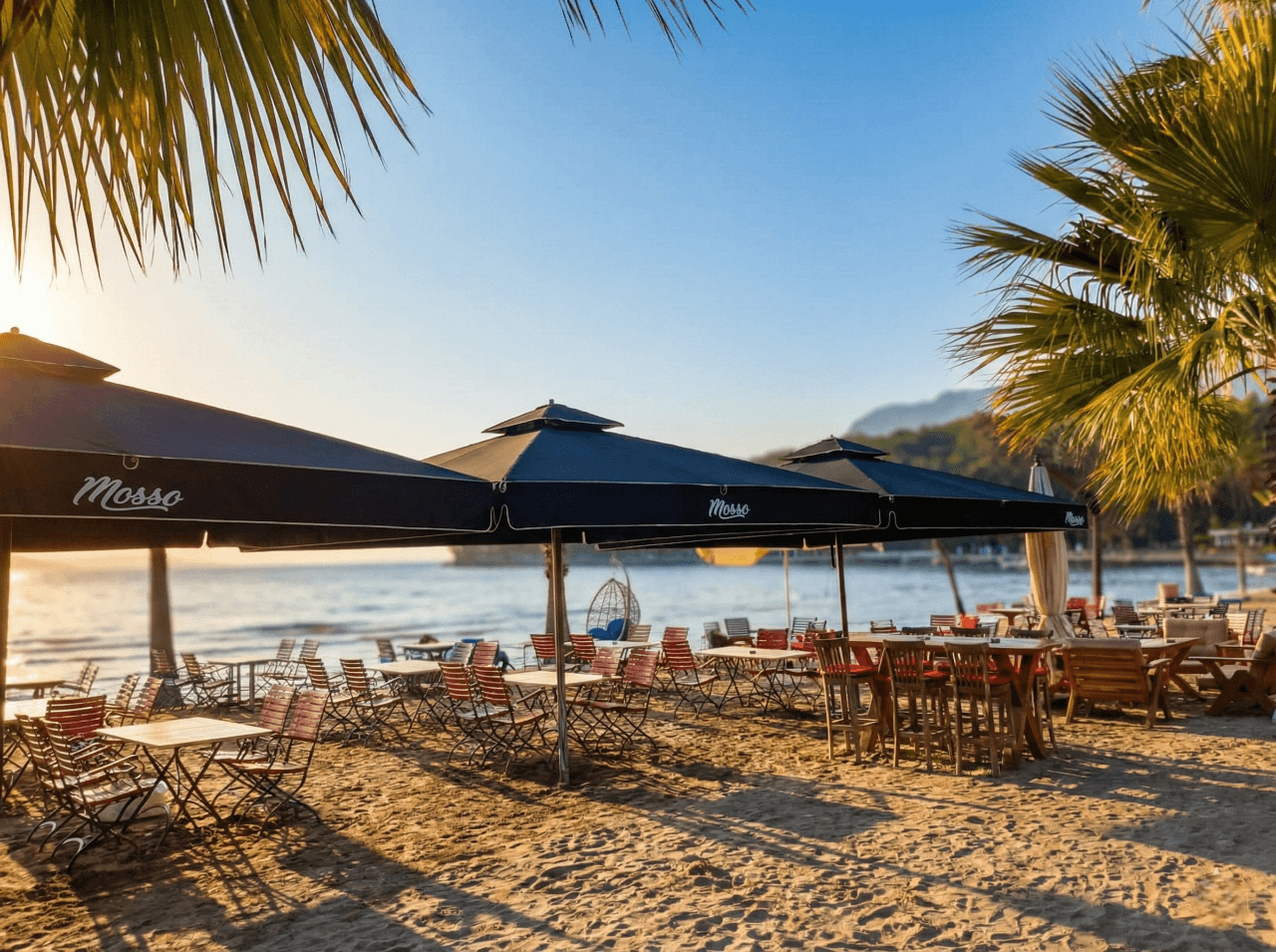 Akyaka’nın doğal dokusu ve sakin atmosferiyle uyumlu bir konumda yer alan Mosso, açık alanlarında ferahlık ve konforu ön planda tutan bir mekân anlayışı sunuyor. Bahçe ve dış oturma alanlarında tercih edilen 70 Serisi – 400×400 Kare Şemsiye, geniş kare formu sayesinde masa düzenlerini tek bir gölgelendirme altında toplayarak düzenli ve dengeli bir kullanım alanı oluşturuyor. Gün boyu değişen güneş açılarına karşı homojen gölge sağlayarak misafirlerin açık havada keyifle vakit geçirmesine olanak tanıyor. 70 mm çapındaki güçlü orta borusu ve alüminyum taşıyıcı yapısıyla öne çıkan 70 Serisi, Akyaka’nın açık alan koşullarına uygun stabil duruşu ve uzun ömürlü performansıyla dikkat çekiyor. Teleskopik kapanma özelliği sayesinde şemsiye kapatılırken masa ve mobilyalara temas etmeden pratik bir kullanım sunulurken; palanga sistemli açma-kapama mekanizması işletme ekibi için sessiz, kontrollü ve zahmetsiz bir operasyon avantajı sağlıyor. Mosso’nun doğal ve sade konseptiyle uyumlu, güçlü ama yalın bir dış mekân çözümü olarak öne çıkıyor. Bu projede tercih edilen Selçuk Tente 70 Serisi – 400×400 Kare Şemsiye, Mosso’nun Akyaka’daki açık alan konseptiyle uyum içinde; geniş alan kapsaması, kullanıcı konforu ve uzun ömürlü performansı bir arada sunar.