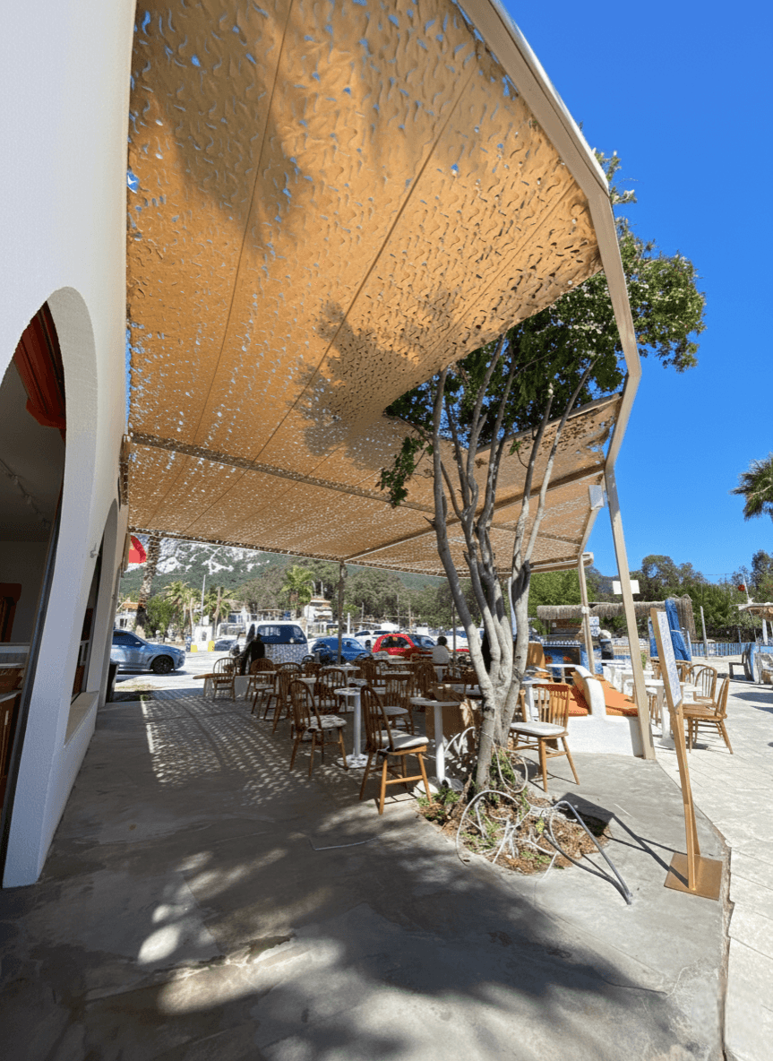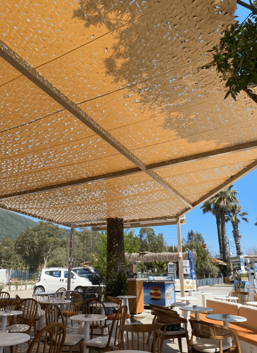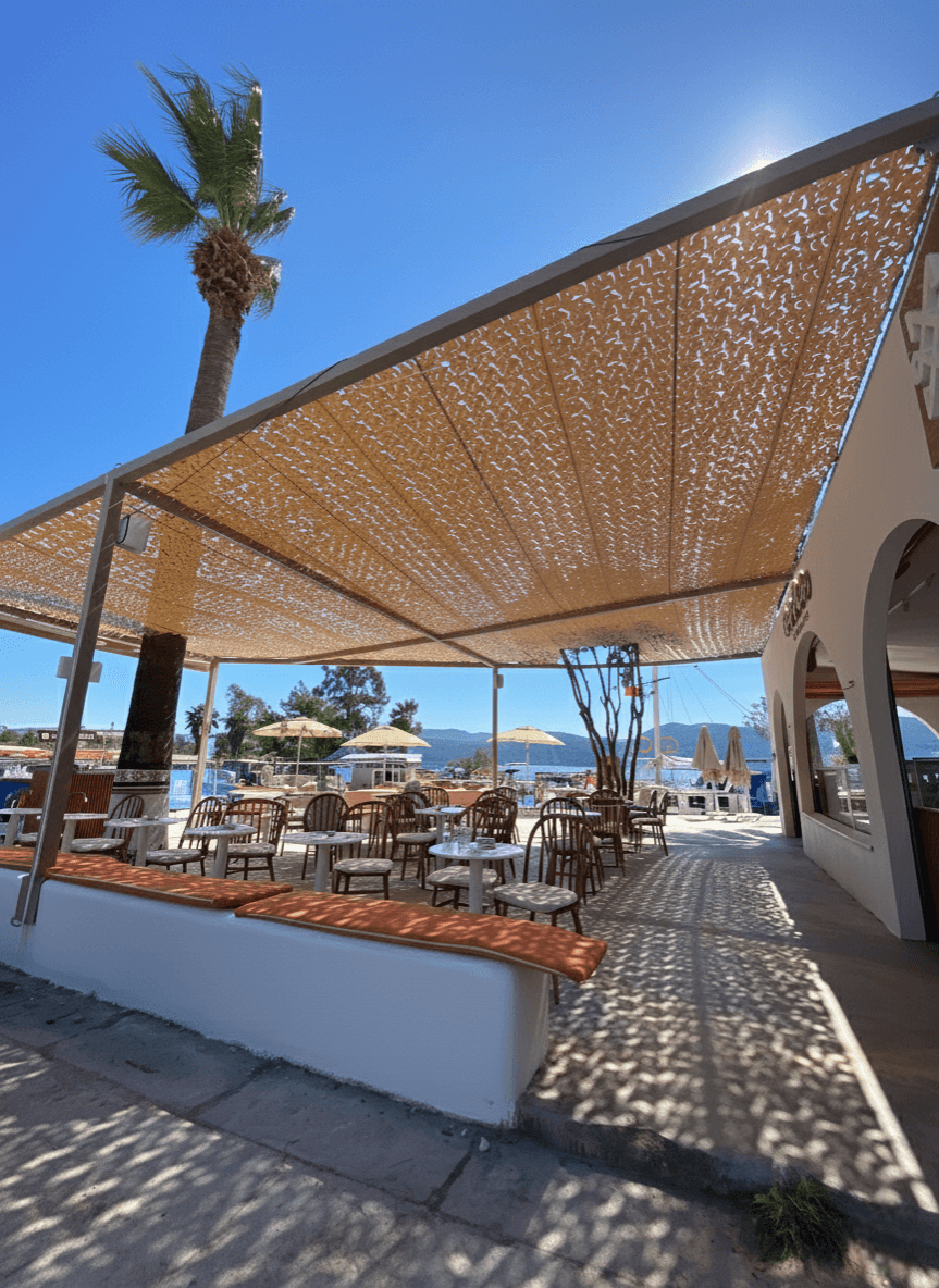 Muğla’nın "Yavaş Şehir" unvanlı Akyaka beldesinde, kendine has mimarisi ve rüzgar sörfüne uygun yapısıyla bilinen sahil bandında yer alan Motto Akyaka, modern konseptiyle dikkat çeker. Mekanın açık hava restoran ve bar alanlarını, Sabit Tente iskeletiyle bütünleşen Kamuflaj Tente ürünümüzle çok daha davetkar bir hale getirdik. Akyaka’ nın sörf tutkunlarını cezbeden güçlü rüzgar yapısında, lazer teknolojisiyle açılan özel "S" kanallar hayati bir rol üstlenir. Bu gözenekler rüzgarın kumaşa baskı yapmadan içinden geçmesine izin verir; böylece sistemin rüzgar direnci azalır ve yırtılma ihtimali ortadan kalkar. Mekanda basık bir tavan hissi yerine, misafirlerin nefes alabileceği, ferah ve derinlik katan bir gölgelendirme alanı sunulmuştur.