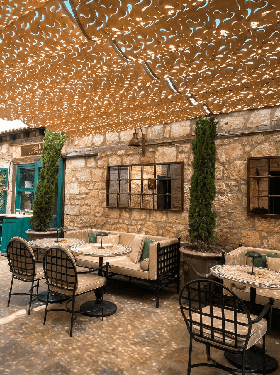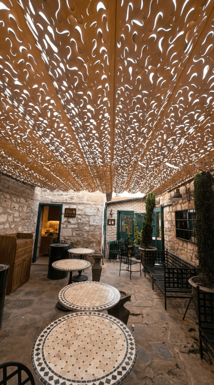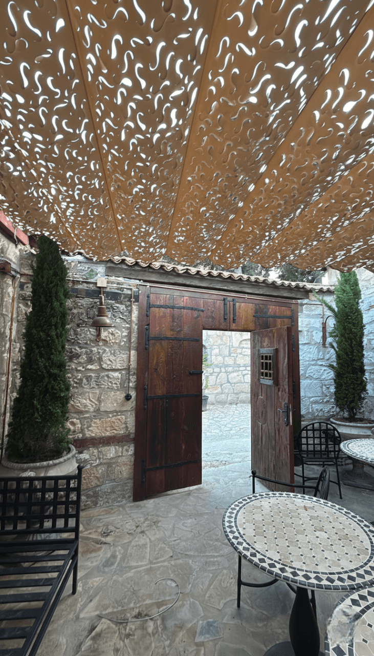Oksijen deposu Kazdağları’ nın huzur veren atmosferinde, Nadas Fırın’ ın doğal ve sıcak ruhunu Selçuk Tente zarafetiyle bütünleştirdik. Taş duvarların ve ahşabın samimiyetine eşlik eden çözümümüz: Telli Tente Sistemi. Bu özel projemizde, doğanın dokusuna kusursuz uyum sağlaması için CNC Kesim Kamuflaj Kumaş tercih ettik. Krom halatlar üzerinde bir akordiyon zarafetiyle süzülen sistem, Kazdağları’ nın o meşhur ferahlatıcı esintisini kesmeden misafirlere gölgenin en doğal halini sunuyor. Kamuflaj dokunun arasından süzülen yumuşak ışık huzmeleri, taş mimari ve ahşap mobilyalarla birleşerek mekana yaşayan bir orman derinliği katıyor. Misafirleriniz taze fırın lezzetlerinin tadına bakarken, üzerlerindeki bu sanatsal gölge onlara huzur dolu bir mola alanı yaratıyor.