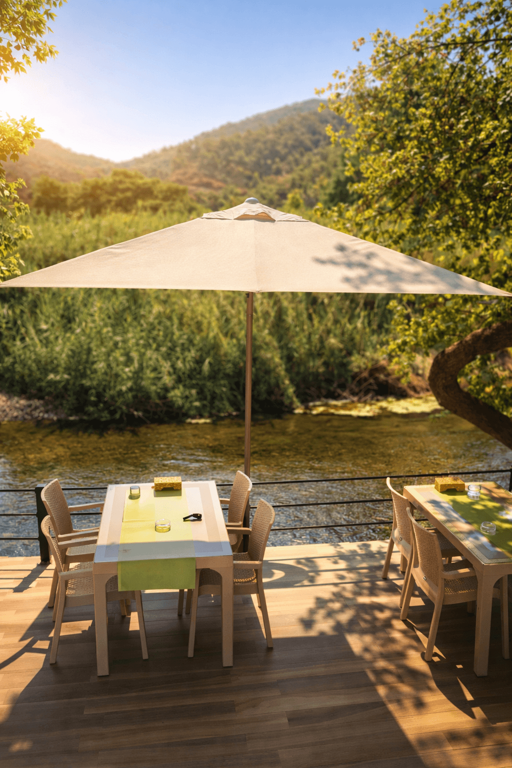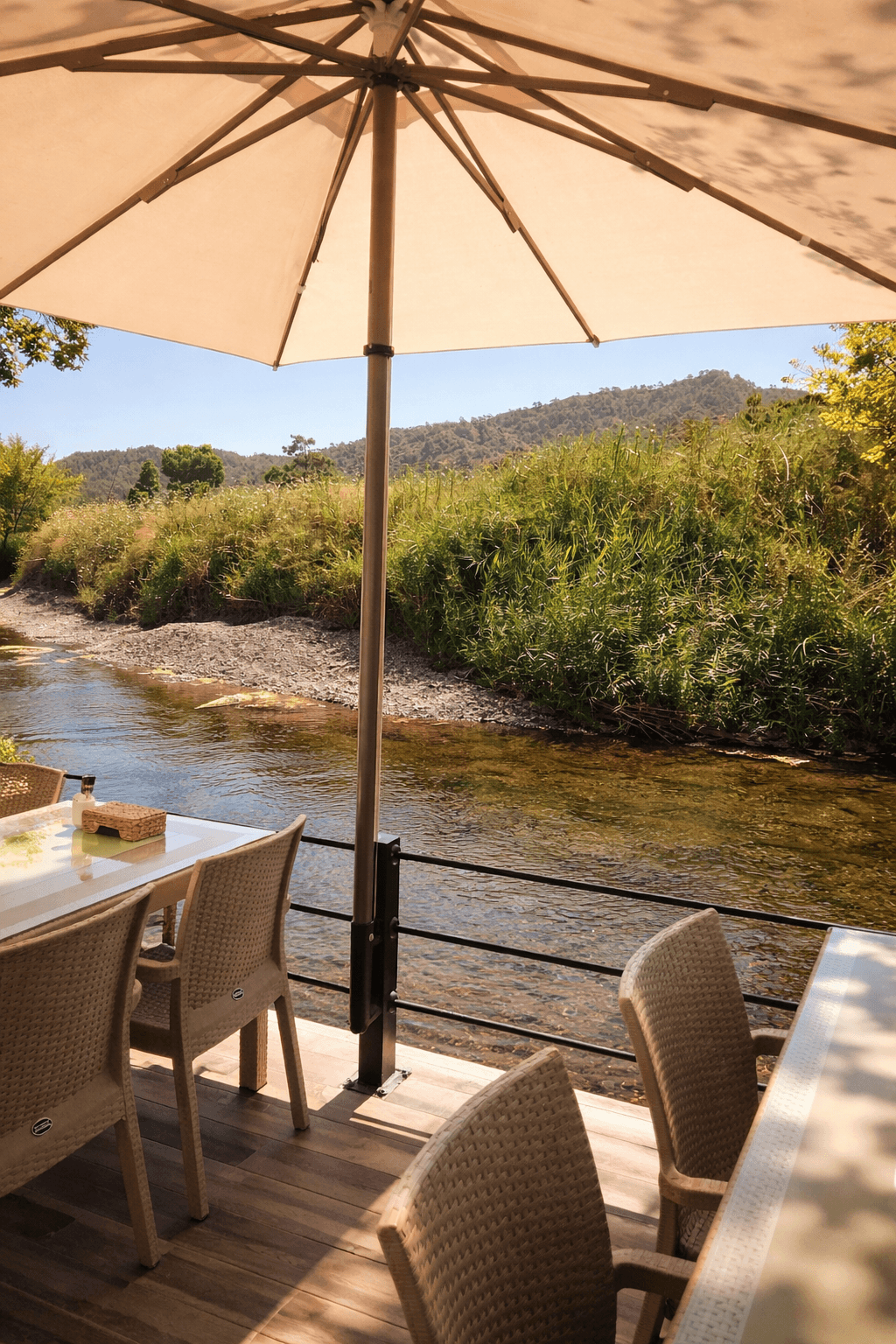 Doğayla iç içe konumlanan Nehirde Mola – Marmaris, dere kenarındaki açık alan düzenlemesinde konforlu ve güvenilir gölgelendirme ihtiyacı için Selçuk Tente 50 Serisi 300x300 Kare Şemsiye tercih etmiştir. Sürekli güneş alan ve nem oranı yüksek olan bu özel lokasyonda, sağlam konstrüksiyon ve uzun ömürlü kullanım kritik bir gereksinimdir. 50 mm çapındaki güçlü alüminyum orta borusu ve tamamı alüminyumdan üretilmiş taşıyıcı sistemi sayesinde 50 Serisi, rüzgâr ve dış mekân koşullarına karşı yüksek dayanım sağlar. 300x300 cm kare ölçüsü, masa ve oturma grupları üzerinde geniş, dengeli ve kesintisiz bir gölge alanı oluşturarak misafir konforunu artırır. Kilitlemeli açma-kapama mekanizması ise işletme personeline hızlı, güvenli ve pratik kullanım avantajı sunar. Doğal çevreyle uyumlu sade tasarımı ve güçlü yapısıyla bu uygulama, Marmaris bölgesindeki restoran ve kafe projeleri için hem estetik hem de teknik açıdan ideal bir gölgelendirme çözümü olarak öne çıkmaktadır.
