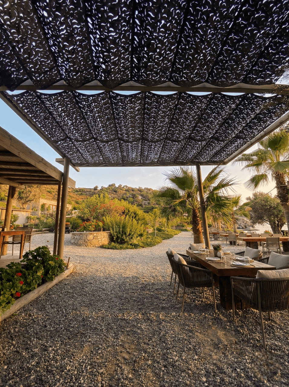 Marmaris’ in en bakir ve huzurlu koylarından biri olan Kuzbükü’ nde, Neighbours Restaurant’ ın doğal ruhunu Selçuk Tente estetiğiyle bütünleştirdik. Denizin kıyısında, zeytin ağaçlarının fısıltısına eşlik eden çözümümüz: Telli Tente Sistemi. Bu özel projemizde, koyun el değmemiş doğasına ve mekanın samimi ahşap mimarisine uyum sağlaması için CNC Kesim Kamuflaj Kumaş tercih ettik. Krom halatlar üzerinde bir akordiyon zarafetiyle süzülen sistem, gündüz güneş ışığını sanatsal birer ışık huzmesine dönüştürürken; akşam saatlerinde ise mekanın sıcak aydınlatmalarıyla birleşerek misafirlere masalsı bir atmosfer sunuyor. Kamuflaj dokunun yarattığı o harika gölge, çakıl taşlı zemin ve büyük ahşap masalar üzerinde yaşayan bir dekorasyon öğesine dönüşüyor.