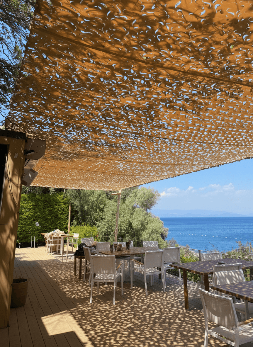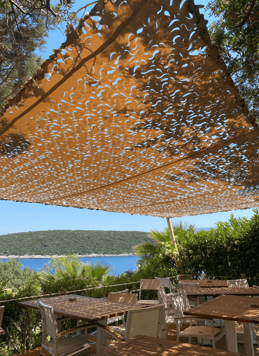 Datça’nın doğal taş dokusuyla modern mimariyi harmanlayan Olive Hill için, mekana yarı açık bir ferahlık katan özel Kamuflaj Tente projemizi tamamladık. Taş binanın rustik havasını, modern siyah metal konstrüksiyon ve dekoratif gölgelendirme ağıyla birleştirerek, gün ışığının en estetik halini misafirlerle buluşturduk.