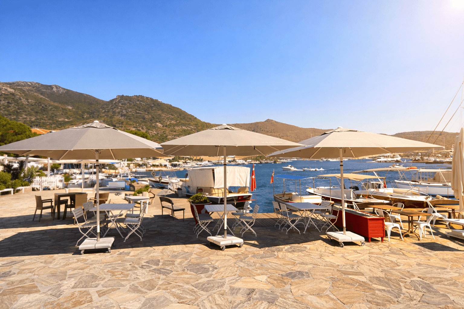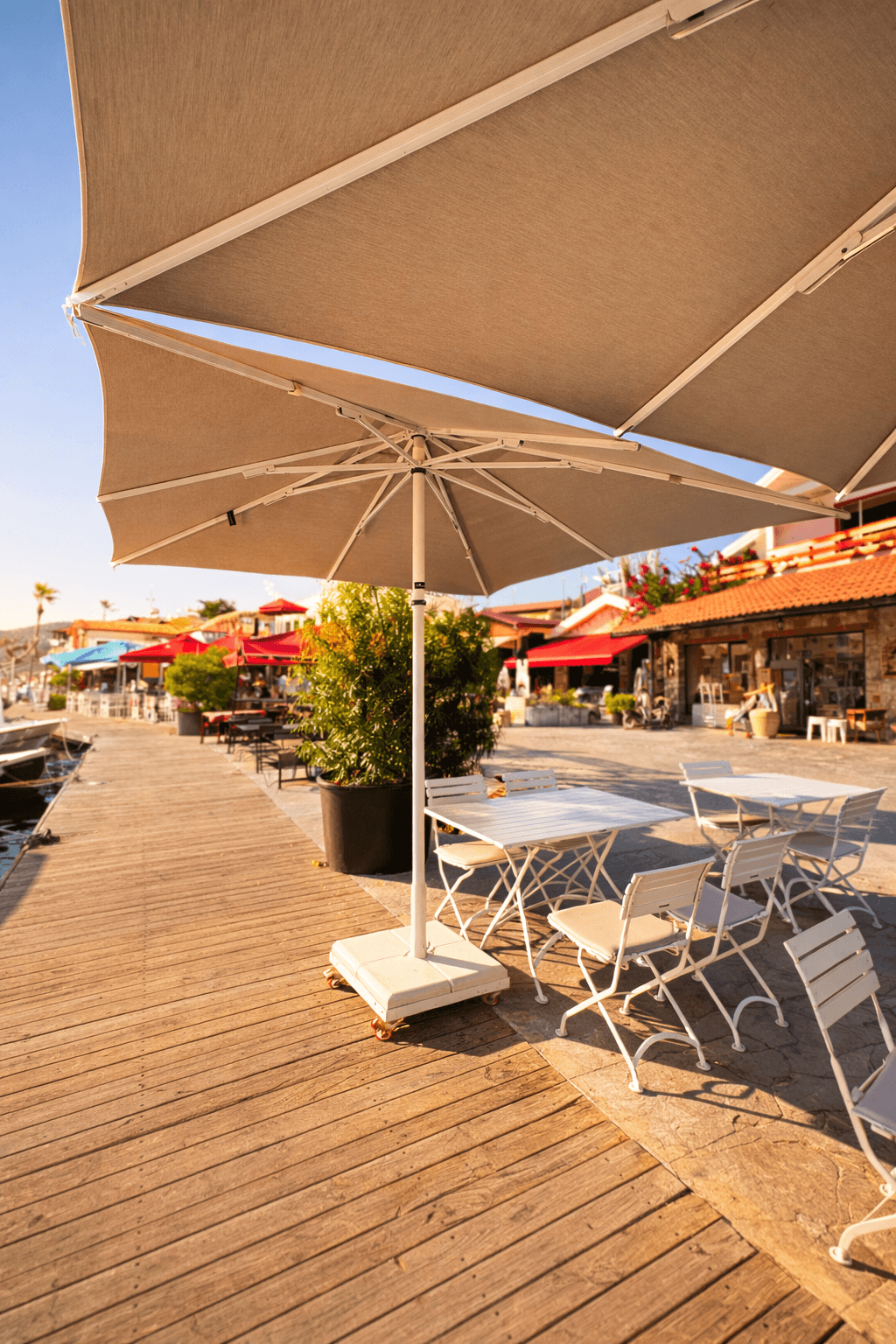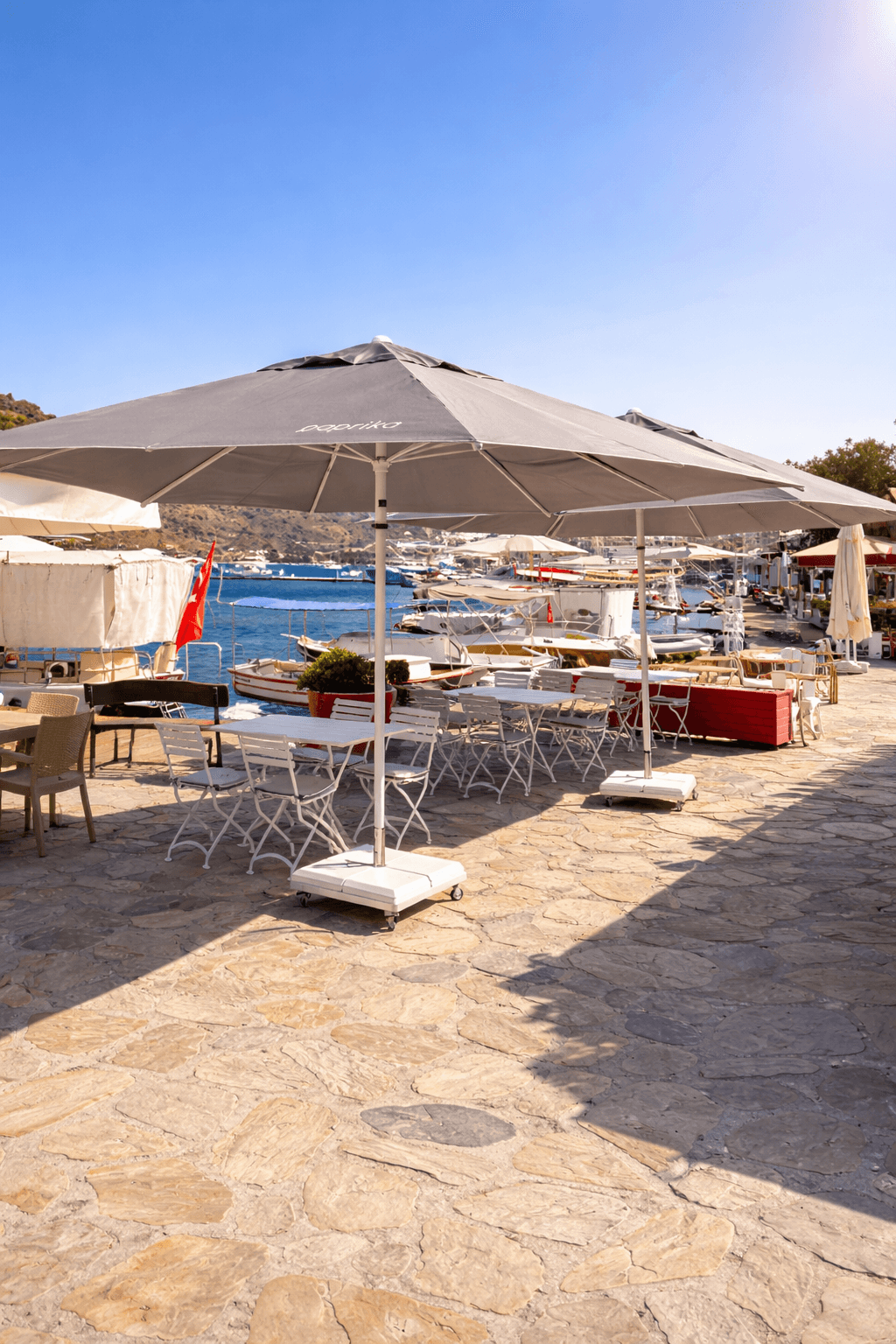 Selimiye’nin marinaya açılan ferah sahil hattında konumlanan Paprika – Selimiye, gün boyu yoğun güneş alan açık oturma alanlarında konforu ve estetik bütünlüğü korumak amacıyla Selçuk Tente 50 Serisi 300x300 Kare Şemsiye sistemini tercih etmiştir. Denizle iç içe bu özel lokasyonda, rüzgâr ve güneş dengesini doğru kuran profesyonel bir gölgelendirme çözümü kritik önem taşır.