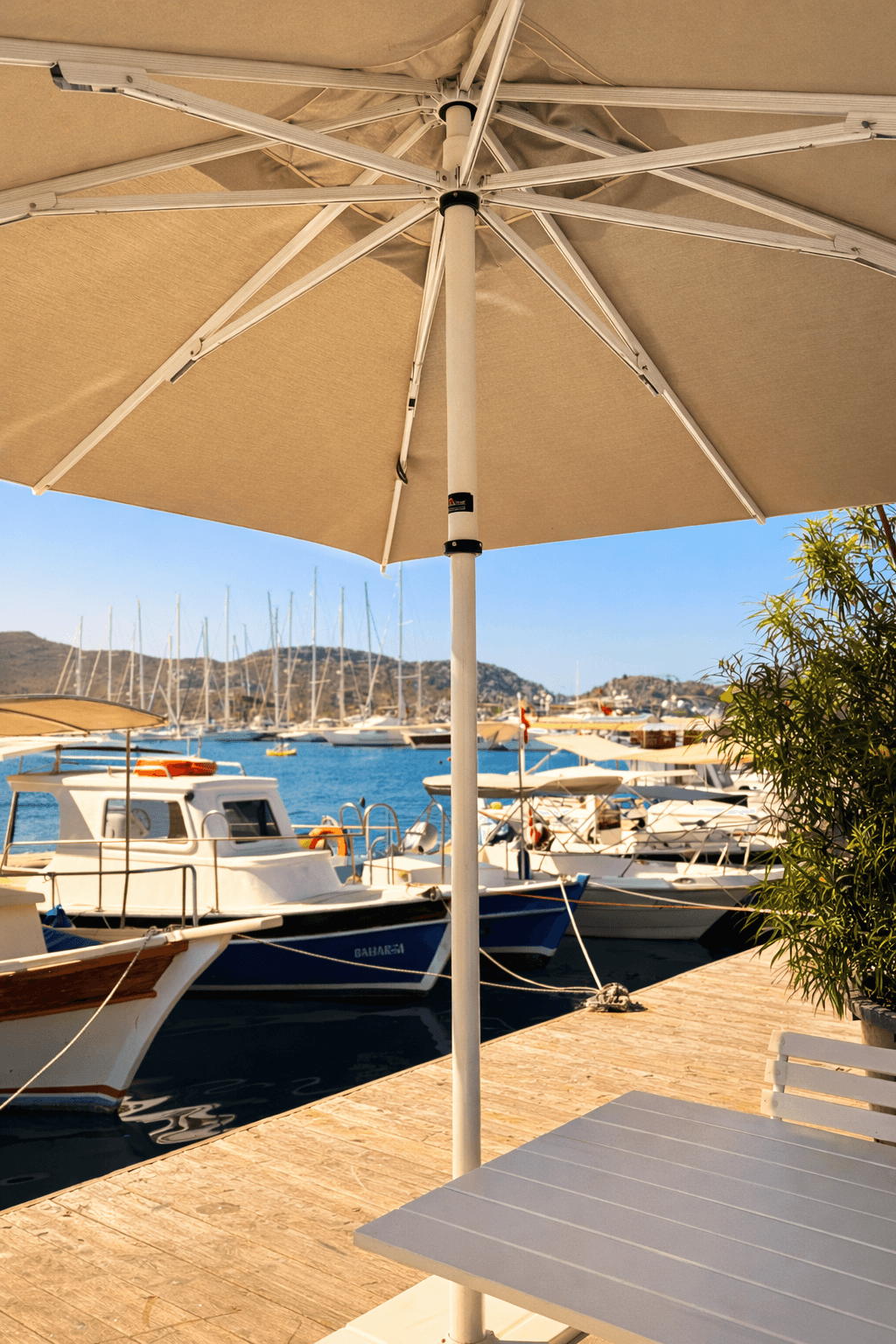 50 mm çapındaki güçlü alüminyum orta borusu ve tamamı alüminyumdan oluşan taşıyıcı yapısı sayesinde 50 Serisi, sahil koşullarına karşı yüksek dayanım sunar. 300x300 cm kare ölçüsü, masa düzeni üzerinde geniş ve dengeli bir gölge alanı oluşturarak misafirlerin manzara keyfini kesintisiz sürdürmesine olanak tanır. Kilitlemeli açma-kapama sistemi ise işletme ekibi için hızlı, güvenli ve pratik bir kullanım sağlar. Zarif tasarımı, uzun ömürlü yapısı ve Selimiye’nin doğal dokusuyla uyumlu duruşuyla bu uygulama; marinaya yakın restoran ve kafeler için ideal bir dış mekân gölgelendirme referansı niteliğindedir.