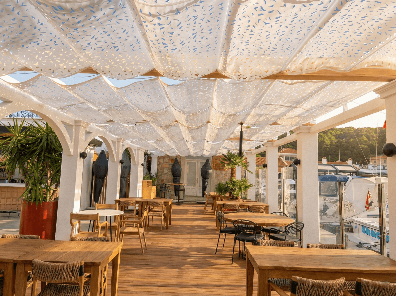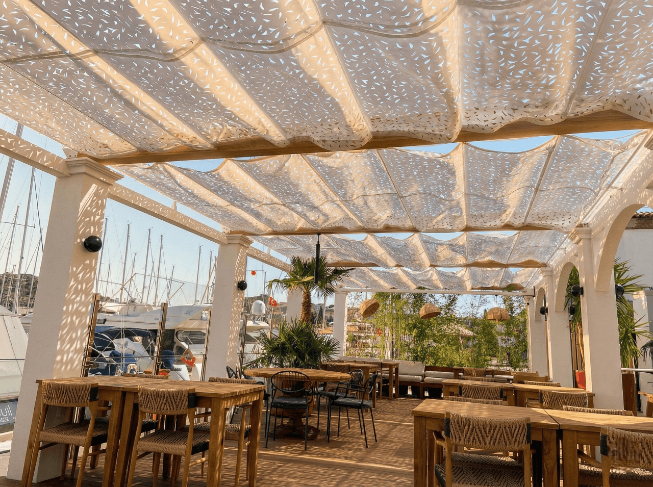Çeşme’ nin kalbinde, lüks yatların ve maviliğin buluşma noktası olan Port Marina’ da, konforu Selçuk Tente’ nin sanatsal vizyonuyla yeniden tanımladık. Marinanın modern mimarisine ve deniz üzerindeki yaşamın dinginliğine eşlik eden çözümümüz: Telli Tente Sistemi. Bu seçkin projede, mekanın ferah ve aydınlık yapısını korumak, teknelerin zarafetiyle uyum yakalamak adına CNC Kesim Beyaz Kamuflaj Kumaş tercih ettik. Çelik halatlar üzerinde bir kuğu gibi süzülen akordiyon sistemimiz, güneş ışığını bir dantel gibi işleyerek zemine ve masalara masalsı gölge desenleri bırakıyor. Fotoğraflarda göreceğiniz gibi; beyaz kamuflajın yarattığı gölge, marinanın prestijli atmosferiyle birleşerek misafirlere yaşayan, dinamik ve serin bir görsel şölen sunuyor.