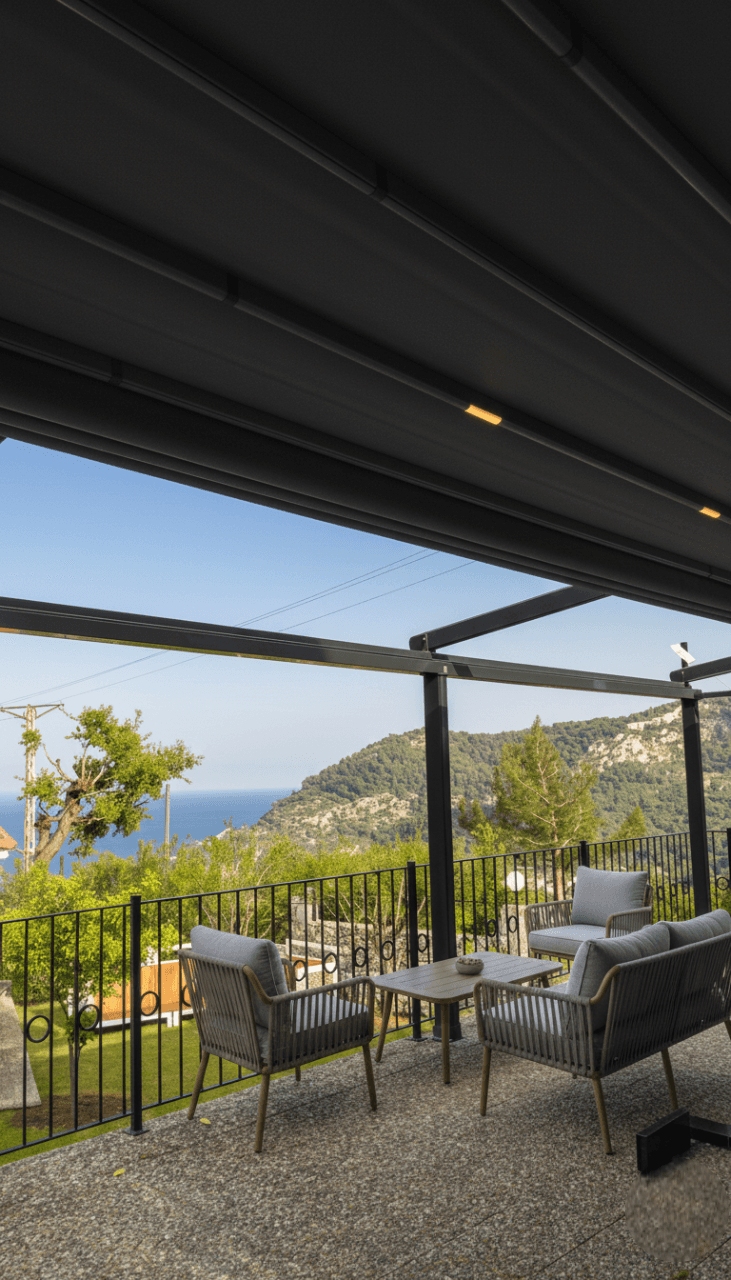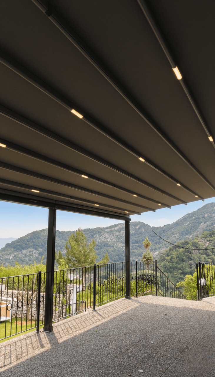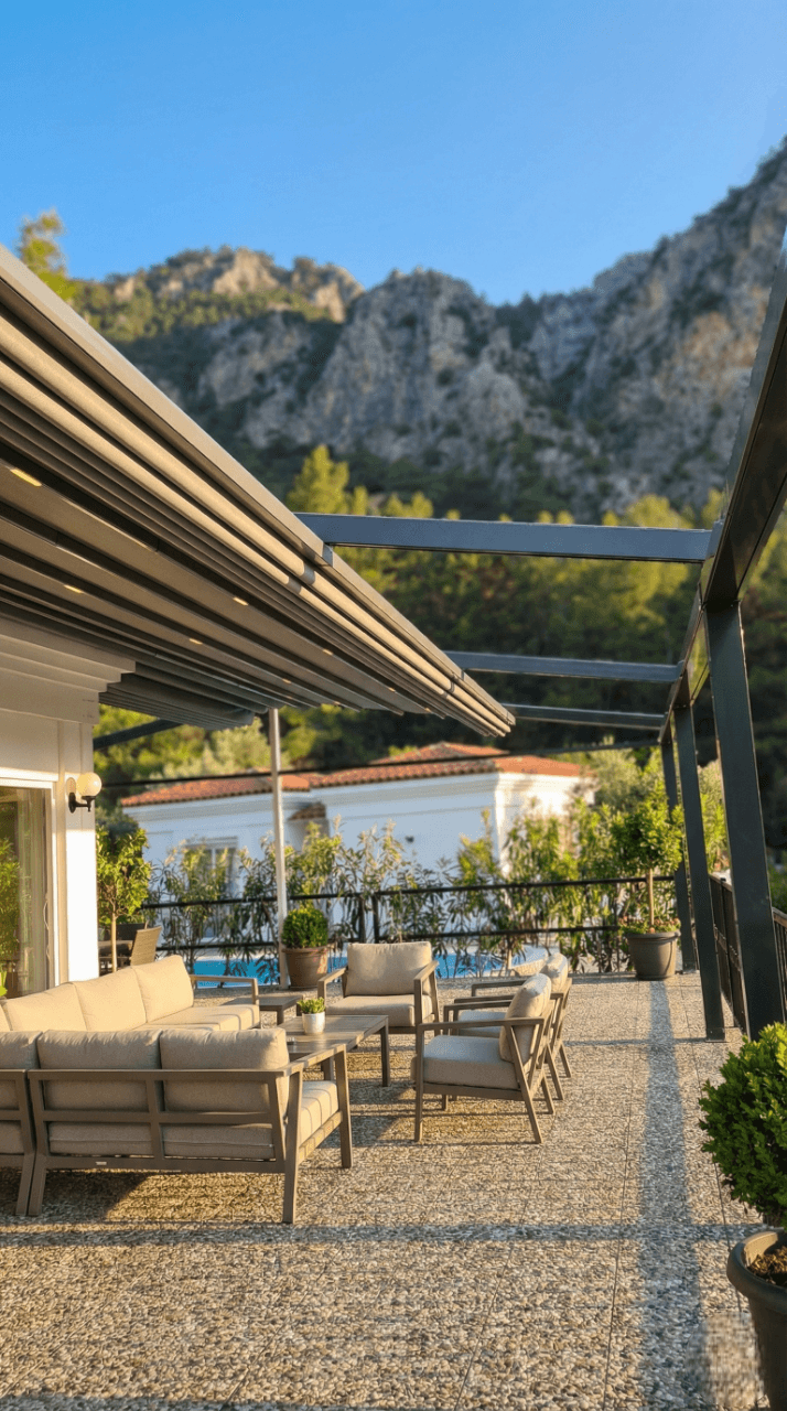 • Yangın Emniyetli Blackout Kumaş: Otel güvenliğini ön planda tutarak, sistemde alev yürütmeyen ve üstün ısı yalıtımı sağlayan Blackout kumaş kullandık. Bu özel kumaş, yazın en sıcak saatlerinde bile teras alanında serin bir vaha konforu sunar.