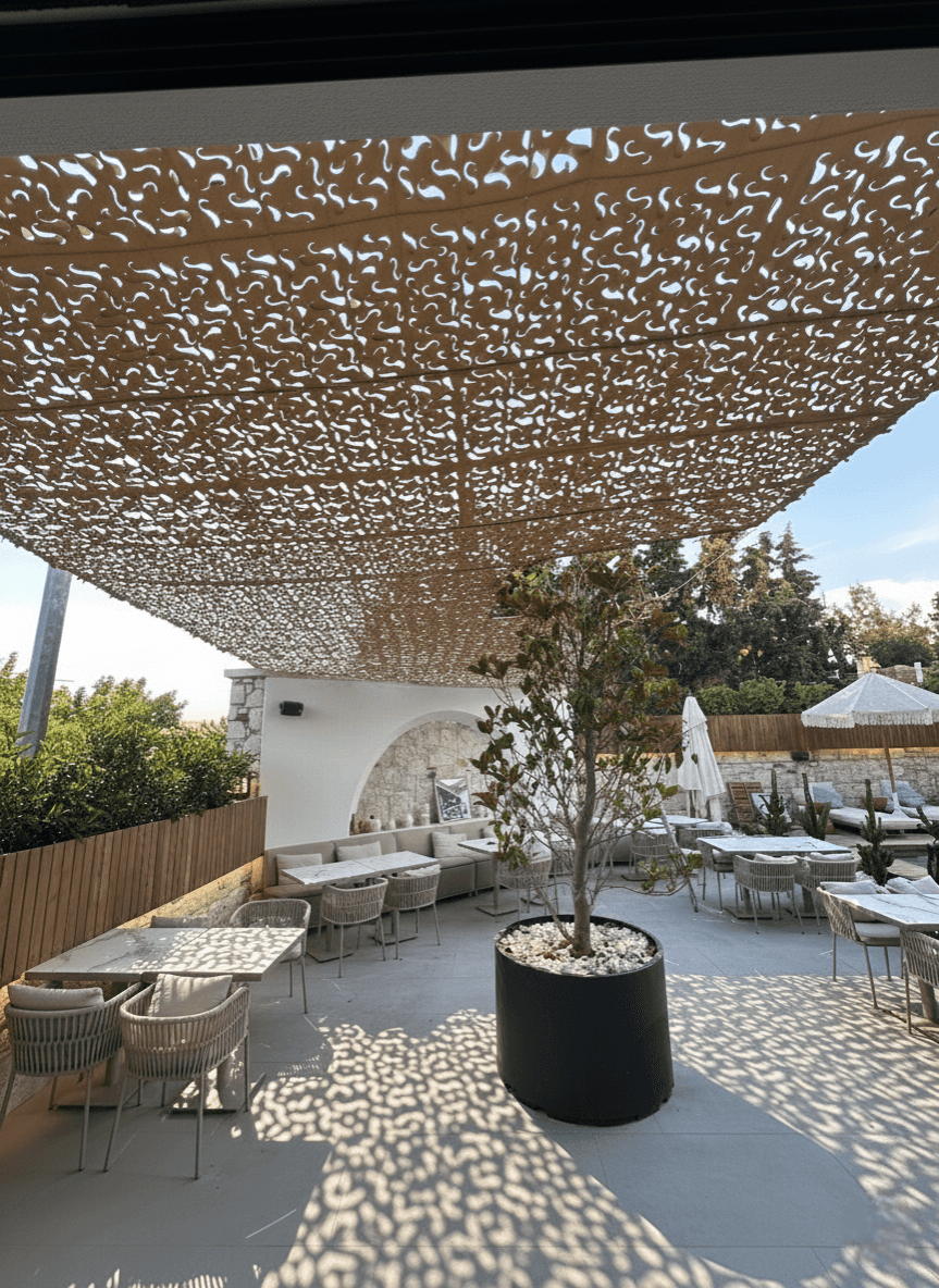 Alaçatı’ nın kalbinde, bölgenin tarihi taş mimarisine modern bir soluk getiren Rupa Alaçatı, misafirlerine butik ve seçkin bir deneyim sunar. İşletmenin avlu alanını, mimari estetiği bozmadan gölge konforu sağlayan Sabit Tente üzerine Kamuflaj Tente sistemimizle taçlandırdık. Alaçatı’ nın kesintisiz rüzgarı göz önüne alınarak tasarlanan özel "S" gözenekli yapı, rüzgarın kumaş içinden serbestçe akmasına izin vererek rüzgar direncini en aza indirir. Bu mühendislik çözümü, yırtılma riskini tamamen yok ederken kumaşın zarif formunu her daim korur. Mekanda basık bir tavan yerine; nefes alan, ferah ve Alaçatı’nın o ferahlatıcı havasını kesmeyen yarı-gölgeli bir atmosfer sunulmuştur. Yılların birikimiyle geliştirdiğimiz özel emniyet kolonları ve radansa bağlantıları, sistemin en sert rüzgarlarda dahi yapıya sarsılmaz bir şekilde tutunmasını sağlar. Montaj süreci; radansalı, vidalamalı ve çelik halat bağlama ile gerdirmeli tekniklerimizle titizlikle tamamlanmıştır.