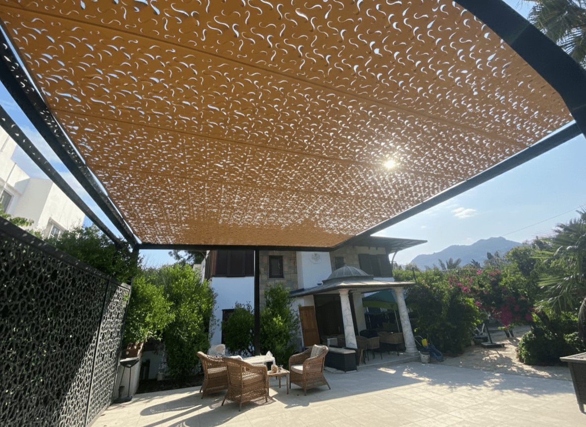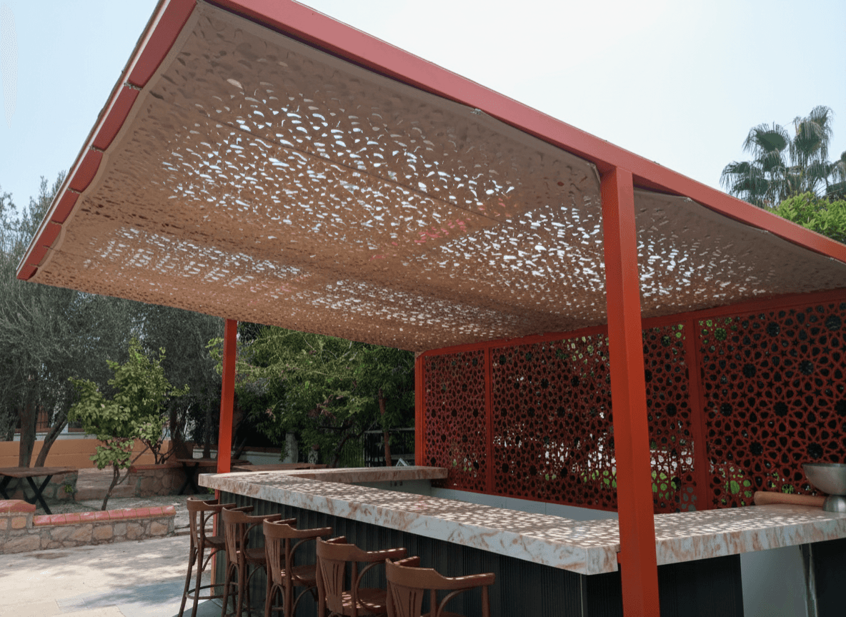 Bodrum’ un en ferah noktalarından Yahşi sahilinde, denize sıfır konumu ve iskele konseptiyle dikkat çeken Saga Bodrum için modern bir gölgelendirme çözümü sunduk. Mekanın deniz üzerindeki iskele ve açık hava restoran alanlarını, mimari çizgisine uyum sağlayan Sabit Tente iskeleti üzerinde Kamuflaj Tente sistemimizle yeniledik. Ortakent-Yahşi bölgesinin denizden gelen ve hiç kesilmeyen o güçlü esintisi göz önüne alınarak tasarlanan lazer teknolojili özel "S" gözenekler, rüzgarın kumaş içinden direnç oluşturmadan geçmesine imkan tanır. Bu mühendislik çözümü, yırtılma riskini tamamen ortadan kaldırırken, kumaşın o hafif ve estetik formunu her daim korur. Mekanda basık bir tavan yerine; ışığın iskele üzerinde sanatsal desenler oluşturduğu, nefes alan ve her an ferah hissettiren bir atmosfer yaratılmıştır. Sistem, yılların tecrübesiyle geliştirdiğimiz özel emniyet kolonları ve radansa bağlantıları sayesinde iskele üzerindeki sert fırtınalarda dahi yapıya sarsılmaz bir dirençle tutunur.
