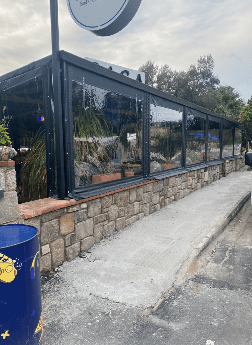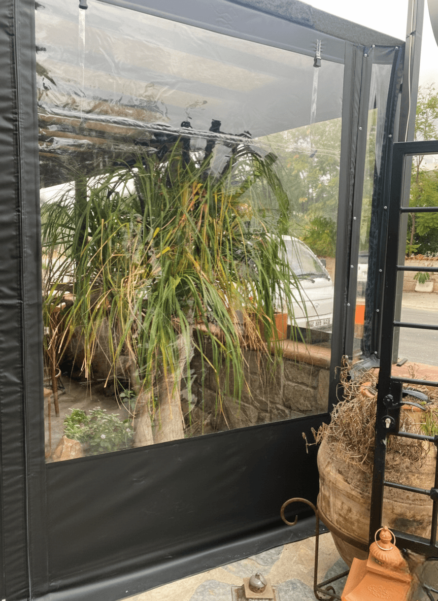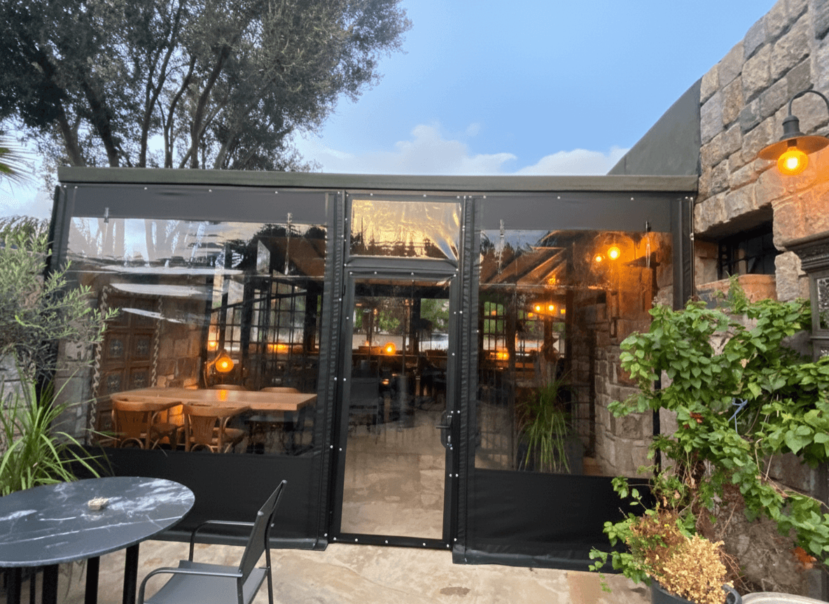 • Mimari Uyum ve Estetik: Mekanın taş duvarları ve modern dekorasyonuyla bütünleşen siyah PVC çerçeveler kullanılmış; bu yapı şeffaf mika ile özel ısı teknolojisiyle kaynatılarak sızdırmaz tek bir parça haline getirilmiştir.