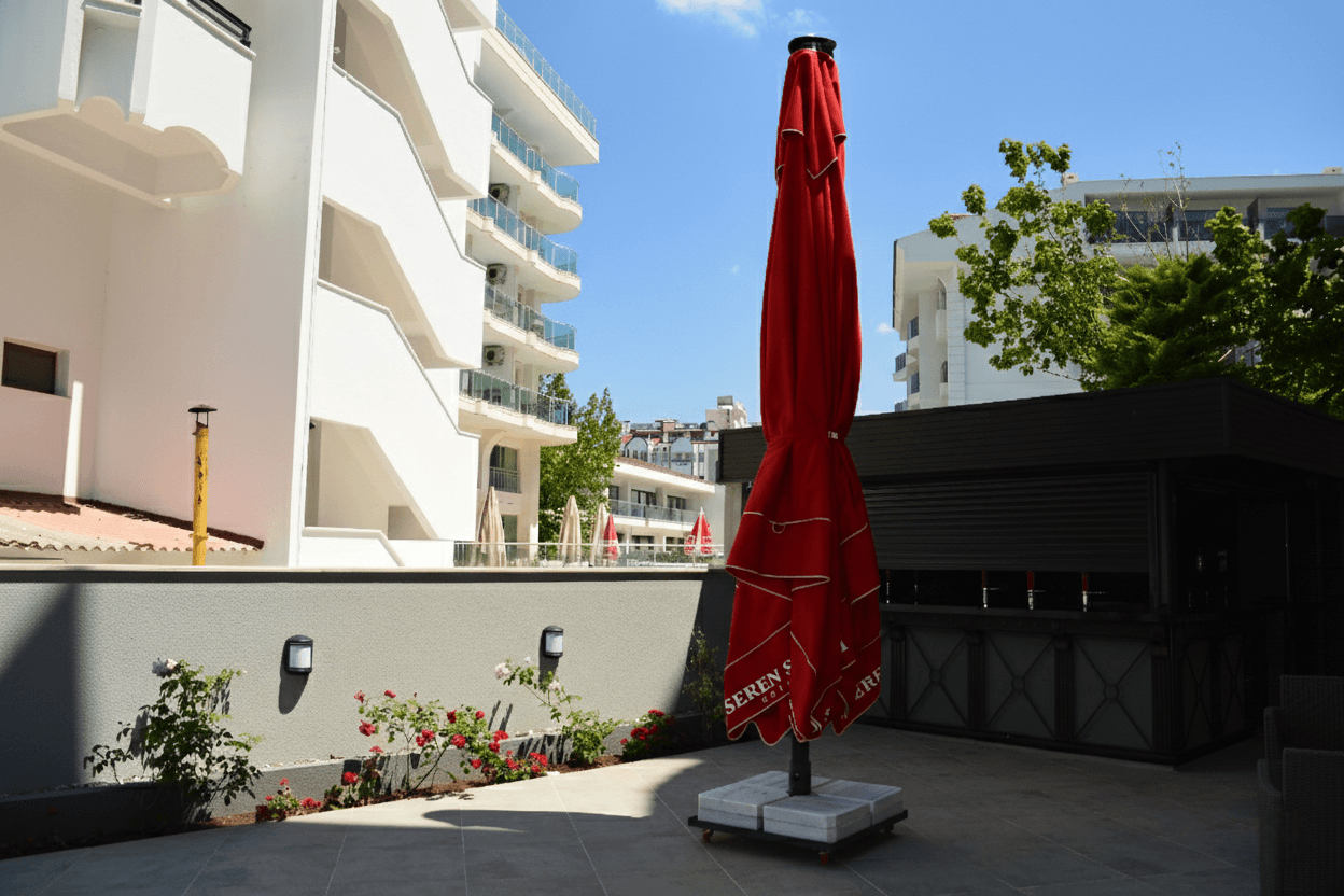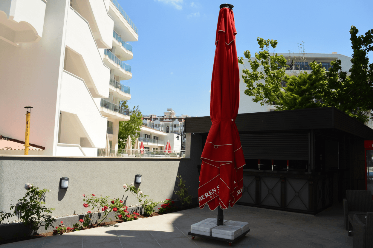 Marmaris’in sahil hattına yakın konumlanan Seren Sarı Otel, açık alanlarında ferahlık ve düzenli kullanım önceliğiyle tasarlanmış bir dış mekân kurgusu sunar. Bu alanlarda tercih edilen 99 Serisi – 500×500 Kare Şemsiye, sıra dışı ölçüsü sayesinde geniş teras ve dinlenme alanlarını tek bir gölgelendirme altında birleştirerek mekânsal bütünlük sağlar. Uzun aks boyunca ürettiği homojen gölge, gün boyu konforlu ve dengeli bir kullanım alanı oluşturur. 99 mm çapındaki güçlü orta borusu ve tamamen alüminyum taşıyıcı sistemiyle öne çıkan 99 Serisi, büyük açıklıklarda dahi yüksek stabilite ve uzun ömürlü performans sunar. Teleskopik kapanma yapısı, şemsiyenin kapatılırken masa ve oturma düzenine temas etmeden pratik biçimde kullanılmasına imkân tanır. Tepe bölümünde yer alan havalandırma sistemi ise geniş yüzeyli gölgelendirmelerde hava sirkülasyonunu destekleyerek açık alan konforunu artırır.