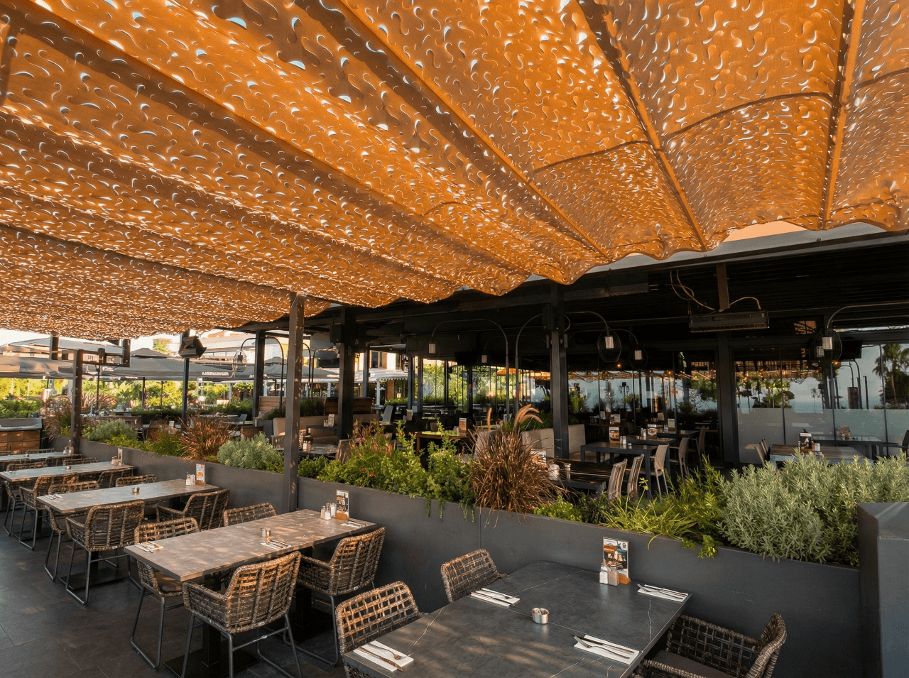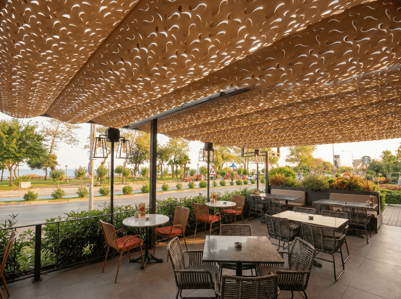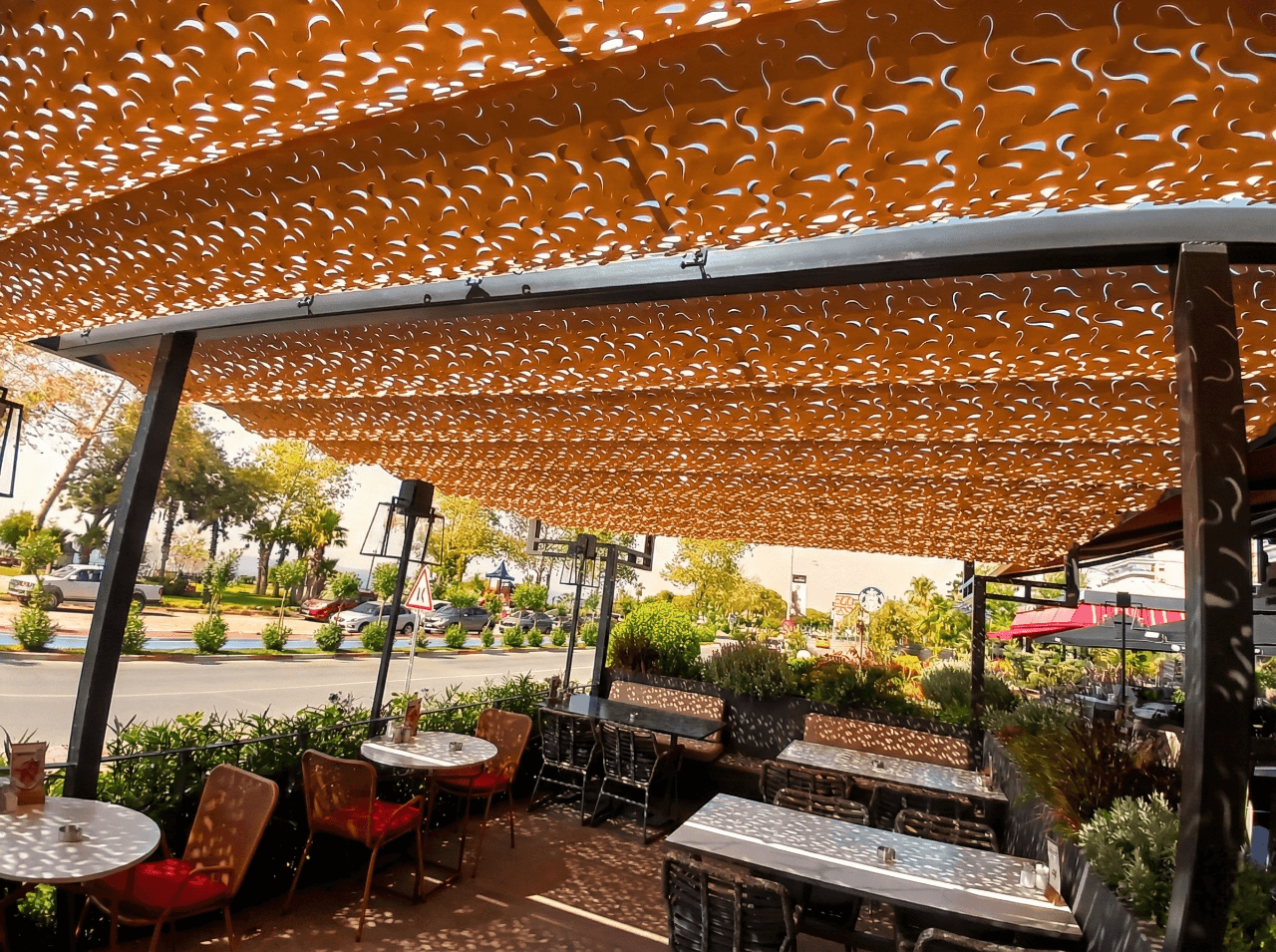 Antalya’nın dinamik ritmine ve Shakespeare’ nin modern çizgilerine, Selçuk Tente’ nin sanatsal mühendisliği ile eşlik ettik. Şehrin merkezinde, misafirlerinize ferah bir nefes alanı sunan çözümümüz: Telli Tente Sistemi. Bu prestijli projede, mekanın geniş teras alanına ve şehir dokusuna uyum sağlaması için CNC Kesim Kamuflaj Kumaş tercih ettik. Krom halatlar üzerinde bir akordiyon zarafetiyle süzülen sistem, Antalya’nın parlak güneşini bir sanatçı titizliğiyle filtreleyerek masalara masalsı gölge desenleri bırakıyor. Fotoğraflarda göreceğiniz o harika gölge, modern dış mekan mobilyaları ve yeşil peyzajla birleşerek Shakespeare misafirlerine yaşayan, dinamik ve serin bir atmosfer sunuyor. Şehrin kalbinde, tasarımın ve konforun buluştuğu nokta.