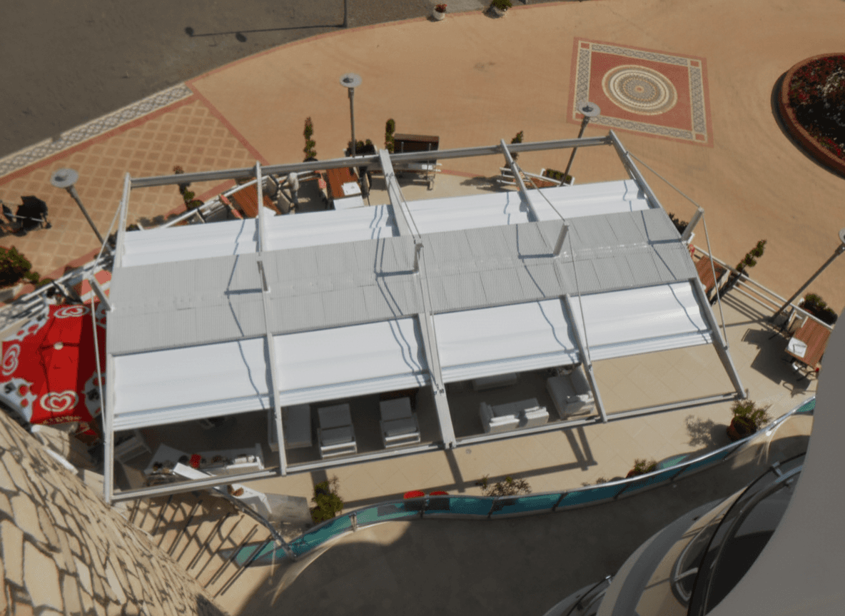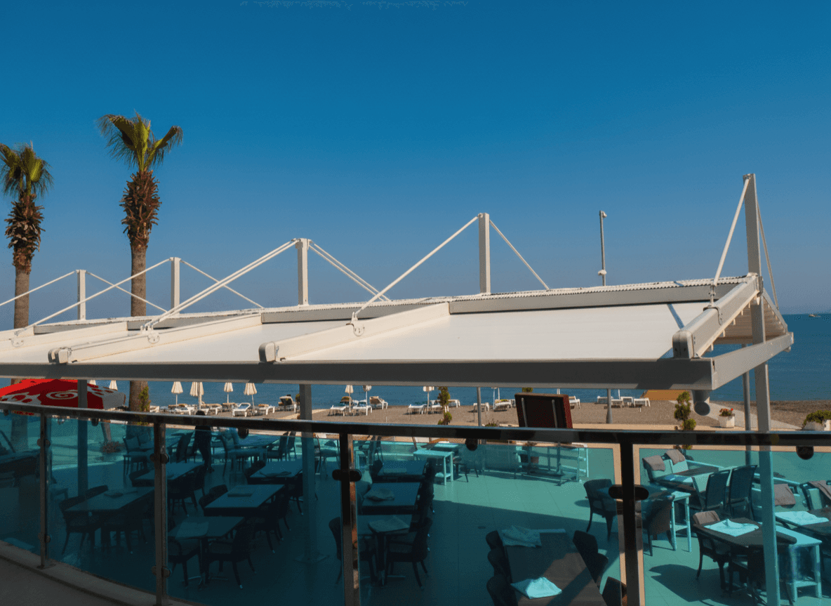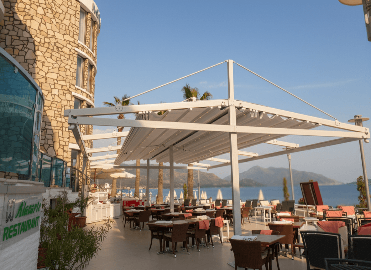 Marmaris’in eşsiz sahil bandında yer alan Sunrise Otel için, hem teknik hem de görsel bir şölen sunan Çift Taraflı Askılı Pergola (Raylı Tente) projemizi hayata geçirdik. Otelin denize sıfır restoran alanını, zeminde hiçbir taşıyıcı ayak kalabalığı yaratmadan, iki yöne birden açılan devasa bir koruma kalkanına dönüştürdük. Sunrais Otel projesini bir "çözüm harikası" kılan ayrıcalıklar şunlardır: