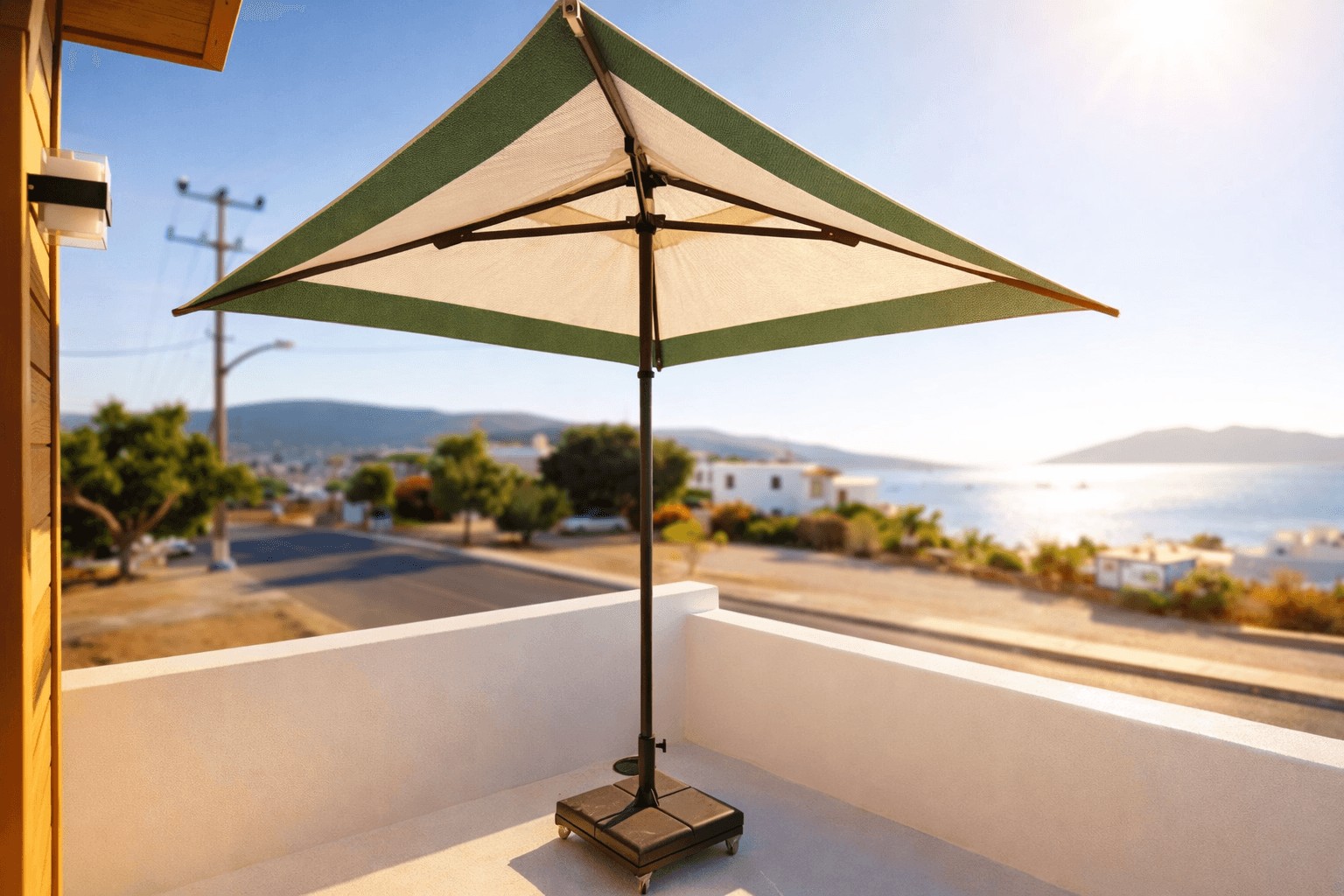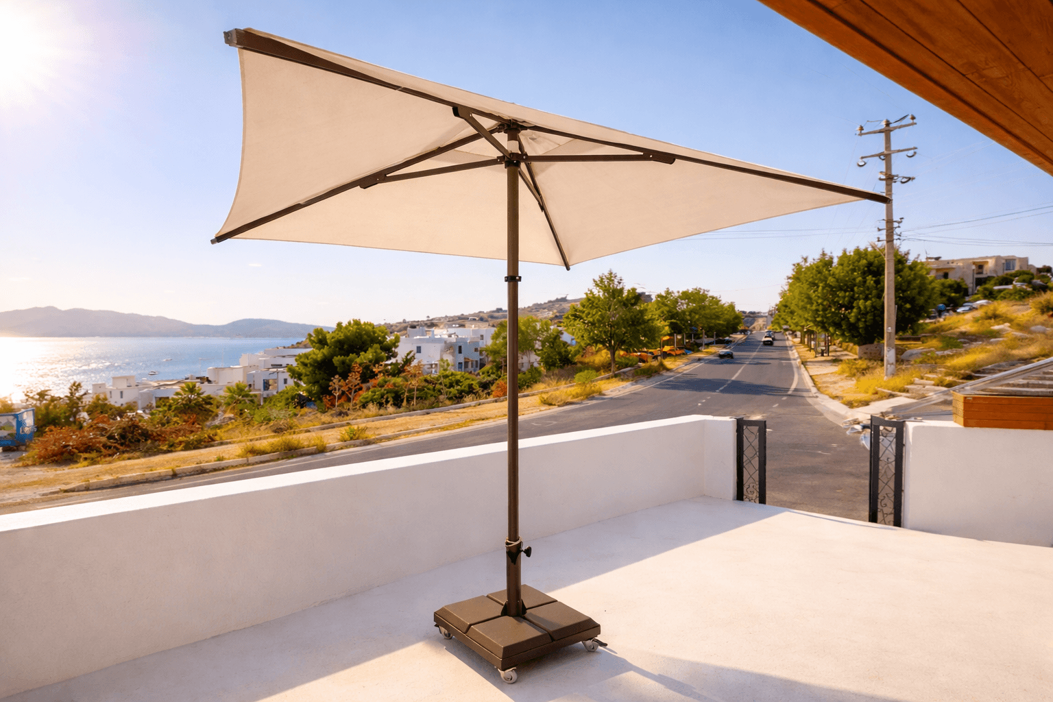 Bu projede kullanılan 50 Serisi 250x250 Kare Şemsiye, mimari uyum, üst segment malzeme kalitesi ve uzun ömürlü performansı bir arada sunar.