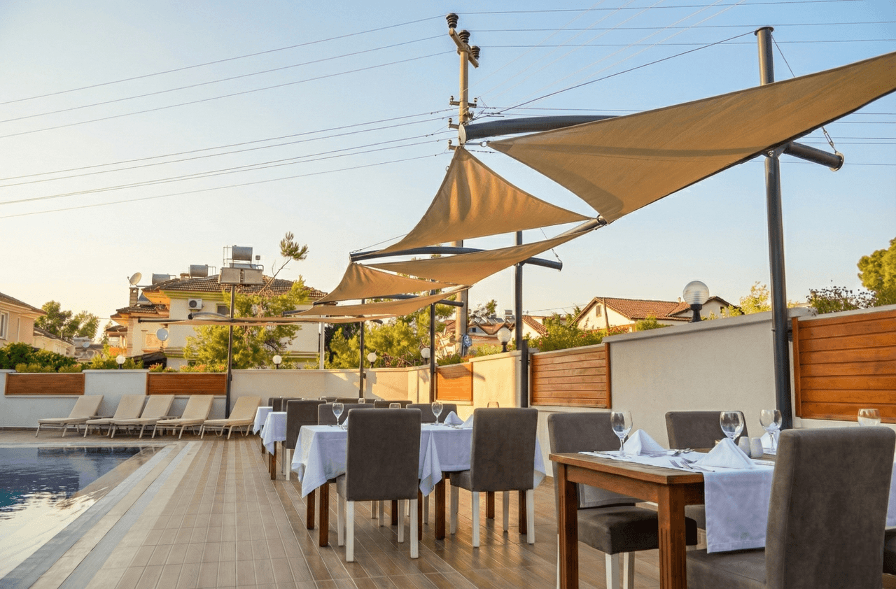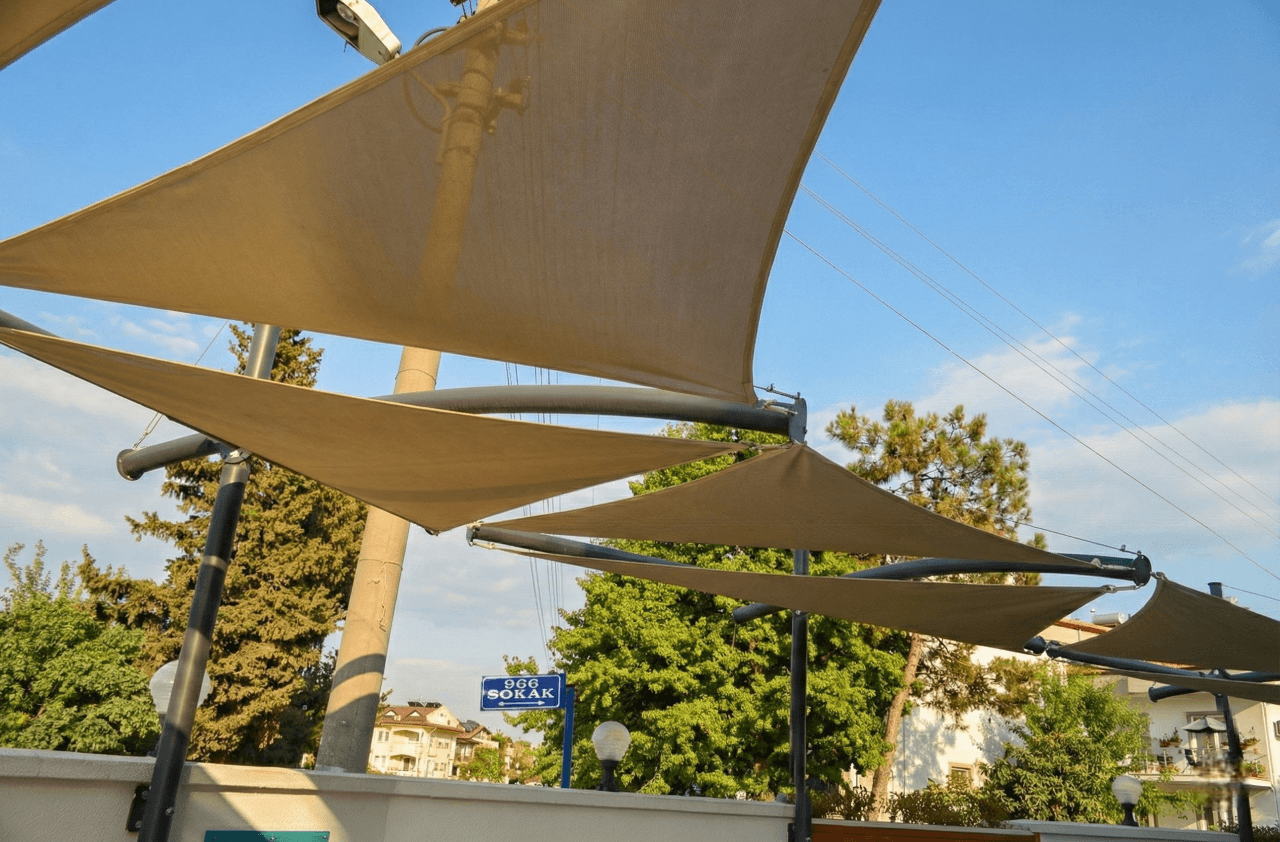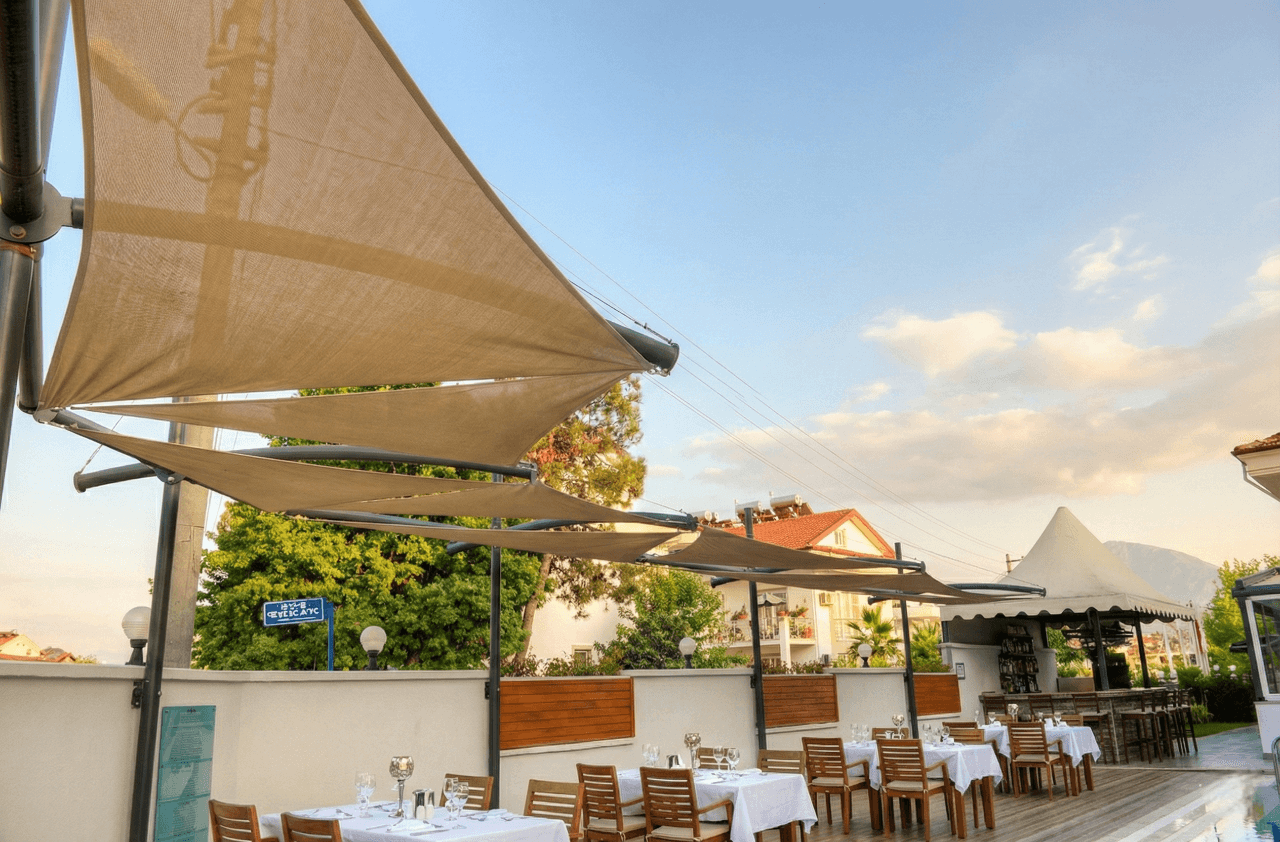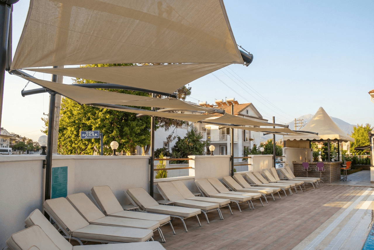 Fethiye’ nin huzurlu atmosferinde butik hizmet anlayışıyla öne çıkan Tiryaki Boutique Hotel için, havuz ve dinlenme alanlarını modern birer sanat eserine dönüştürdük. Otelin estetik ve konforu birleştiren kimliğini desteklemek amacıyla, mekana mimari bir derinlik katan Yarasa Tente sistemimizi hayata geçirdik. Bu projede, havuz çevresinde güneşin yakıcı etkisini kırmak ve misafirlere ferah bir gölge alanı yaratmak hedeflenmiştir. Selçuk Tente kalite farkıyla tasarlanan bu uygulama, mekanın yapısına göre kurgulanan asimetrik formlarıyla dekorasyonu zenginleştirmektedir. Tamamen yaz aylarının keyfini çıkarmak ve estetik bir hava yaratmak için tasarlanan bu sistemde, yüksek malzeme kalitesini şu teknik detaylarla mühürledik: