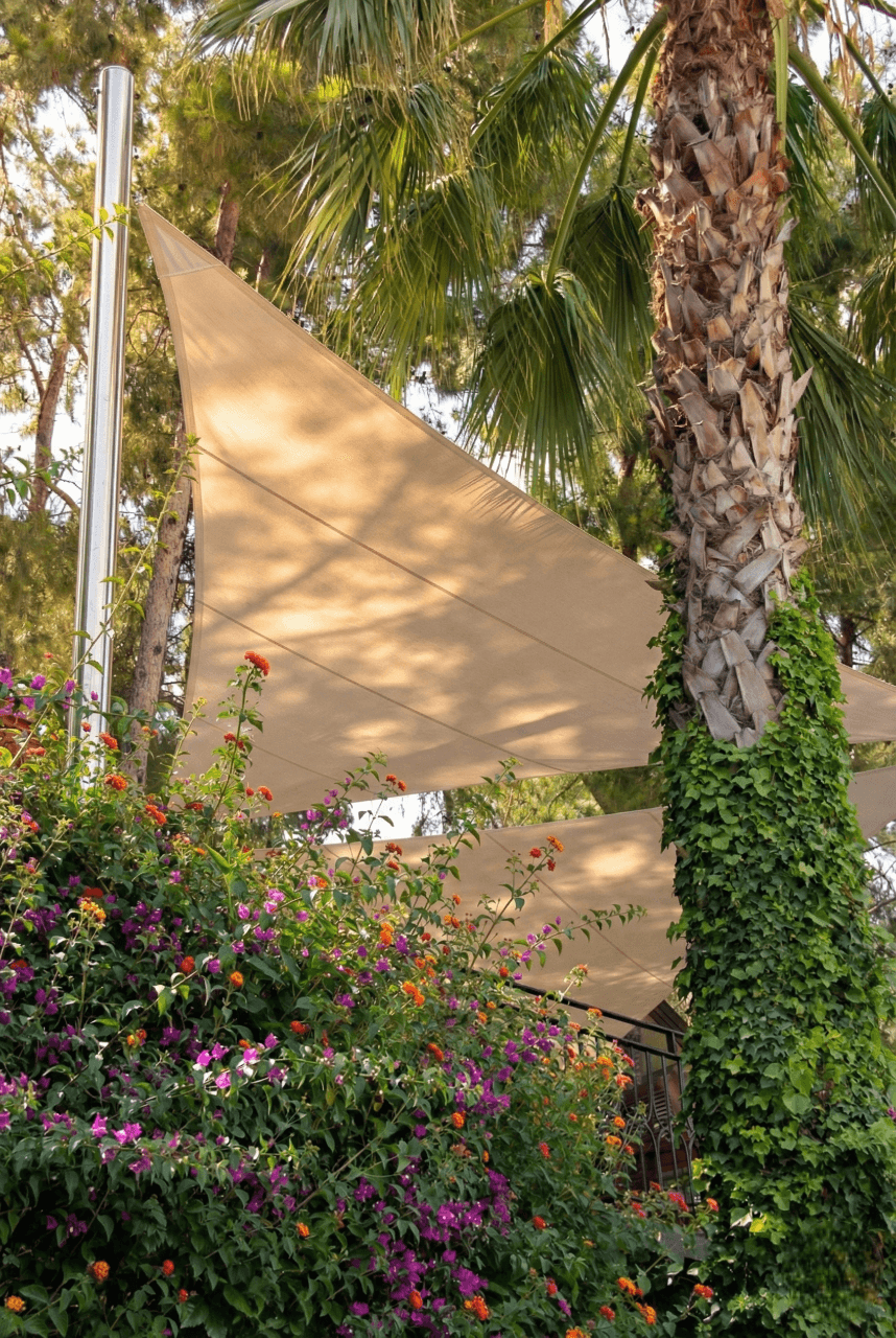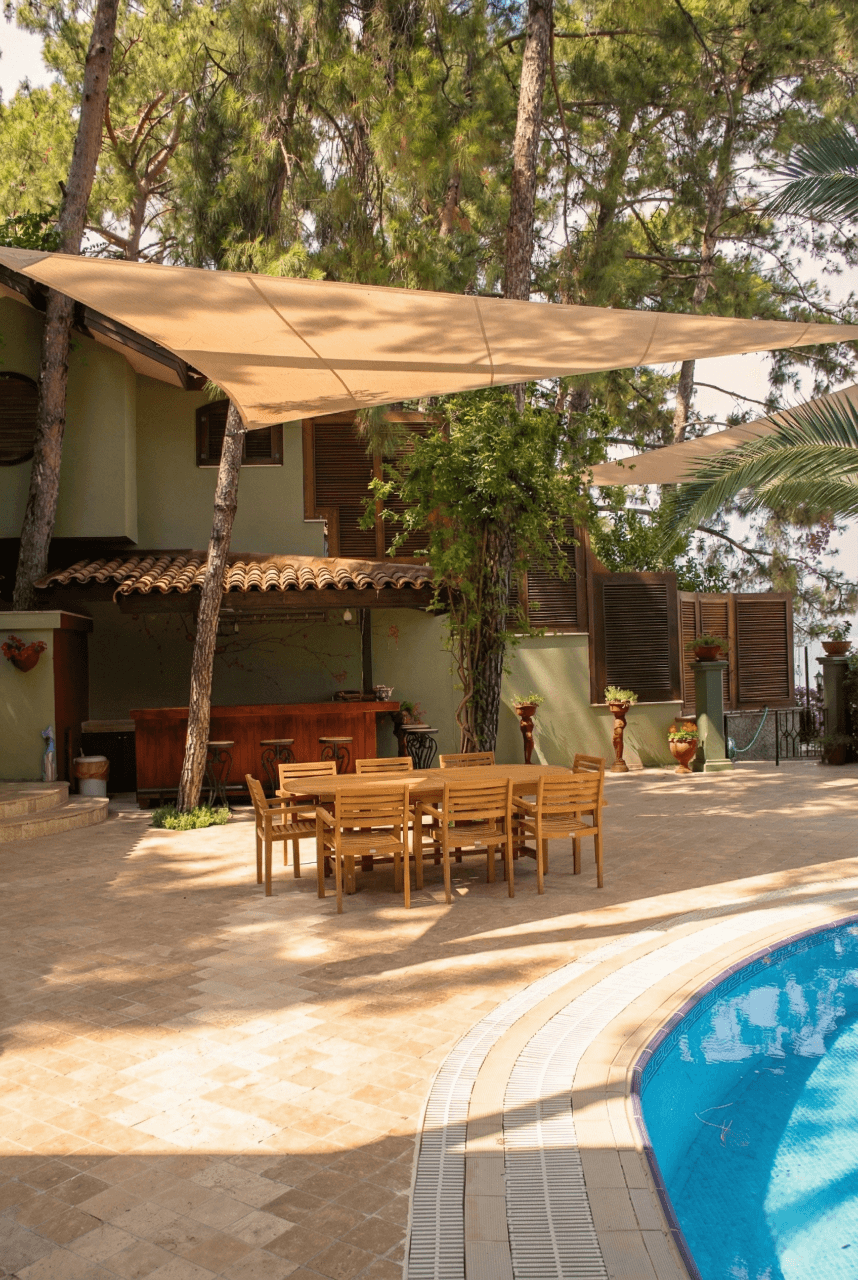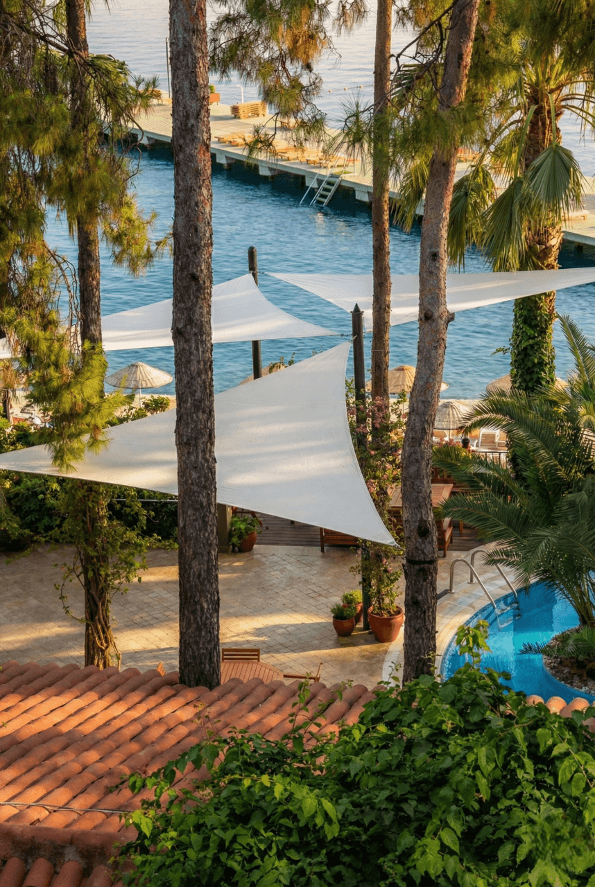 Marmaris’ in çam ormanlarıyla denizin kucaklaştığı eşsiz bir noktada yer alan Turban Yazıcı Otel’de, doğanın kalbinde sanatsal bir gölgelendirme projesine imza attık. Tesisinasırlık ağaçlar ve zengin peyzajla çevrili dış mekan sosyal alanlarını, mimari birer odak noktasına dönüştürmek amacıyla Yarasa Tente sistemimizi tercih ettik. Bu projede, hem estetik duruşu hem de yüksek güneş koruma performansıyla bilinen ithal akrilik kumaş kullanılmıştır. Turban Yazıcı Otel’ in o meşhur yeşil dokusu içerisinde, ağaçların arasından süzülen bir sanat eseri gibi kurgulanan bu tasarım, mekana modern bir hava katarken aynı zamanda dekoratif bir ferahlık sunmaktadır. Selçuk Tente kalite farkıyla hayata geçirilen bu uygulamada, Marmaris’in nemli ve güneşli sahil iklimine karşı şu teknik detayları titizlikle uyguladık: