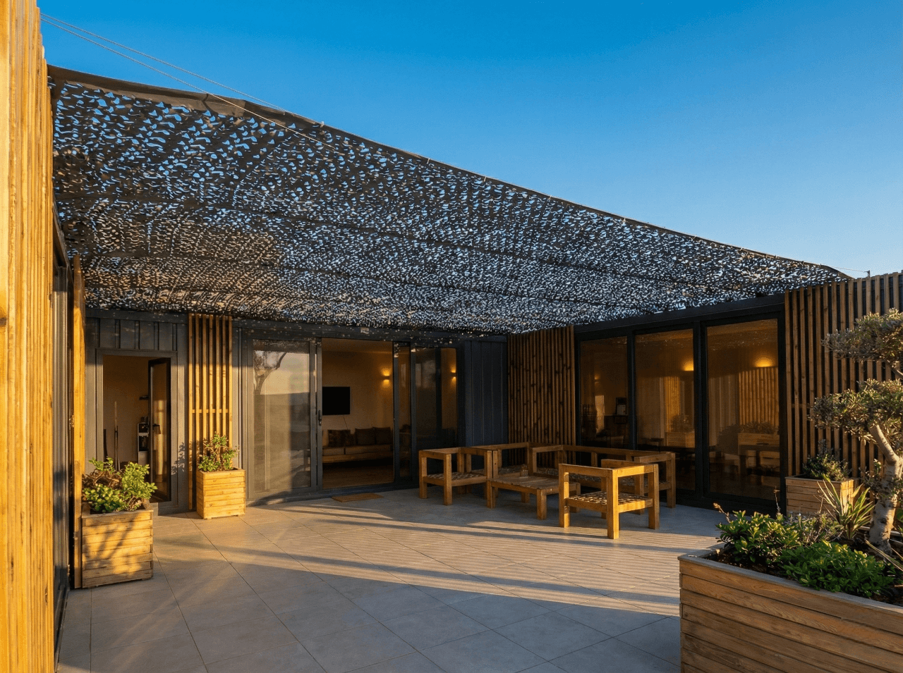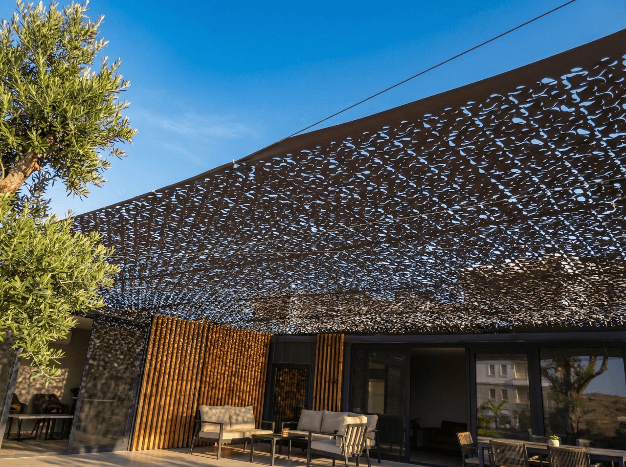 Türkiye’nin en popüler tatil destinasyonlarından biri olan Çeşme’ de, modern ve minimalist bir konaklama deneyimi sunan Vagoon Çeşme projesi için yüksek mukavemetli bir gölgelendirme çözümü sunduk. Mobil yaşam alanlarının dış mekan konforunu artırmak amacıyla, Sabit Tente iskeleti üzerine uyguladığımız Kamuflaj Kumaş CNC Kesim ürünümüz, Çeşme’nin dinamik ve özgür ruhuyla kusursuz bir uyum yakaladı.