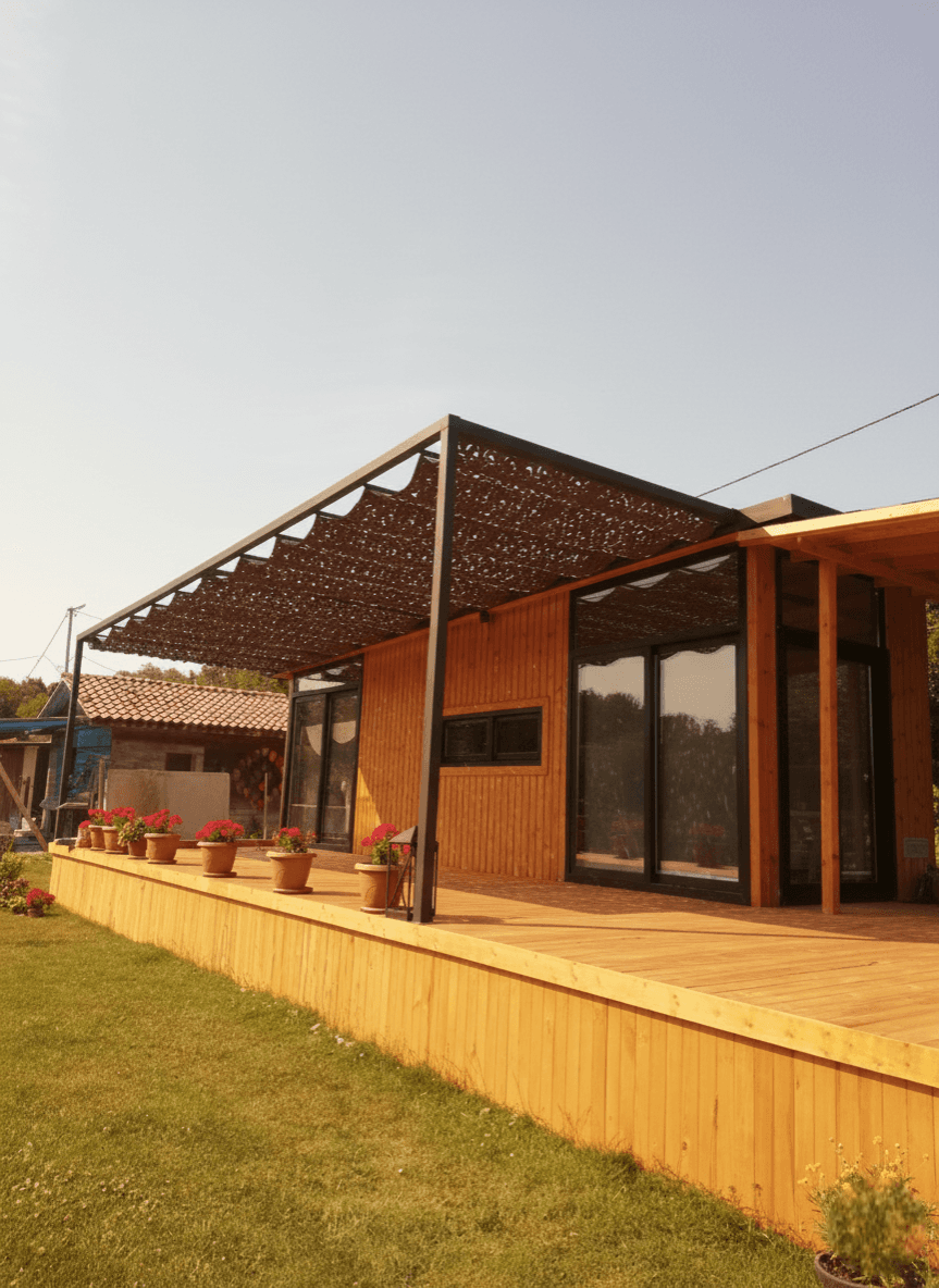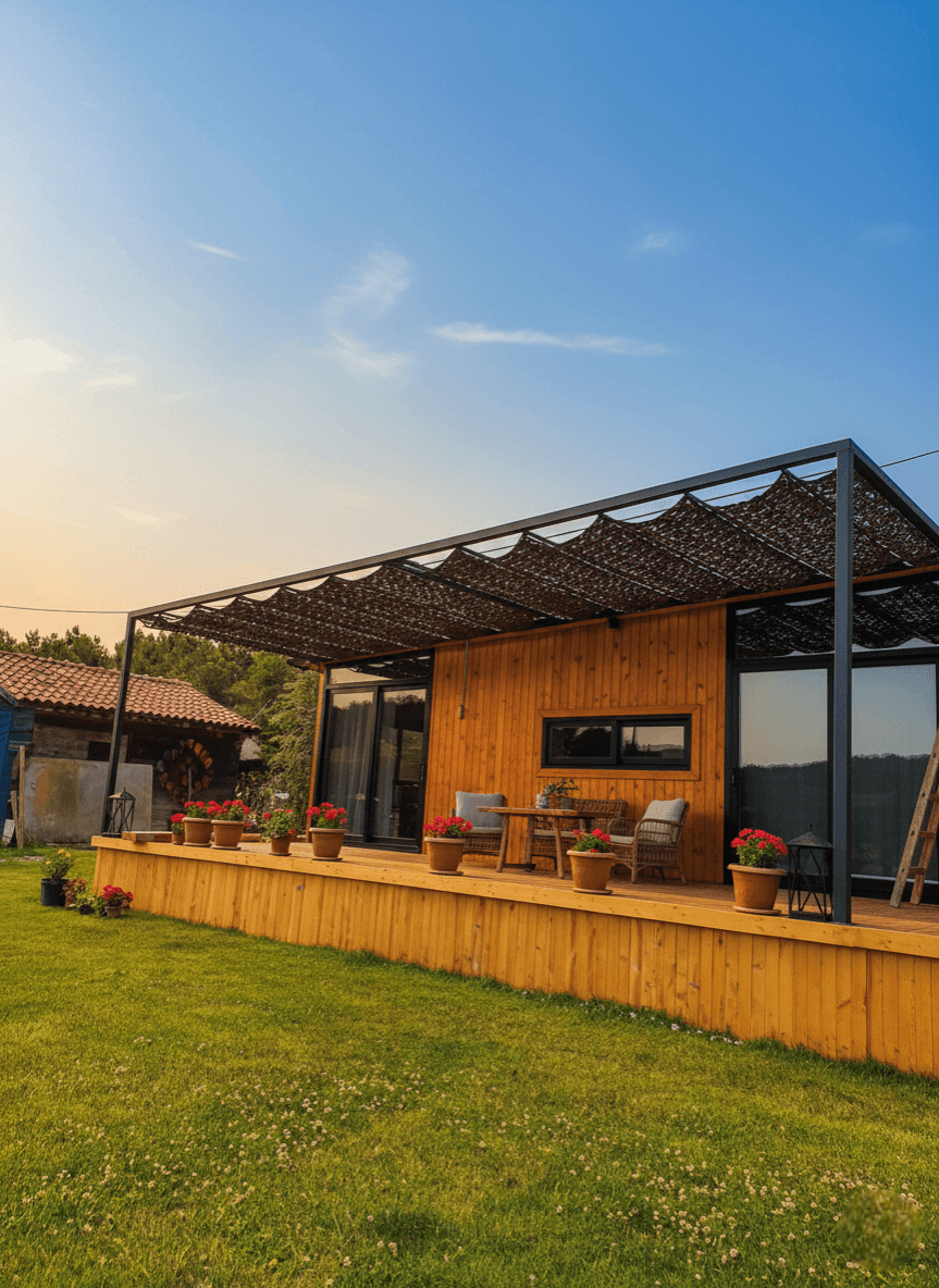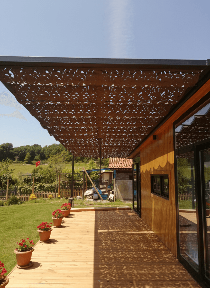 minimalist yaşamı Selçuk Tente'nin estetik vizyonuyla taçlandırdık. Modern ahşap mimarinin en şık hallerinden biri olan bu "Tiny House"da, dış mekan konforunu bir üst seviyeye taşıyan çözümümüz: Telli Tente Sistemi. Bu butik projede, ahşabın sıcak tonları ve evin antrasit detaylarıyla tam bir uyum yakalaması için CNC Kesim Koyu Ton Kamuflaj Kumaş tercih ettik. Krom halatlar üzerinde bir akordiyon zarafetiyle süzülen sistem, İstanbul’un güneşini filtreleyerek veranda üzerine masalsı gölge desenleri bırakıyor. Fotoğraflarda göreceğiniz gibi; kamuflaj doku, evin önündeki geniş bahçeyle bütünleşerek ev sahiplerine gölge altında huzur dolu bir yaşam alanı sunuyor.