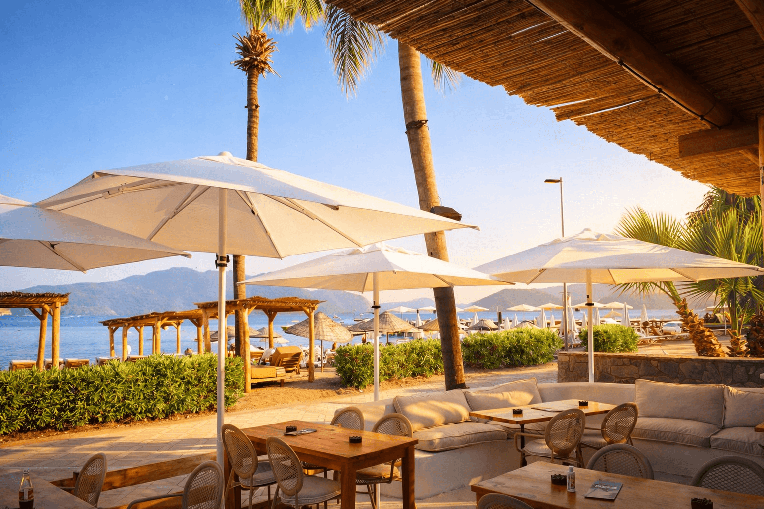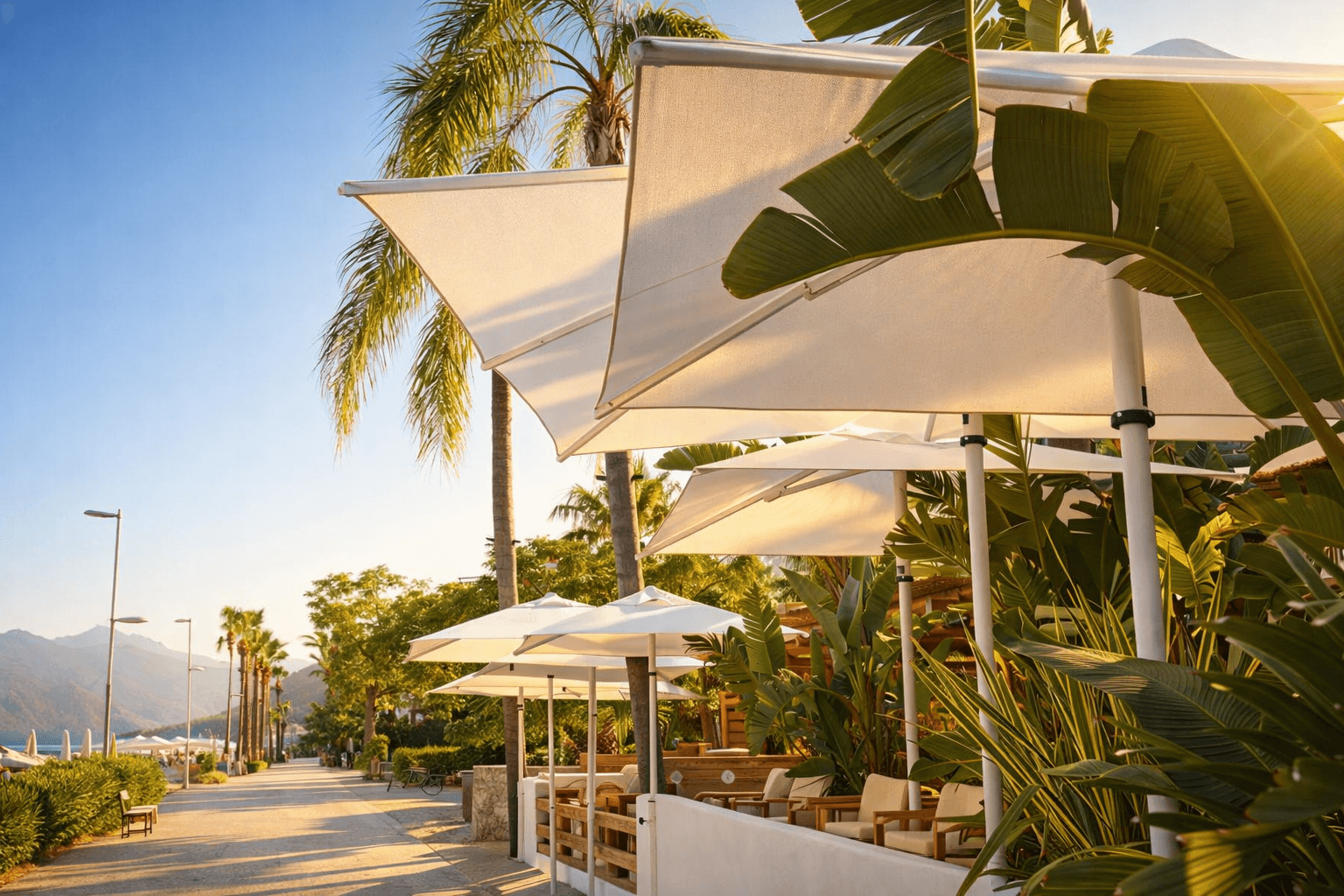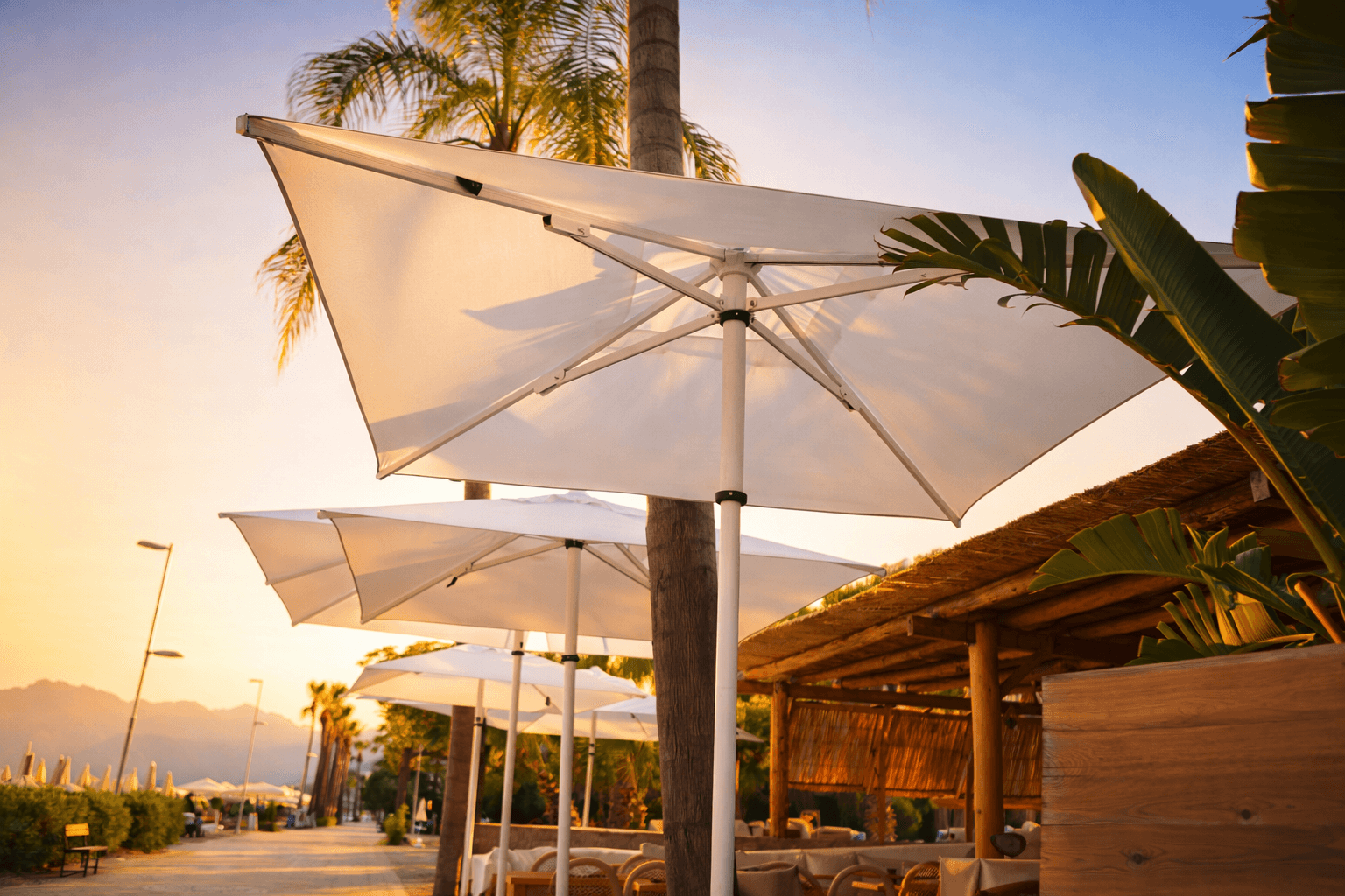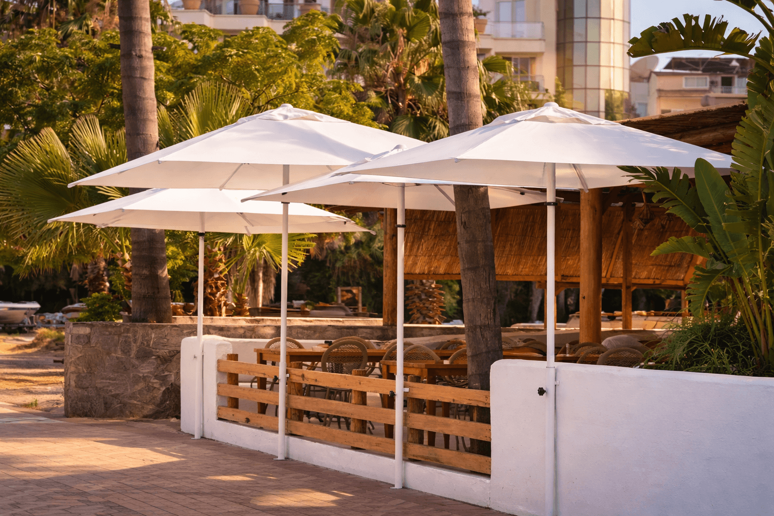 Vamos Beach’in ferah ve doğal atmosferinde konumlandırılan 50 Serisi 200x200 Kare Şemsiyemiz, sahil konseptine zarif bir gölgelendirme dili kazandırıyor. Net hatlara sahip kare formu ve açık renk kumaşıyla alanın ferahlığını destekleyen ürünümüz, misafir deneyimini konforlu ve rafine bir seviyeye taşıyor. Deniz kenarı işletmeleri için estetikten ödün vermeyen profesyonel bir uygulamadır.