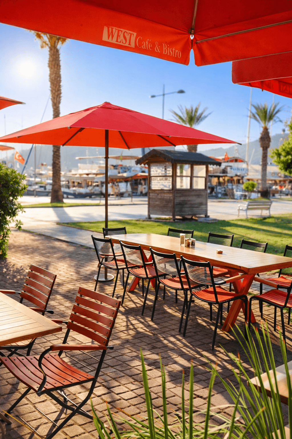 Göcek’in marina hattına yakın, gün boyu güneş alan açık oturma düzeniyle öne çıkan West Cafe – Göcek, misafir konforunu artırmak ve mekân estetiğini korumak amacıyla Selçuk Tente 50 Serisi 300x300 Kare Şemsiye sistemini tercih etmiştir. Denizden yansıyan yoğun ışık ve sıcak yaz günleri düşünüldüğünde, doğru gölgelendirme çözümü işletme için belirleyici bir unsurdur.