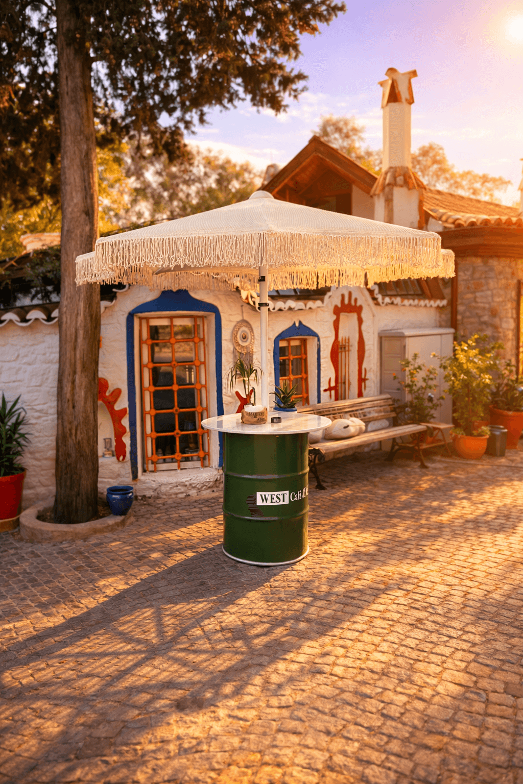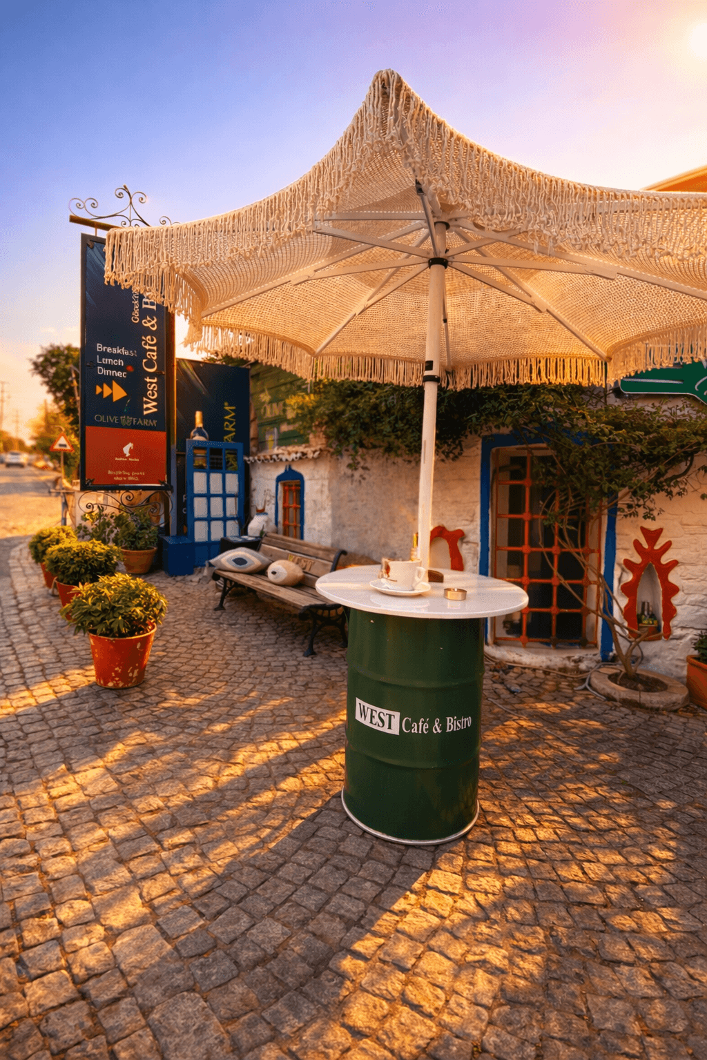 Akyaka’nın doğal mimarisi ve sakin sahil atmosferiyle öne çıkan West Cafe, açık alan konforunu güçlendirmek için Selçuk Tente 50 Serisi Şemsiye çözümlerini tercih etmiştir. Doğayla uyumlu tasarımıyla dikkat çeken uygulama, misafirlerin gün boyu dengeli ve ferah bir gölgede vakit geçirmesini sağlar. 50 mm çapındaki güçlü orta borusu ve alüminyum ağırlıklı taşıyıcı yapısı sayesinde 50 Serisi, Akyaka’nın güneşli ve rüzgâra açık sahil koşullarında yüksek stabilite sunar. Kilitlemeli açma-kapama sistemi, işletme temposunda pratik kullanım avantajı sağlarken; sade formu ve doğal dokusuyla West Cafe’nin özgün karakterini tamamlar. Işığı yumuşak biçimde süzen kumaş yapısı, açık alanda konforlu ve davetkâr bir ambiyans oluşturur.