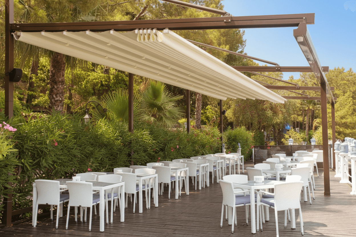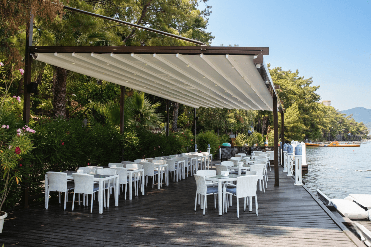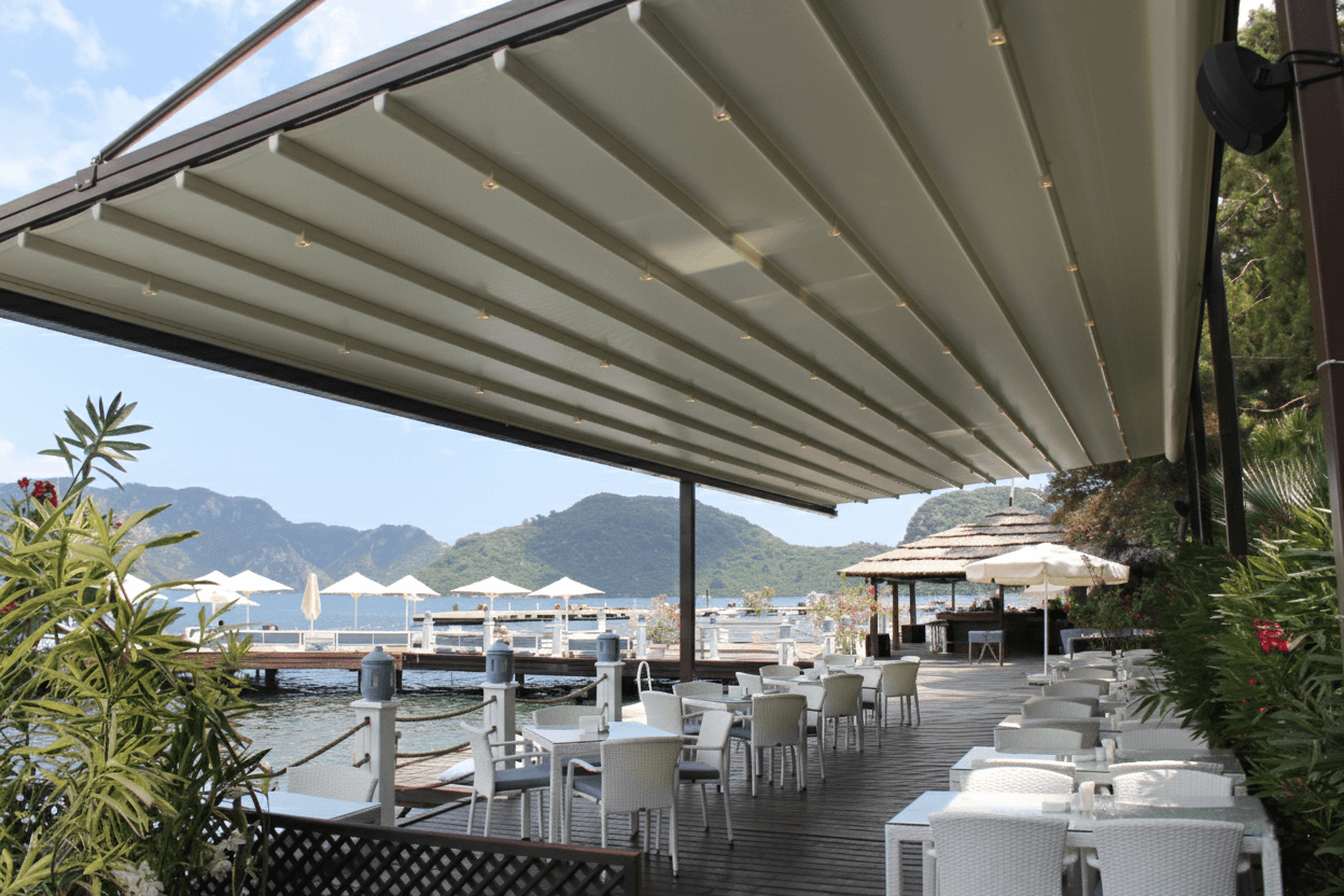 Marmaris yat limanı ve sahil bandının simge tesislerinden Yazıcı Beach Otel için, estetik ve mühendisliği birleştiren Askılı Sistem Pergola (Raylı Tente) projemizi hayata geçirdik. Otelin denize uzanan iskele ve teras alanında, misafirlerin manzarasını kesintisiz korumak amacıyla zemine basan direkler yerine, üstten çelik destekli özel askı mekanizmalarını tercih ettik. Yazıcı Beach projesinde Selçuk Tente uzmanlığıyla fark yaratan "çözüm" detayları şunlardır: