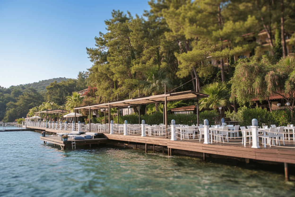 • Engelsiz Manzara ve Askılı Sistem: Sistemin taşıyıcıları zeminde yer kaplamadığı için otelin sahil terası tamamen ferah kalmış; bu sayede misafirlerin denizle olan bağı hiçbir direk engeline takılmadan korunmuştur.
