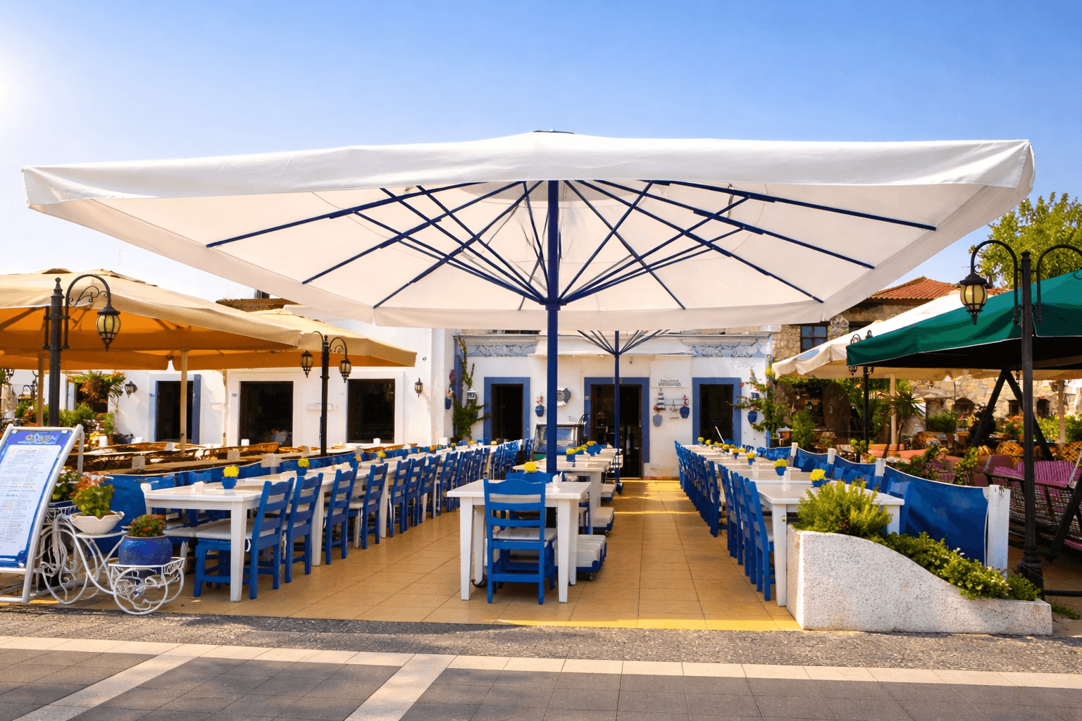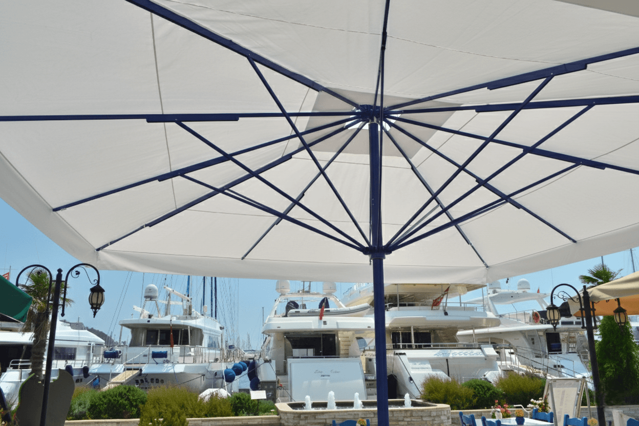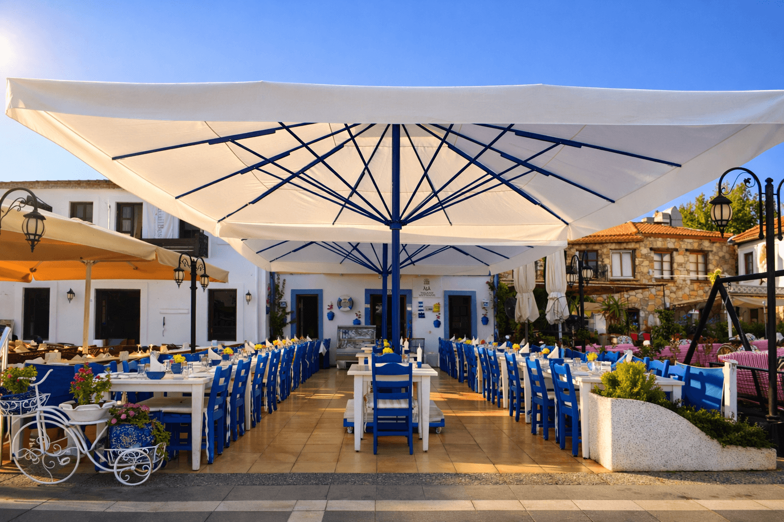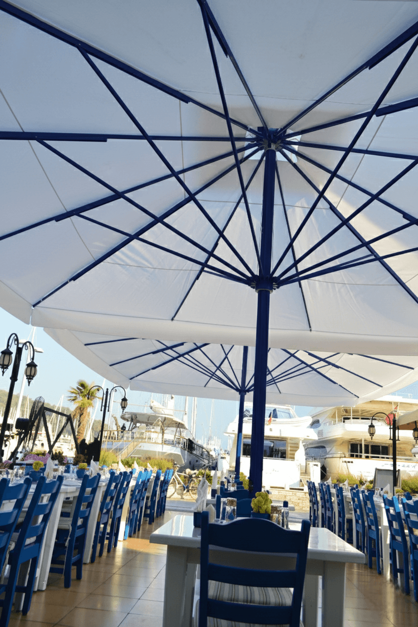 Selçuk Tente 99 Serisi – 600×600 Kare Şemsiye, Yelken Restoran’ın Marmaris Marina’daki açık alanlarında geniş kapsama, yapısal güç ve uzun ömürlü kullanım avantajlarını bir arada sunar.