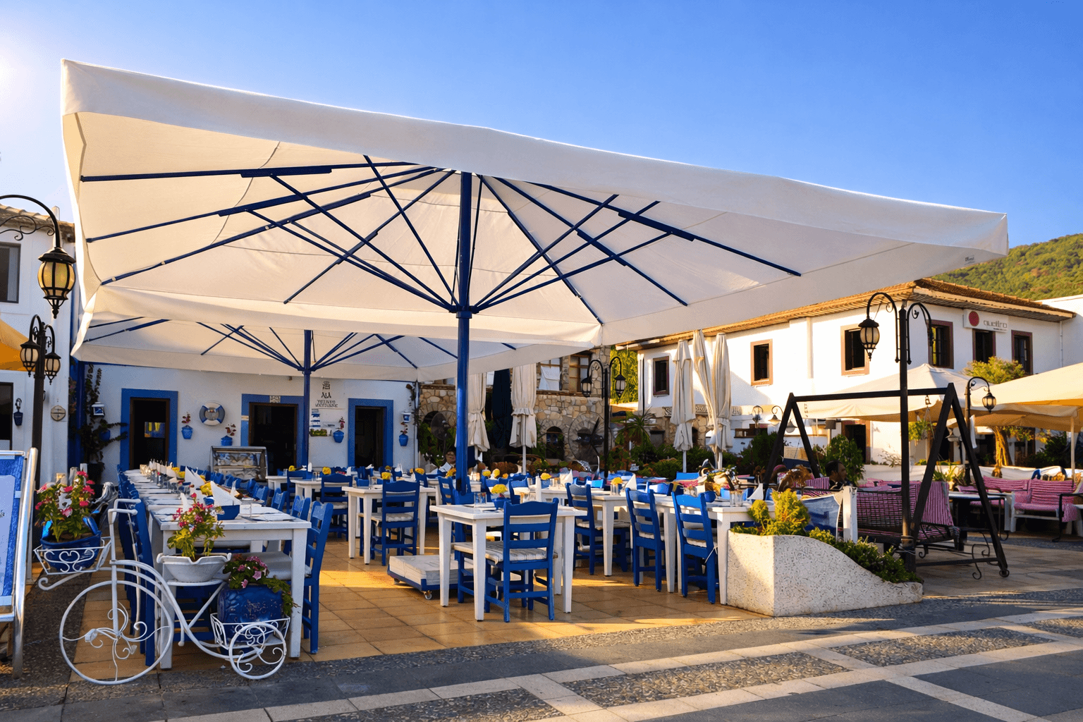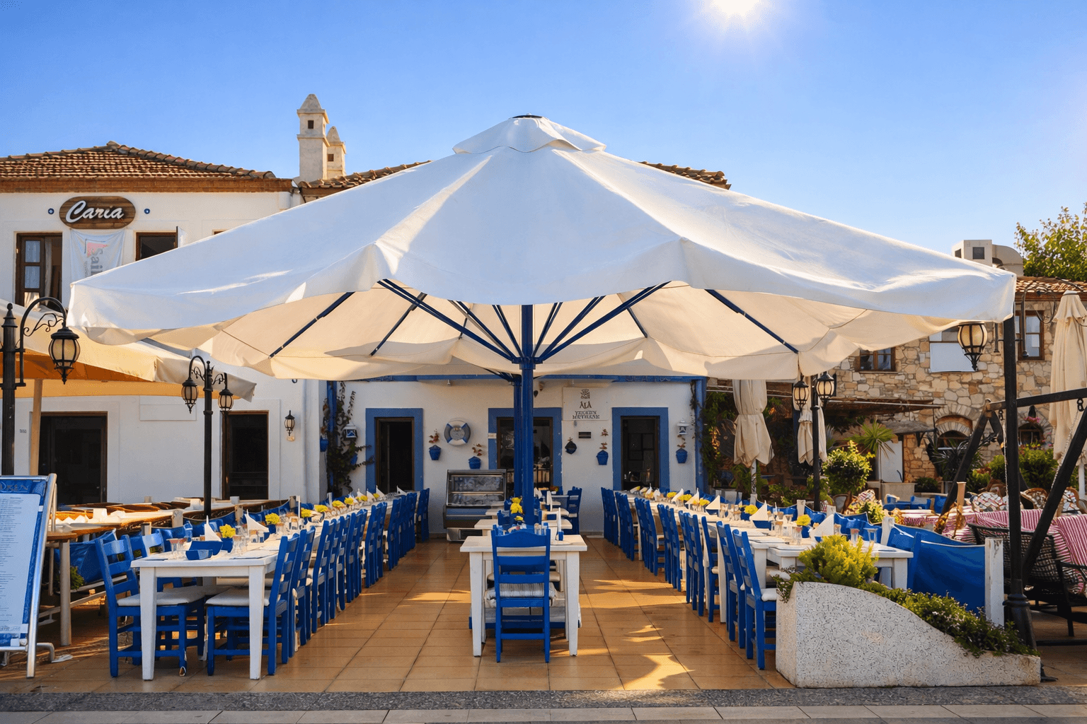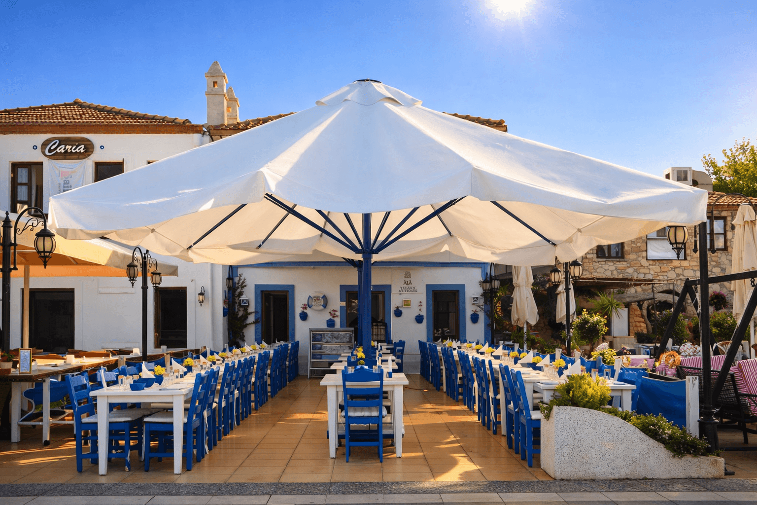 Selçuk Tente 99 Serisi – 600×600 Kare Şemsiye, Yelken Restoran’ın Marmaris Marina’daki açık alanlarında geniş kapsama, yapısal güç ve uzun ömürlü kullanım avantajlarını bir arada sunar.