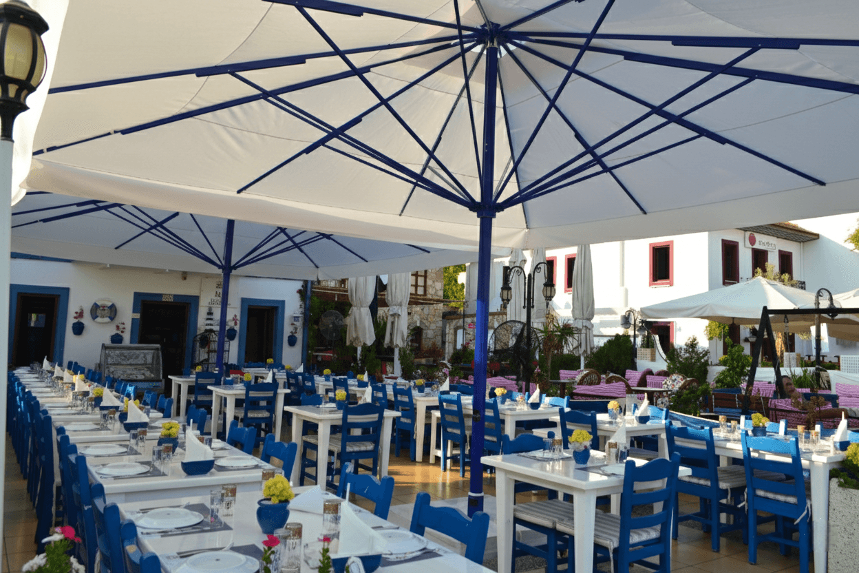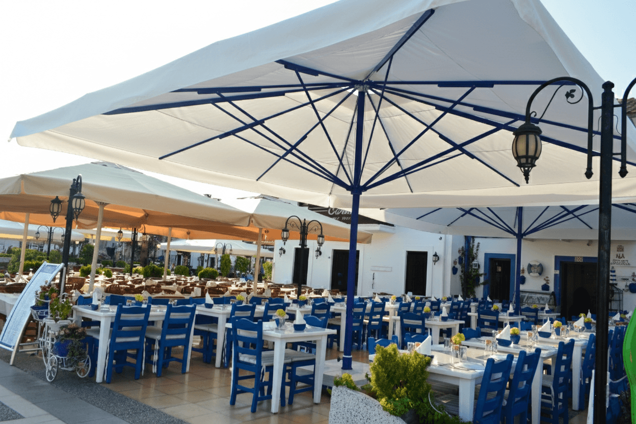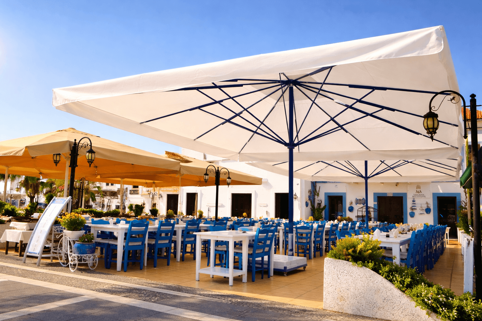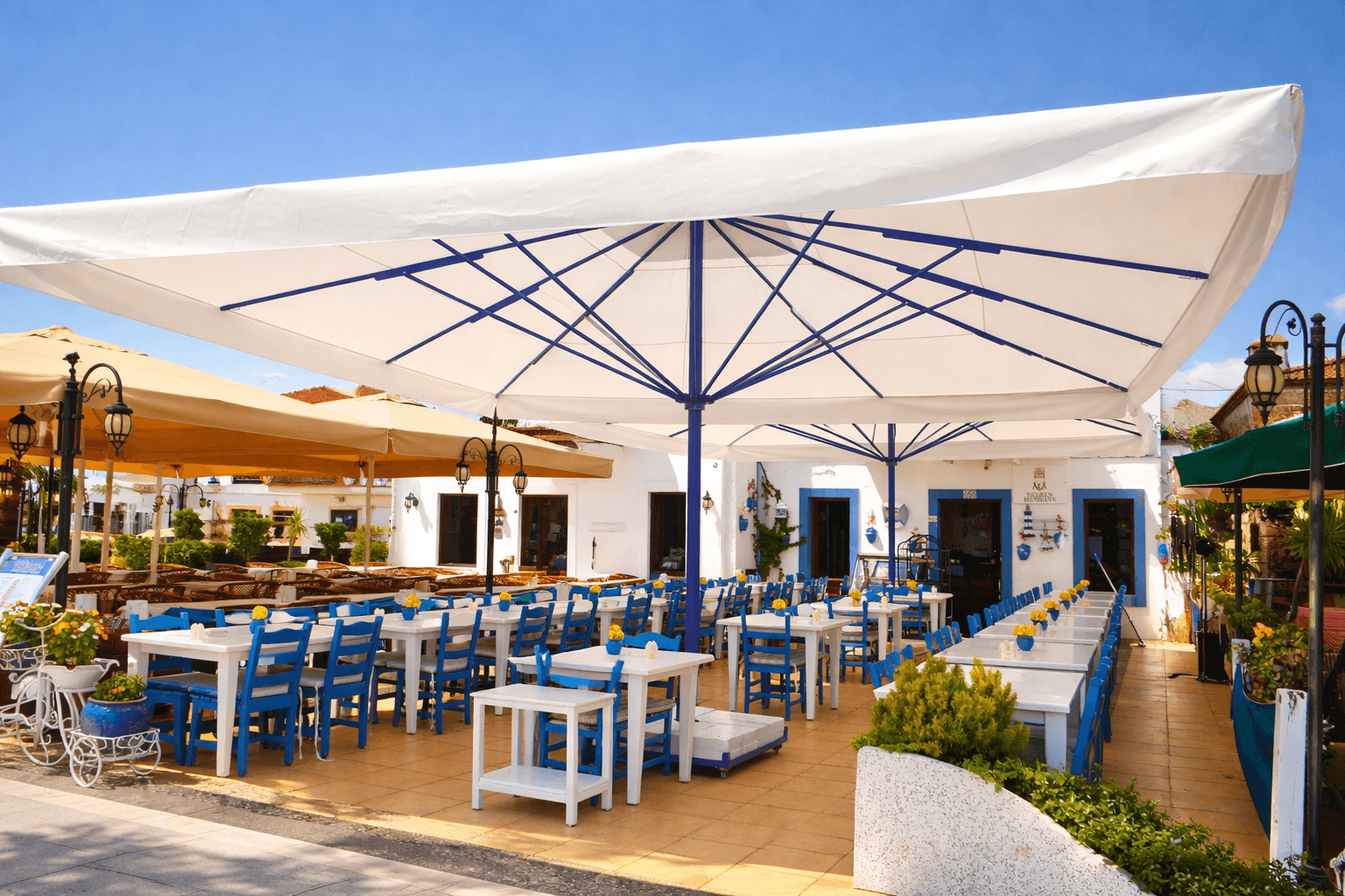 Selçuk Tente 99 Serisi – 600×600 Kare Şemsiye, Yelken Restoran’ın Marmaris Marina’daki açık alanlarında geniş kapsama, yapısal güç ve uzun ömürlü kullanım avantajlarını bir arada sunar.