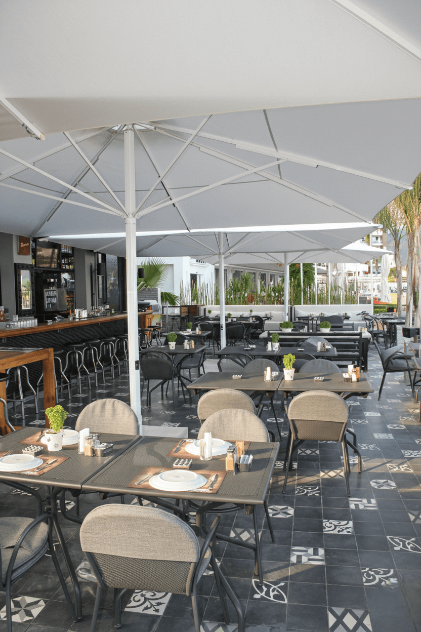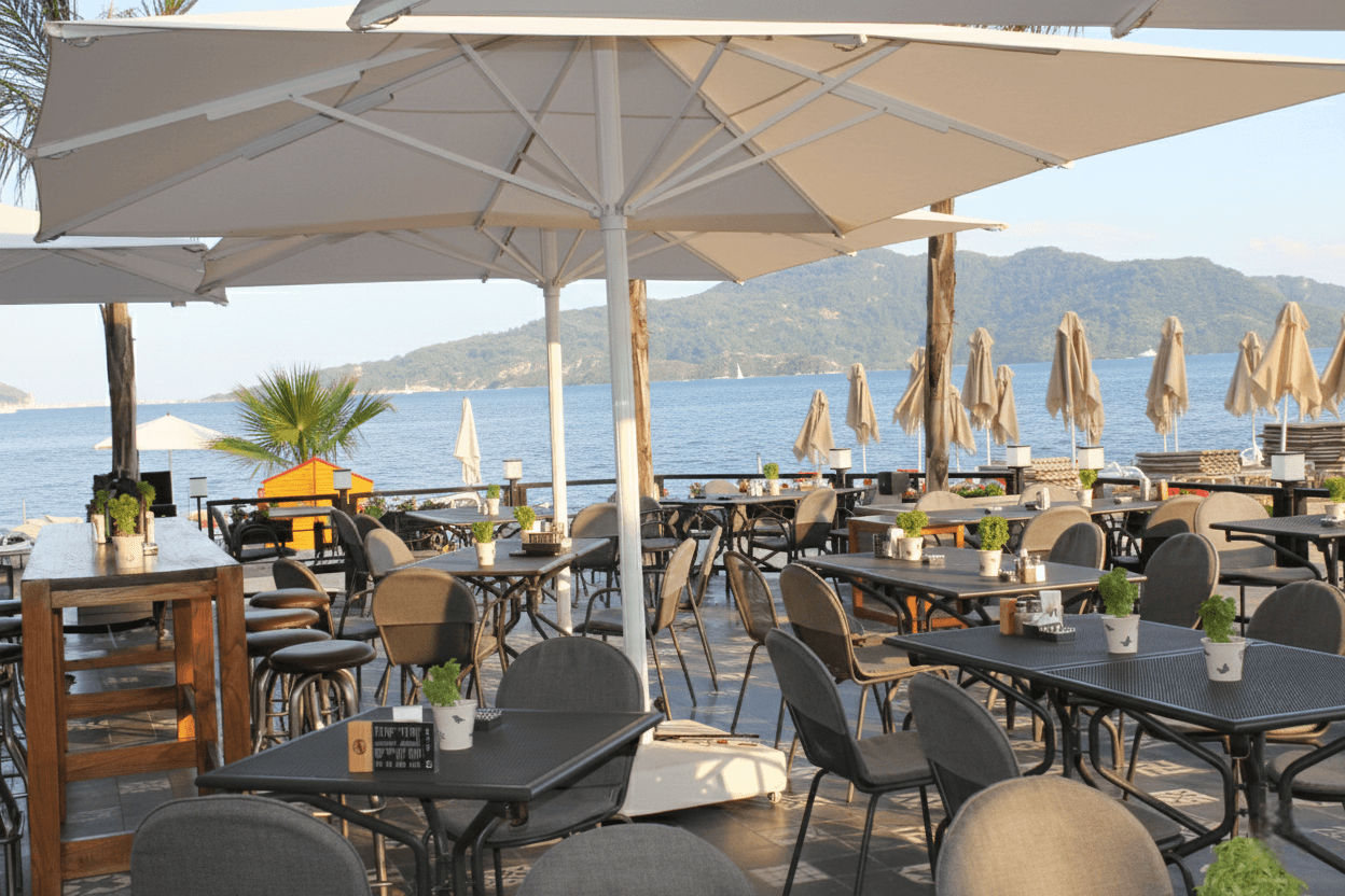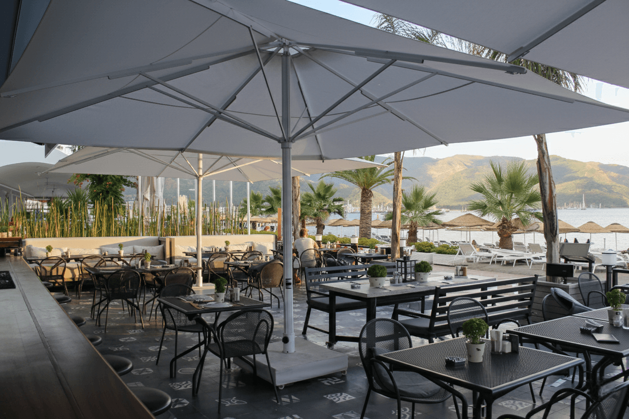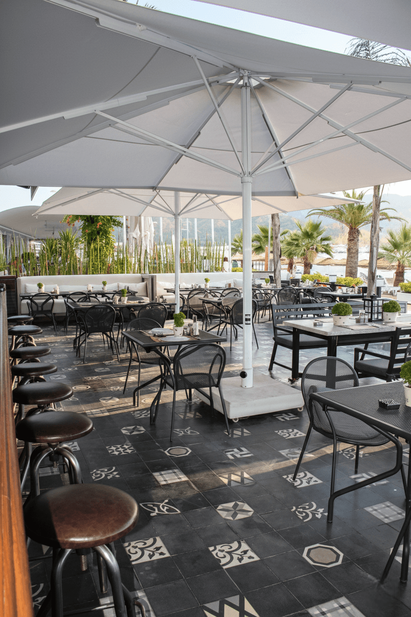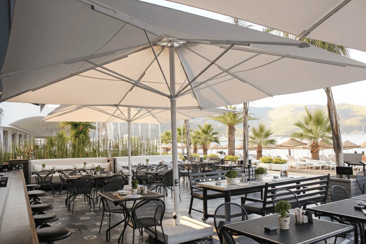 Marmaris sahilinde konumlanan Yunus Otel, misafirlerine denizle iç içe, konfor odaklı bir açık alan deneyimi sunar. Teras ve dinlenme alanlarında tercih edilen 99 Serisi – 400×400 Kare Şemsiye, geniş kare formu sayesinde çoklu oturma düzenlerini tek bir gölgelendirme altında toplayarak ferah, dengeli ve kesintisiz bir kullanım alanı oluşturur. 400×400 ölçüsü, manzarayı bölmeden homojen gölge sağlayarak gün boyu yüksek konfor sunar. 99 mm çapındaki güçlü orta borusu ve tamamen alüminyum taşıyıcı yapısıyla öne çıkan 99 Serisi, büyük açıklıklarda dahi maksimum stabilite sağlar. Teleskopik kapanma mekanizması, şemsiye kapatılırken masa ve mobilyalara temas etmeden pratik bir kullanım sunarken; tepe bölümünde yer alan havalandırma sistemi açık alanlarda dengeli bir hava sirkülasyonu oluşturur. Uzaktan kumandalı açma-kapama ve entegre LED aydınlatma özellikleri, özellikle akşam saatlerinde Yunus Otel’in sahil atmosferini fonksiyonel biçimde tamamlar.