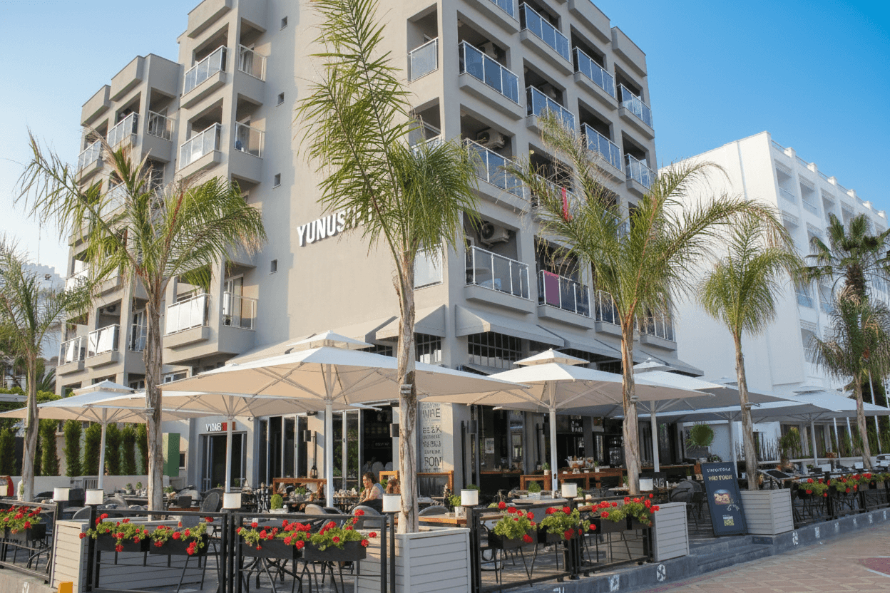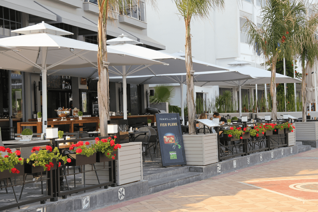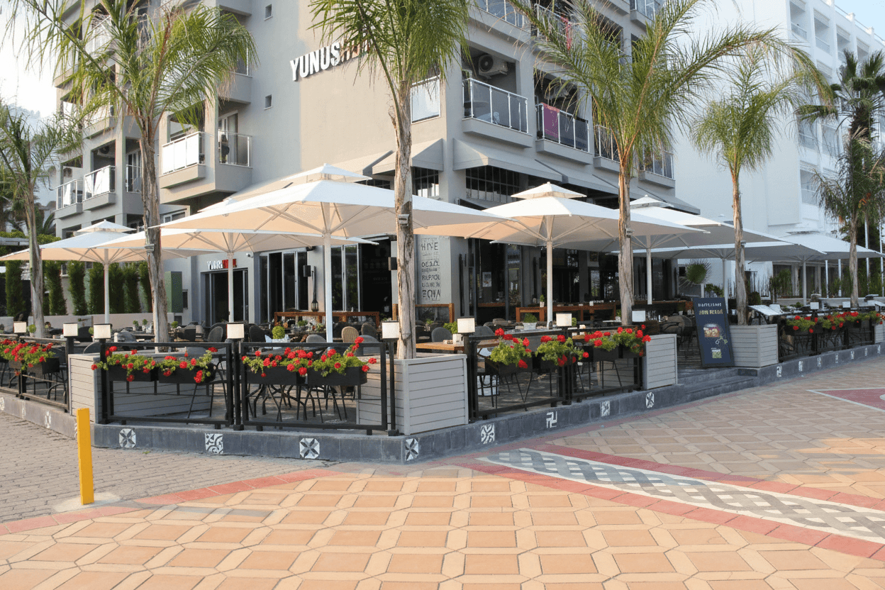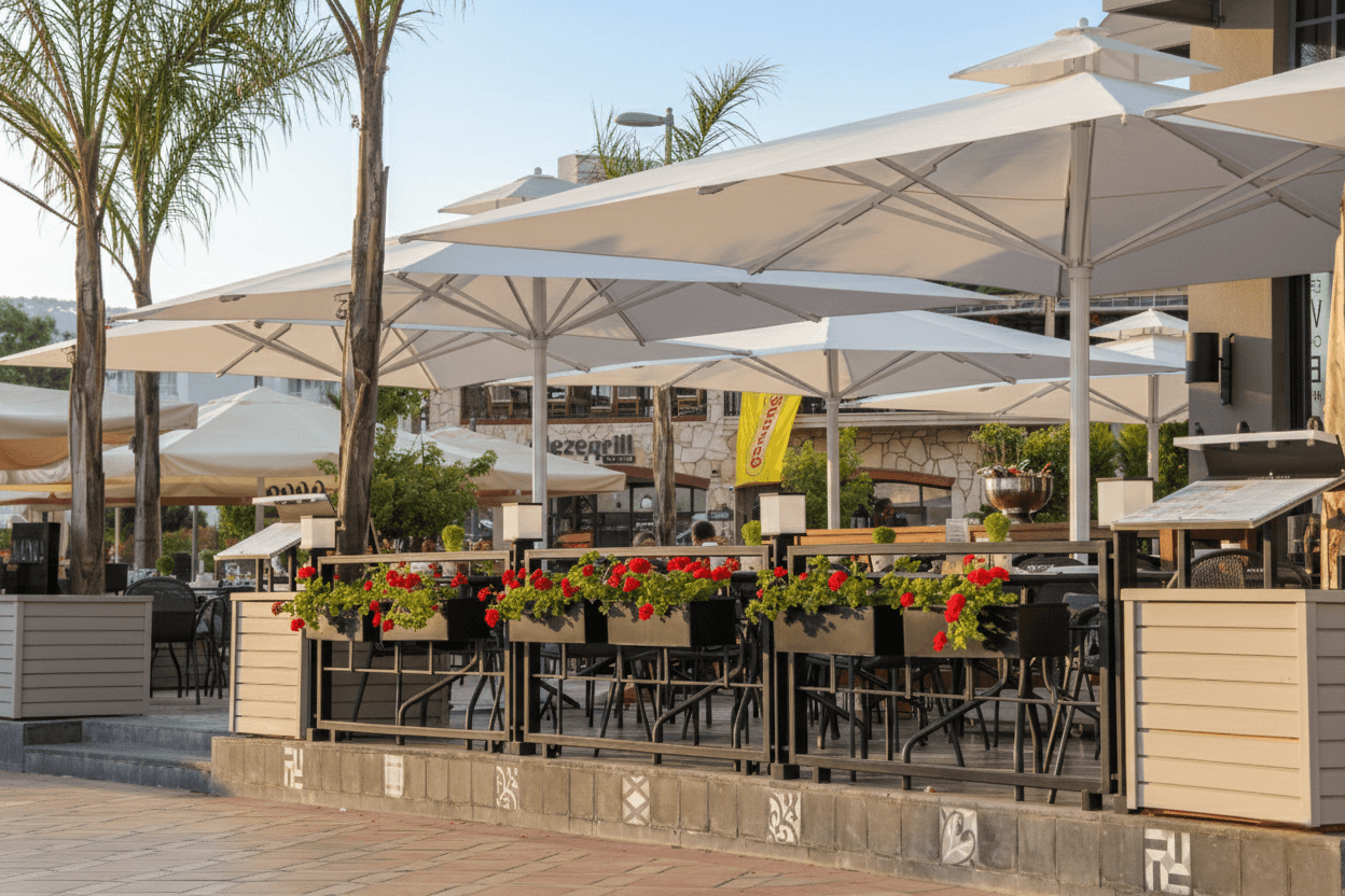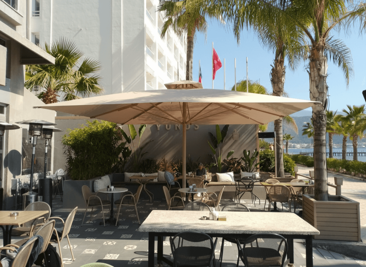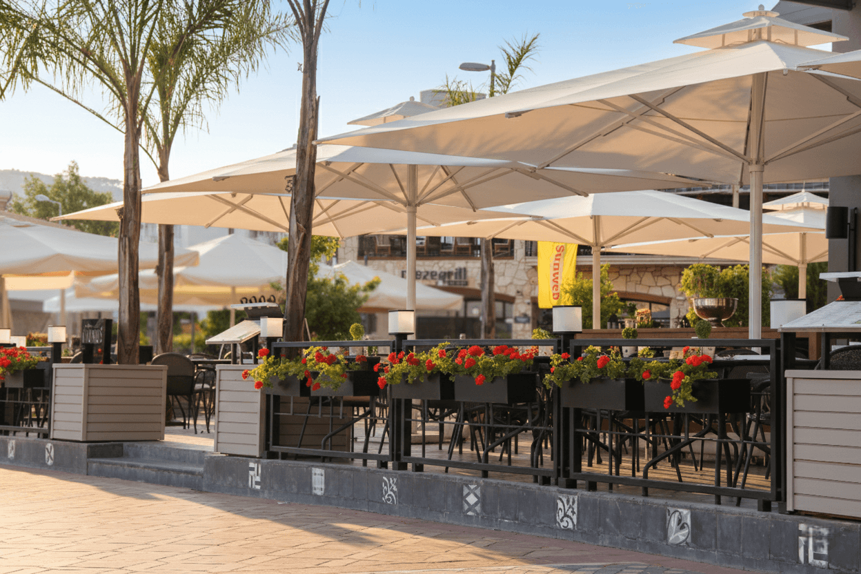 Marmaris sahilinde konumlanan Yunus Otel, misafirlerine denizle iç içe, konfor odaklı bir açık alan deneyimi sunar. Teras ve dinlenme alanlarında tercih edilen 99 Serisi – 400×400 Kare Şemsiye, geniş kare formu sayesinde çoklu oturma düzenlerini tek bir gölgelendirme altında toplayarak ferah, dengeli ve kesintisiz bir kullanım alanı oluşturur. 400×400 ölçüsü, manzarayı bölmeden homojen gölge sağlayarak gün boyu yüksek konfor sunar. 99 mm çapındaki güçlü orta borusu ve tamamen alüminyum taşıyıcı yapısıyla öne çıkan 99 Serisi, büyük açıklıklarda dahi maksimum stabilite sağlar. Teleskopik kapanma mekanizması, şemsiye kapatılırken masa ve mobilyalara temas etmeden pratik bir kullanım sunarken; tepe bölümünde yer alan havalandırma sistemi açık alanlarda dengeli bir hava sirkülasyonu oluşturur. Uzaktan kumandalı açma-kapama ve entegre LED aydınlatma özellikleri, özellikle akşam saatlerinde Yunus Otel’in sahil atmosferini fonksiyonel biçimde tamamlar.